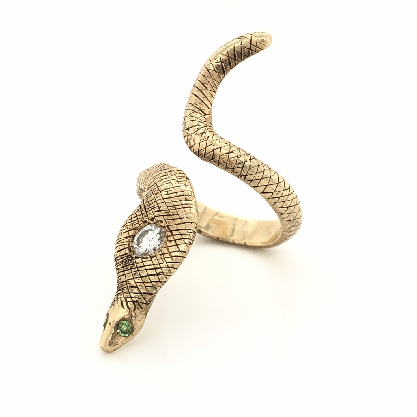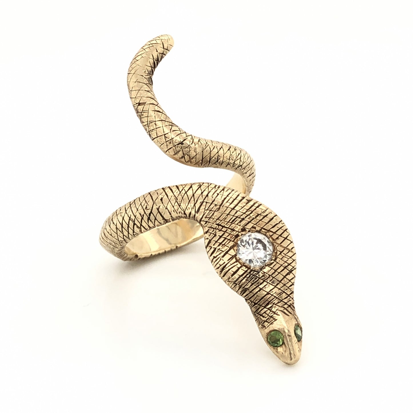 This striking snake ring features a .46 carat Round Brilliant cut diamond and two (2) .25 carat peridots. The cross hatch pattern on the outside of the ring brings life to the snake the imitating scales in 14 karat yellow gold. A statement serpent ring with style.