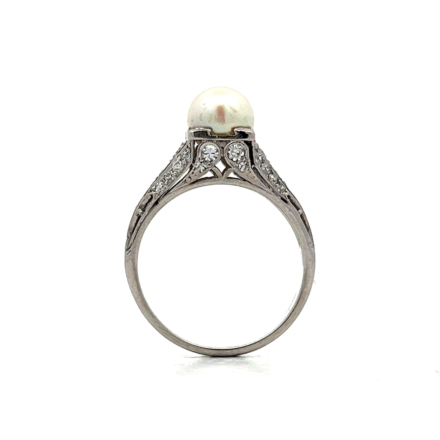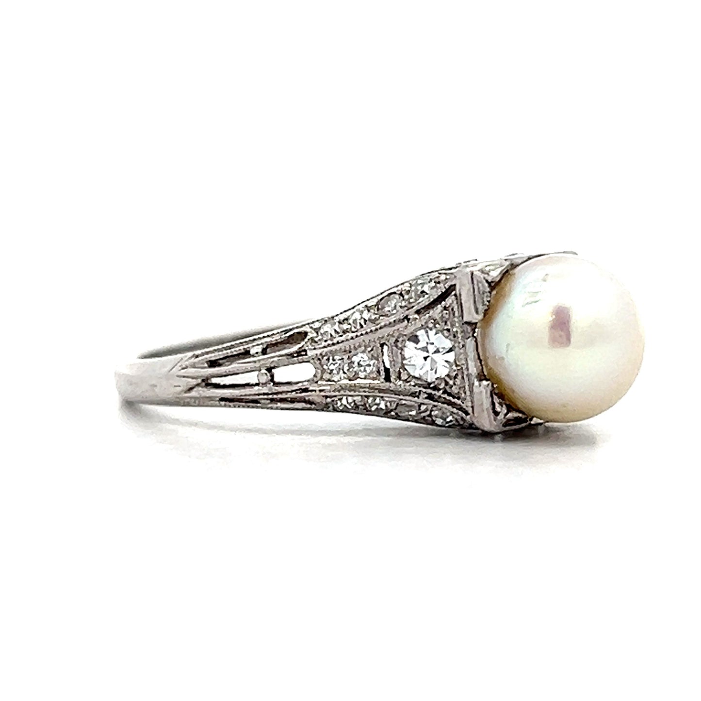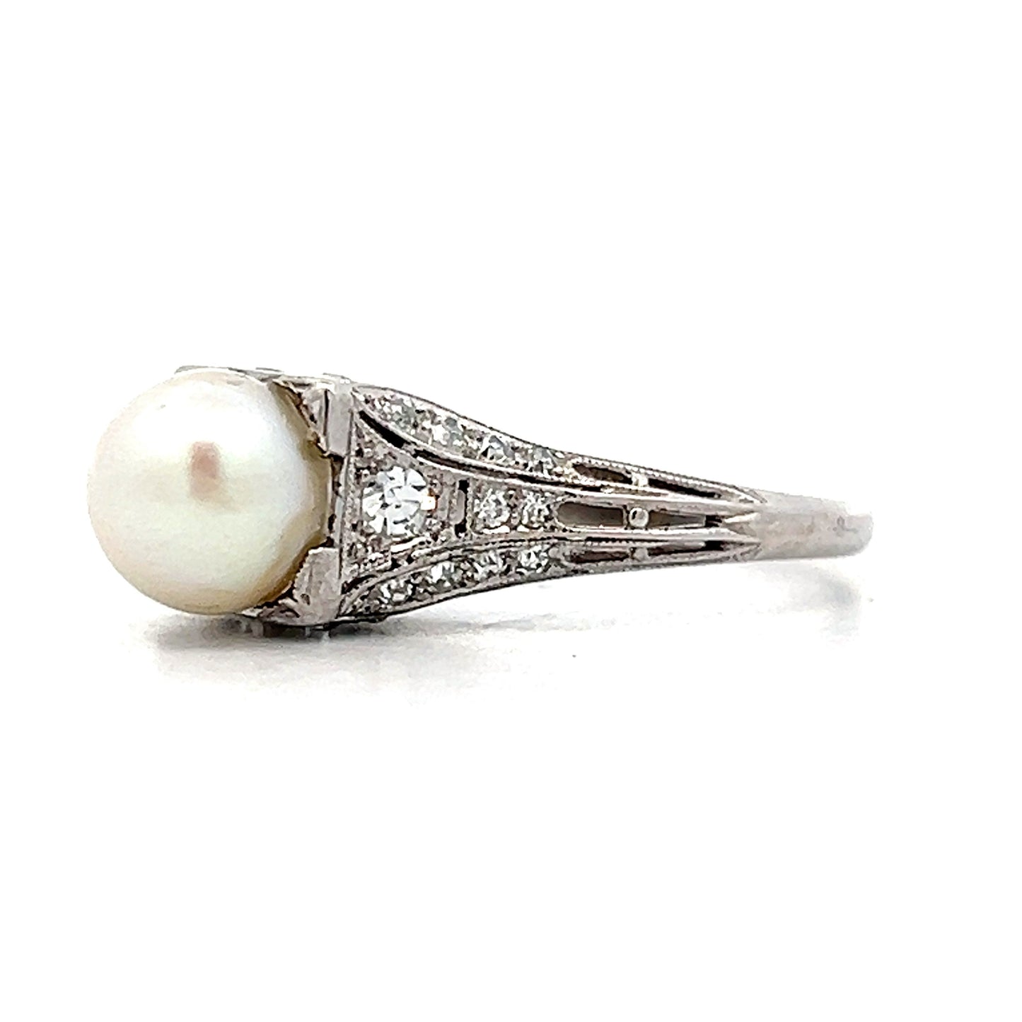This Art Deco cocktail ring features a pearl at its center, surrounded by a beautifully intricate mounting. The design is highlighted by six diamonds—two at 2.25 mm weighing .04 carats each, and four smaller ones at 1.75 mm weighing .02 carats each. These diamonds, with G/H color and VS2 clarity, are expertly placed to add a subtle sparkle, totaling .16 carats. The platinum band is adorned with milgrain details and filigree work, showcasing the craftsmanship of the Art Deco period. This ring is a blend of elegance and history, making it a timeless piece for any occasion.