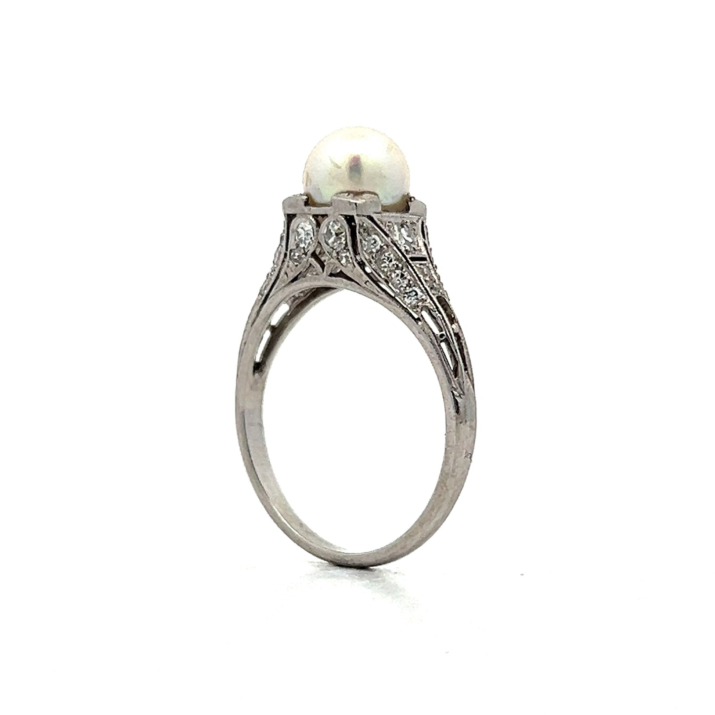 Deco Filigree Pearl & Diamond Cocktail Ring in Platinum