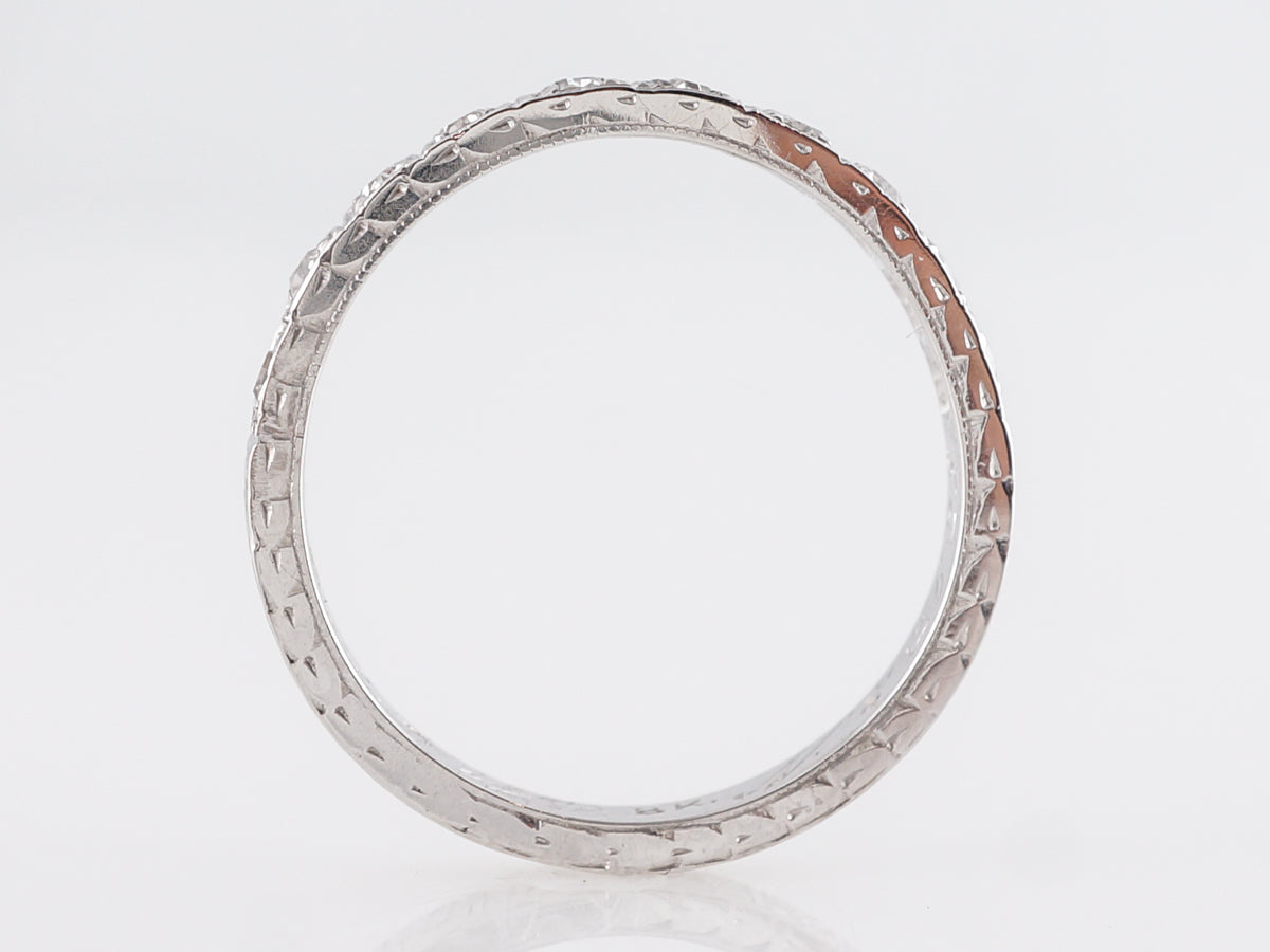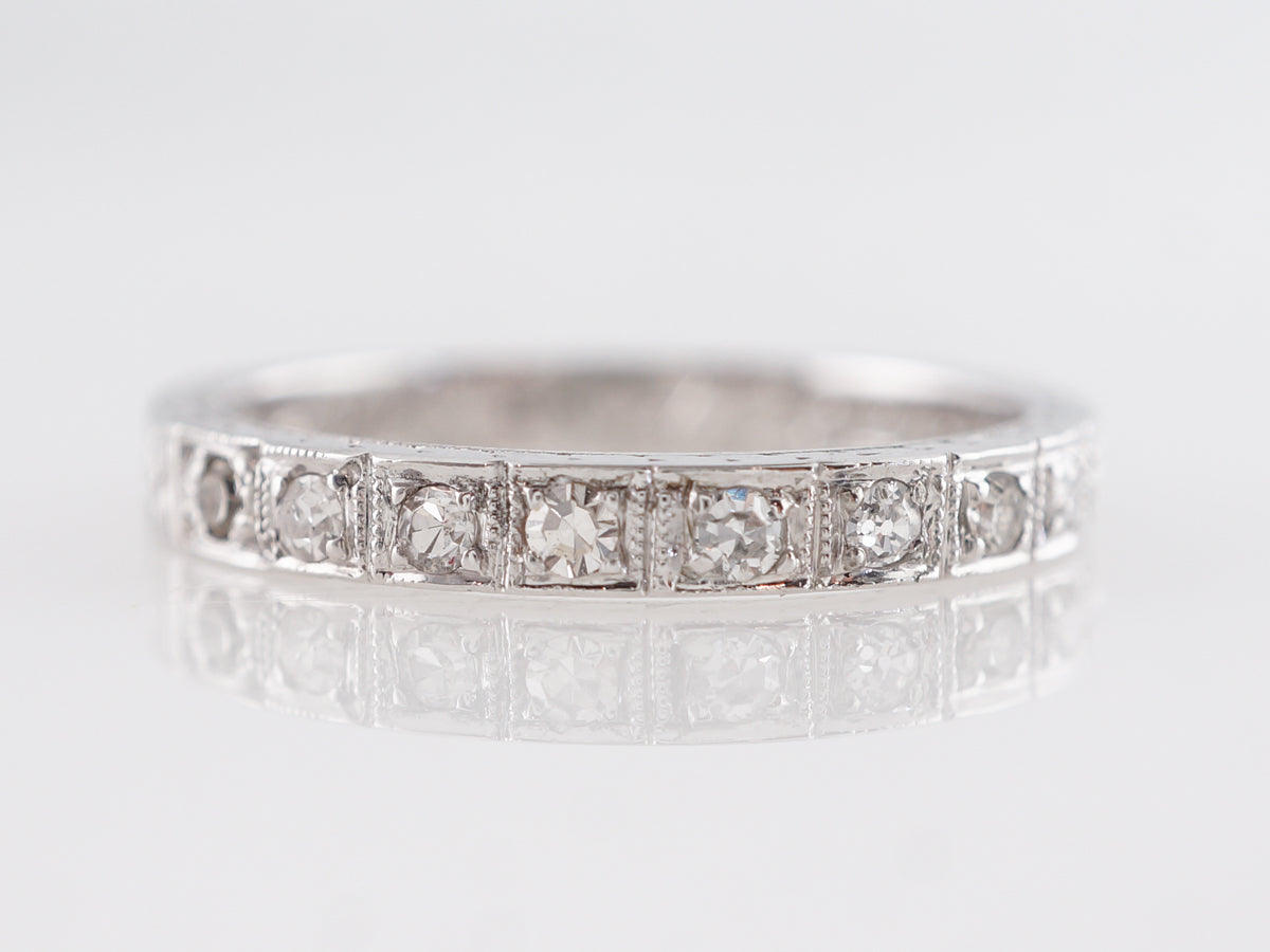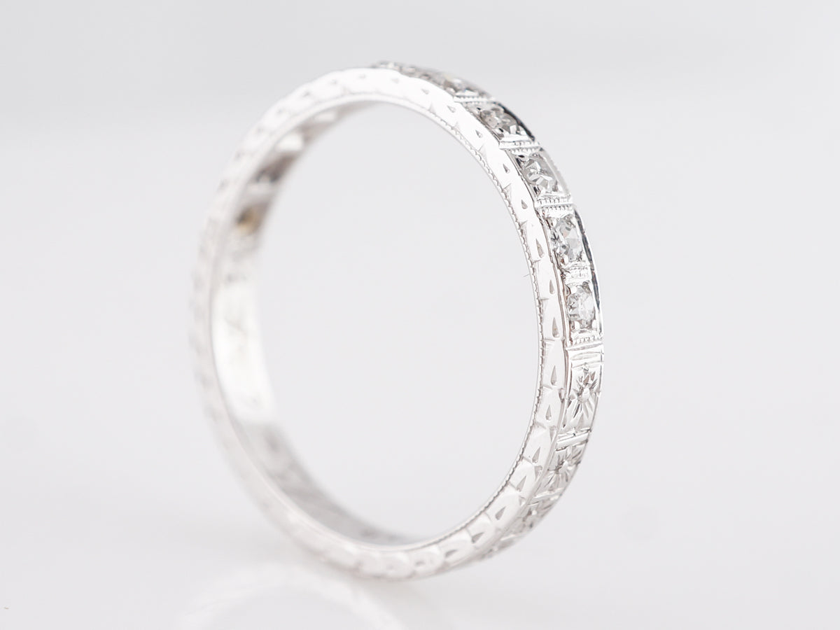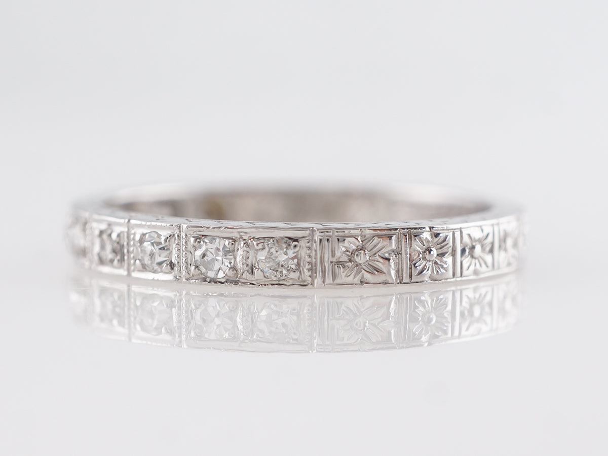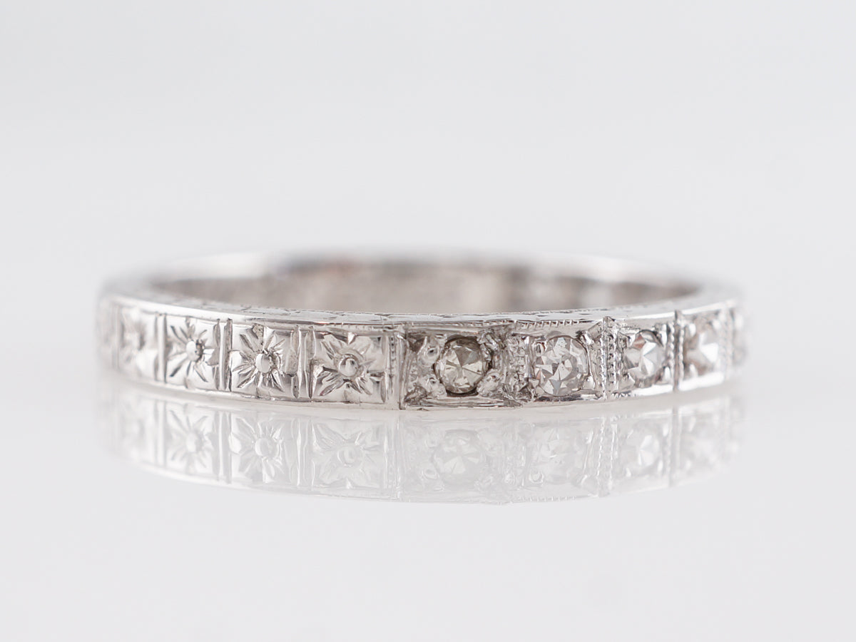 Deco Single Cut Diamond Wedding Band in 18k. This Art Deco wedding band features .20 carats of single cut diamonds and is set in 18 karat white gold. The diamonds are enhanced by milgrain borders in the square sections where they sit, with the bottom half of the ring continuing the square sections with orange blossom engravings. This would be a perfect addition to an Art Deco engagement ring to match periods.