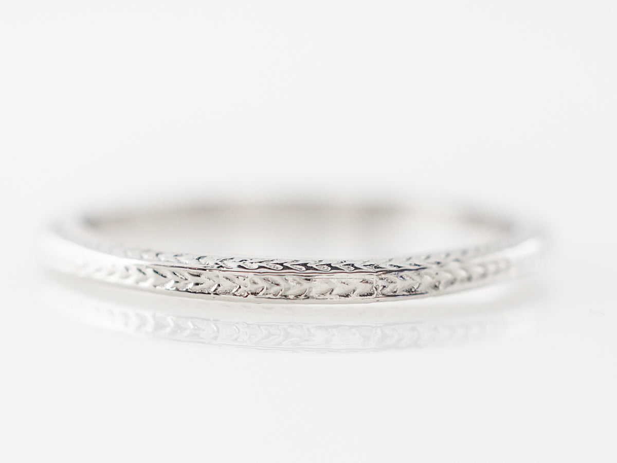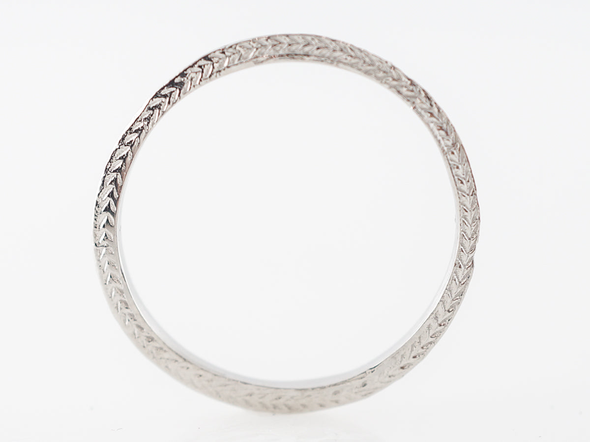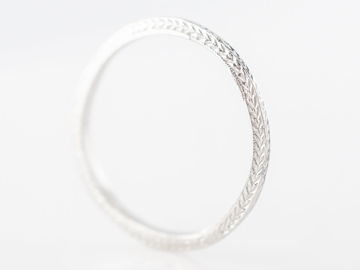 Deco Style Chevron Wedding Band in Platinum. This modern art deco inspired chevron wedding band is finished in platinum. It has three (3) rows of crisp chevron running all the way around the band. The chevron pattern is repeated on the top and bottom of the band. This ring is beautiful from every angle and would go well with an Art Deco engagement ring or a stack of bands.