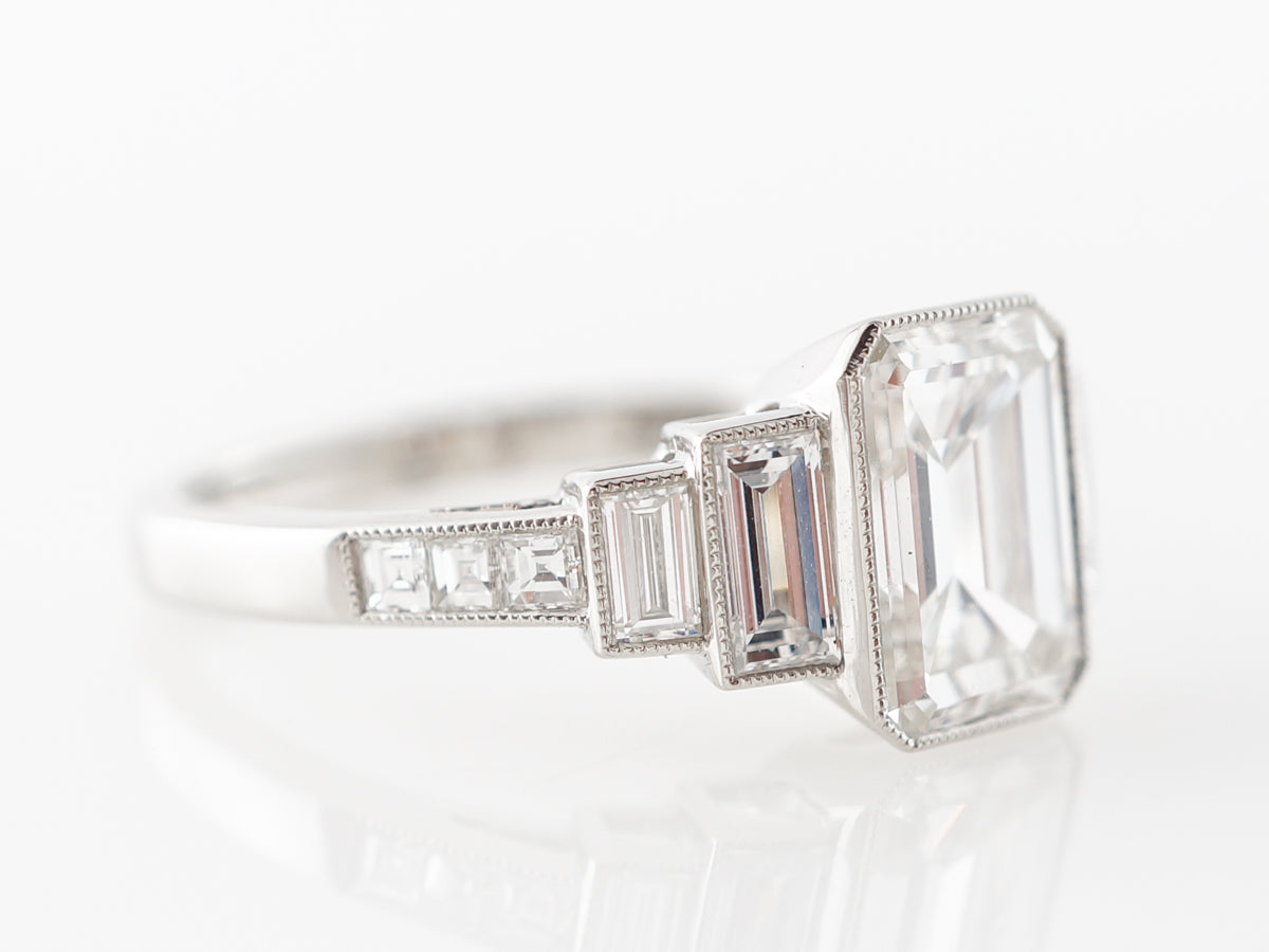 Deco Style Emerald Cut Diamond Engagement Ring in Platinum. This stunning modern engagement ring features a 1.49 carat emerald cut diamond with .87 carats of accent diamonds and is set in platinum. The beautiful center stone is flanked immediately by baguette cut diamonds and ultimately a small row of channel set square cuts. These diamonds are all surrounded by very precise bezels with fine milgrain detail, enhancing the sparkle of each stone. This is a fabulous ring with perfectly executed fine details.