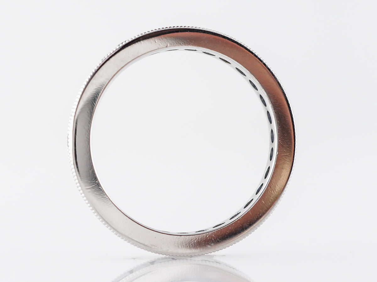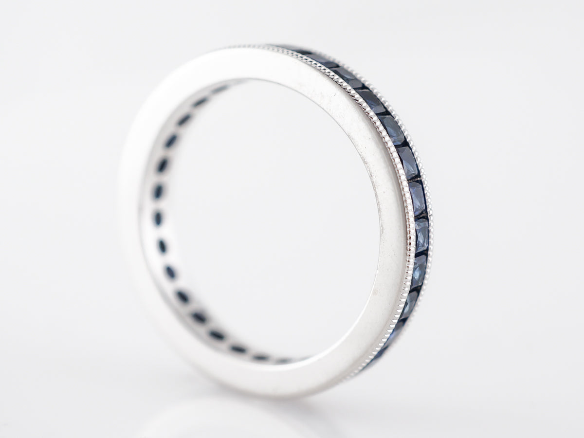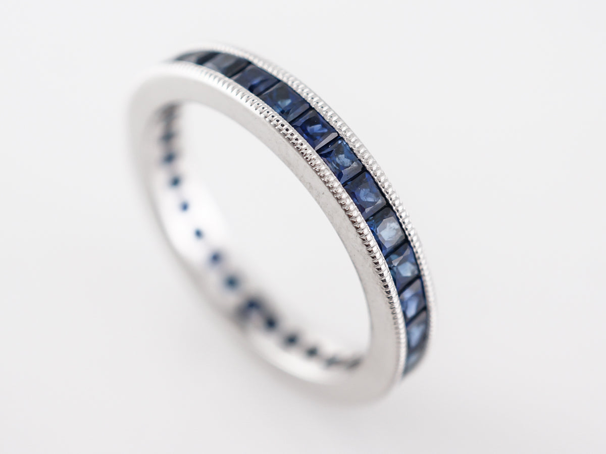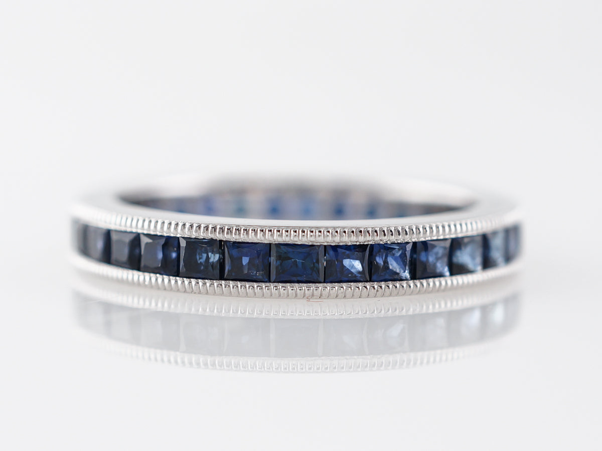 Deco Style Sapphire Band in 14k White Gold. This lovely modern wedding band features 1.65 carats of square cut sapphires set in 14 karat white gold. The sapphires are channel set between borders of fine milgrain detail and are reminiscent of a classic Art Deco style of ring. This would make a fabulous vintage inspired band to pair with a vintage engagement ring or to add some wonderful blue sparkle to your right hand stack!