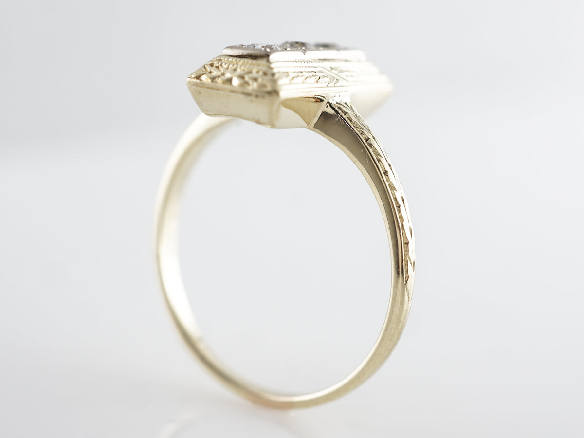 Deco Three Stone Diamond Ring 14k Yellow Gold. This delightful three stone ring features .23 carats of Old European cut diamonds set in platinum inside a 14 karat yellow gold mounting. The diamonds are each prong set in square milgrained sections that are further bordered by lovely engravings in the yellow gold. The beautiful scrolling engravings continue down the shoulders, completing this amazing vintage piece.