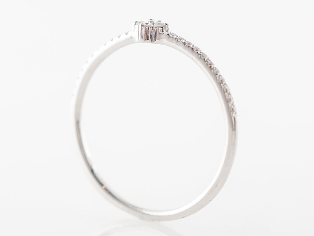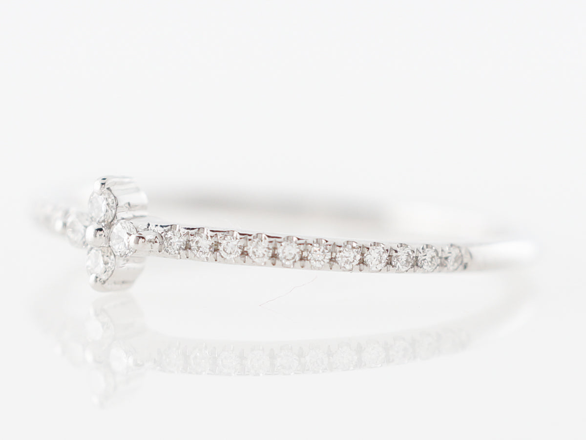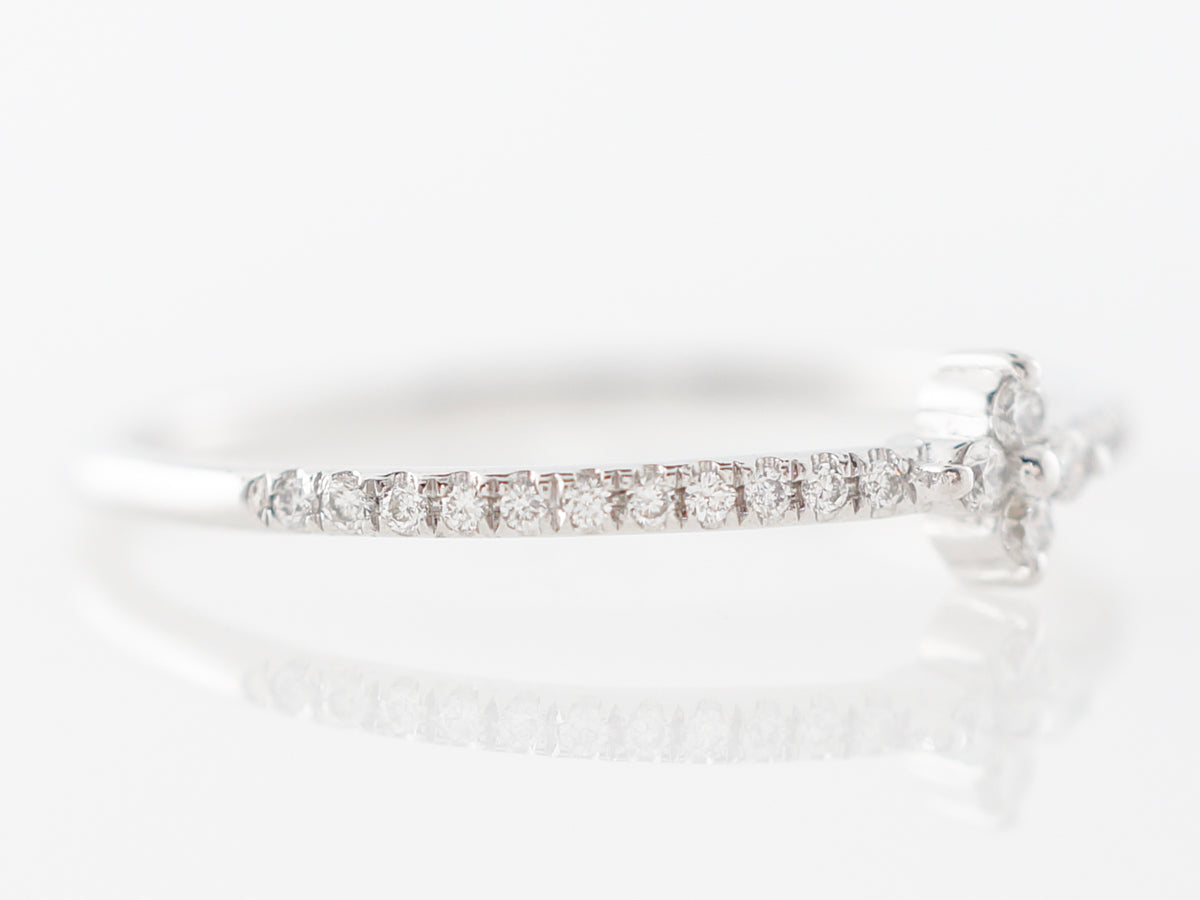 Delicate Diamond Right Hand Ring in White Gold. This diamond right hand ring is finished in 18 karat white gold. This is a very delicate ring and features twenty-six (26) .003 carat round brilliant cut diamonds. At the center of the ring four (4) of the diamonds are slightly raised and bead set in a diamond shape together. This ring would be perfect for stacking or simply sparkling alone.