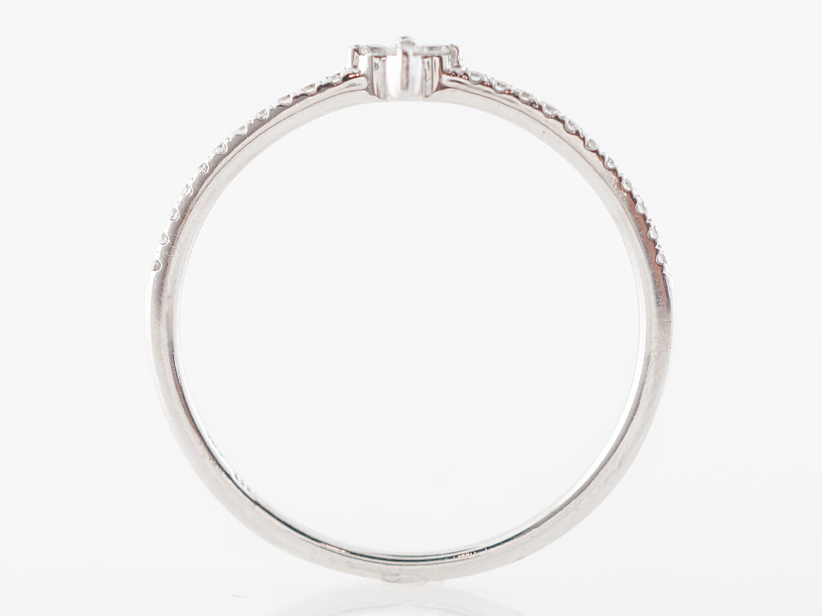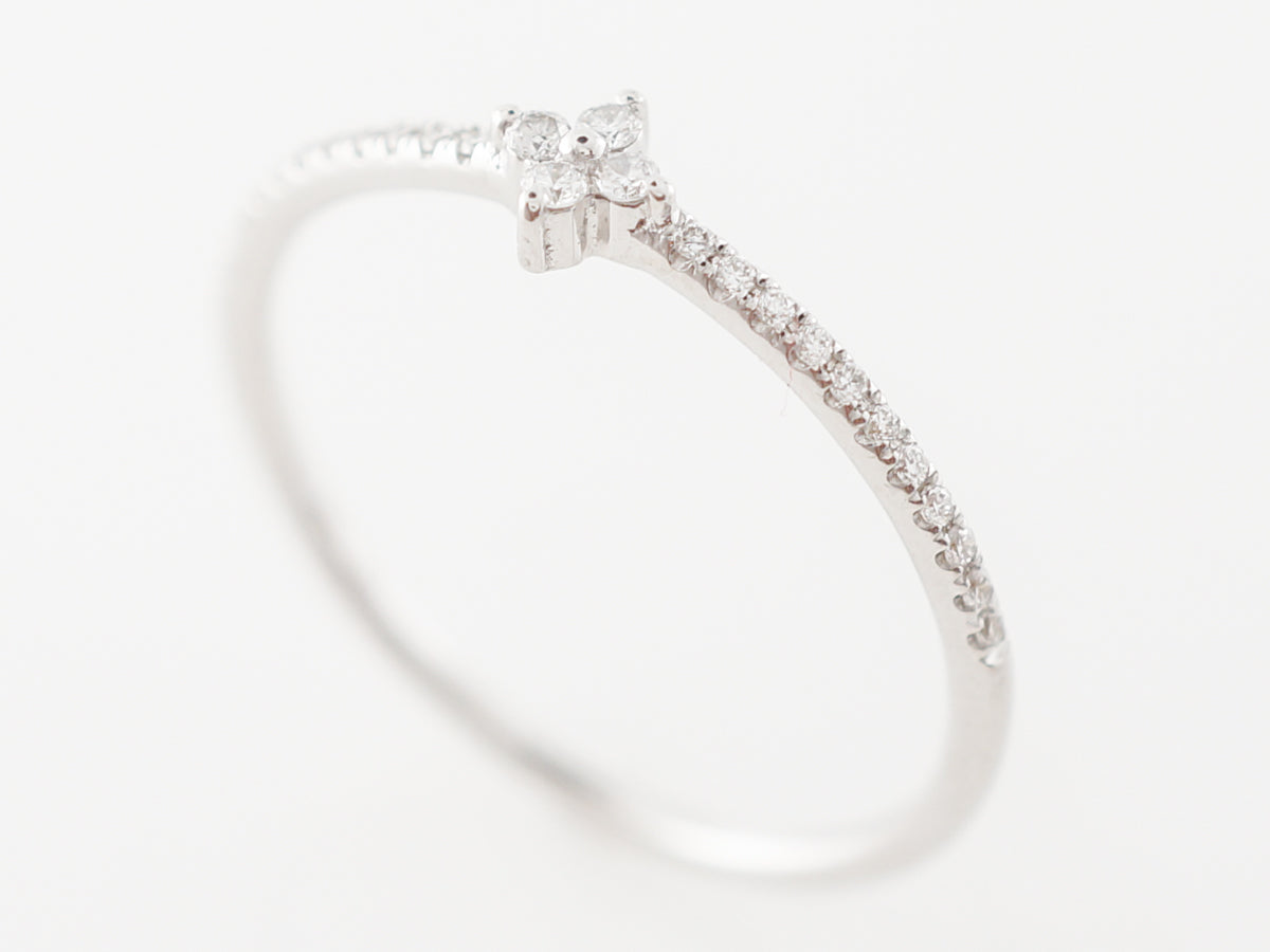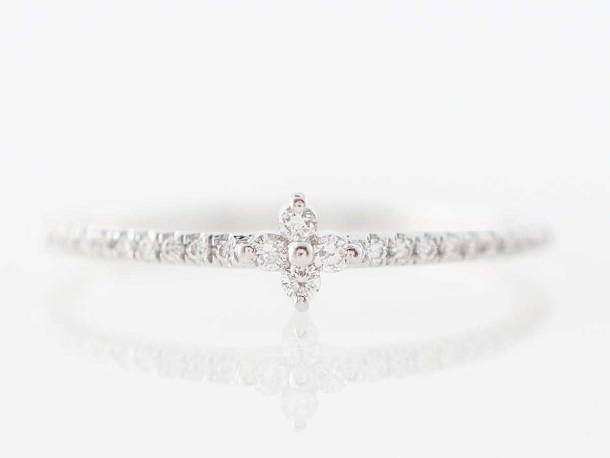 Delicate Diamond Right Hand Ring in White Gold. This diamond right hand ring is finished in 18 karat white gold. This is a very delicate ring and features twenty-six (26) .003 carat round brilliant cut diamonds. At the center of the ring four (4) of the diamonds are slightly raised and bead set in a diamond shape together. This ring would be perfect for stacking or simply sparkling alone.