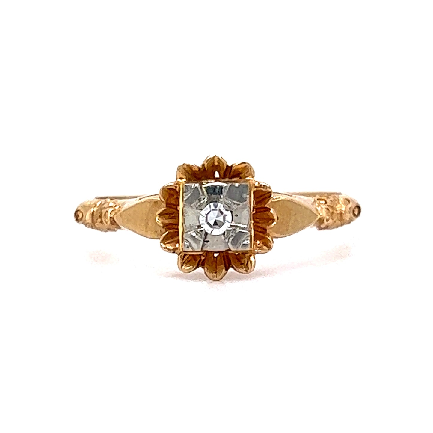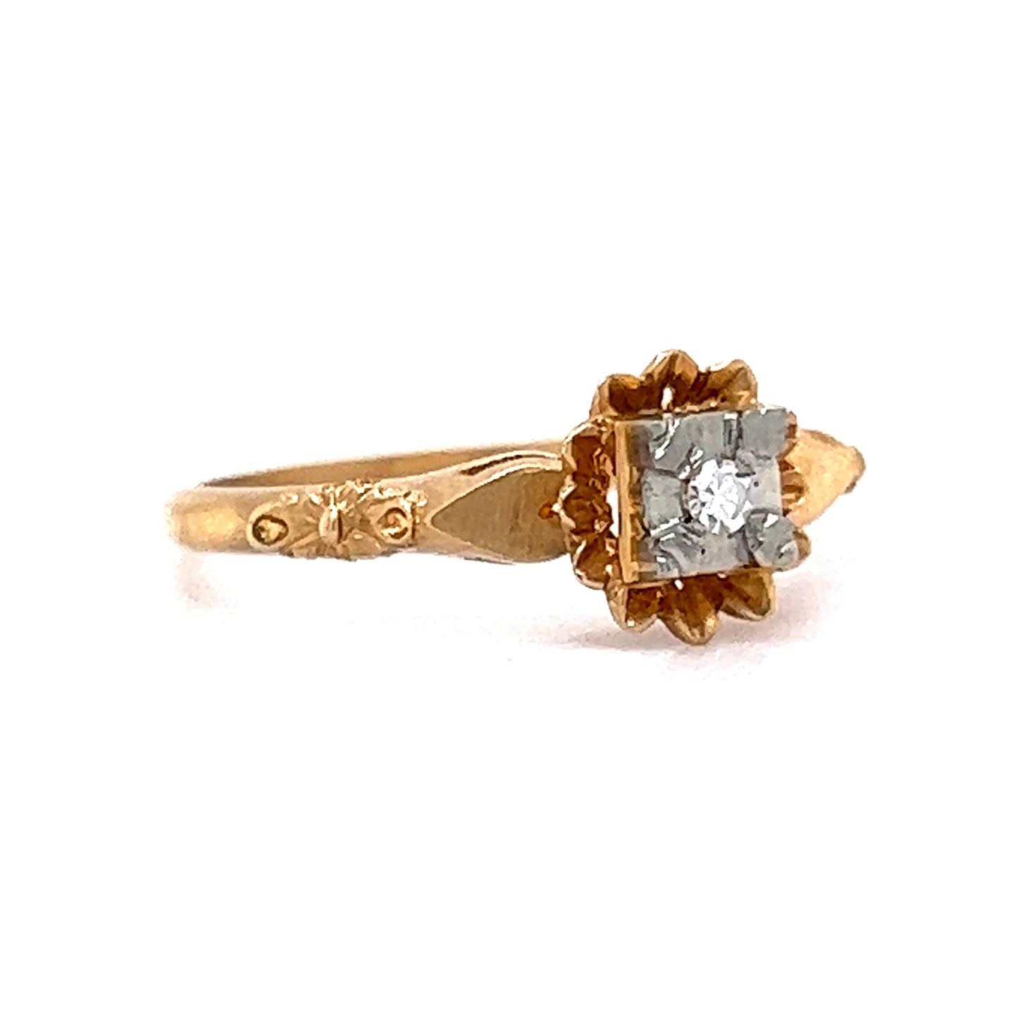 This lovely Retro engagement ring features a .04 carat single cut diamond in 14 karat yellow gold and 18 karat white gold. A structured white gold illusion mounting gives the ring a geometric and modern feel. A flower petal engraving in 14 karat yellow gold opens to reveal the face of the ring. From the profile, Retro floral motifs stretch over the shoulders of the band. Dainty and romantic. Shop more Antique Vintage Engagement Rings.