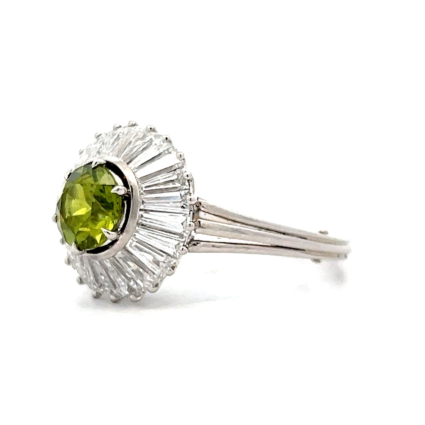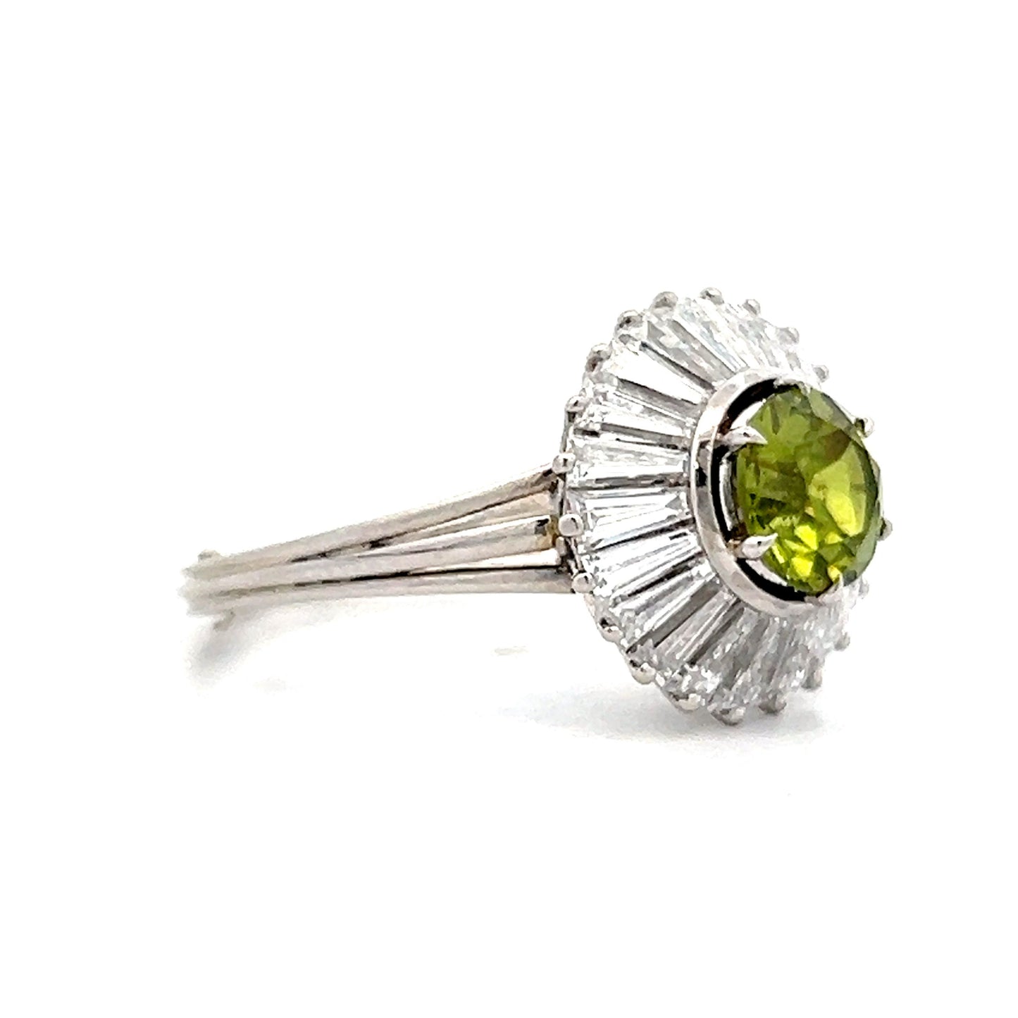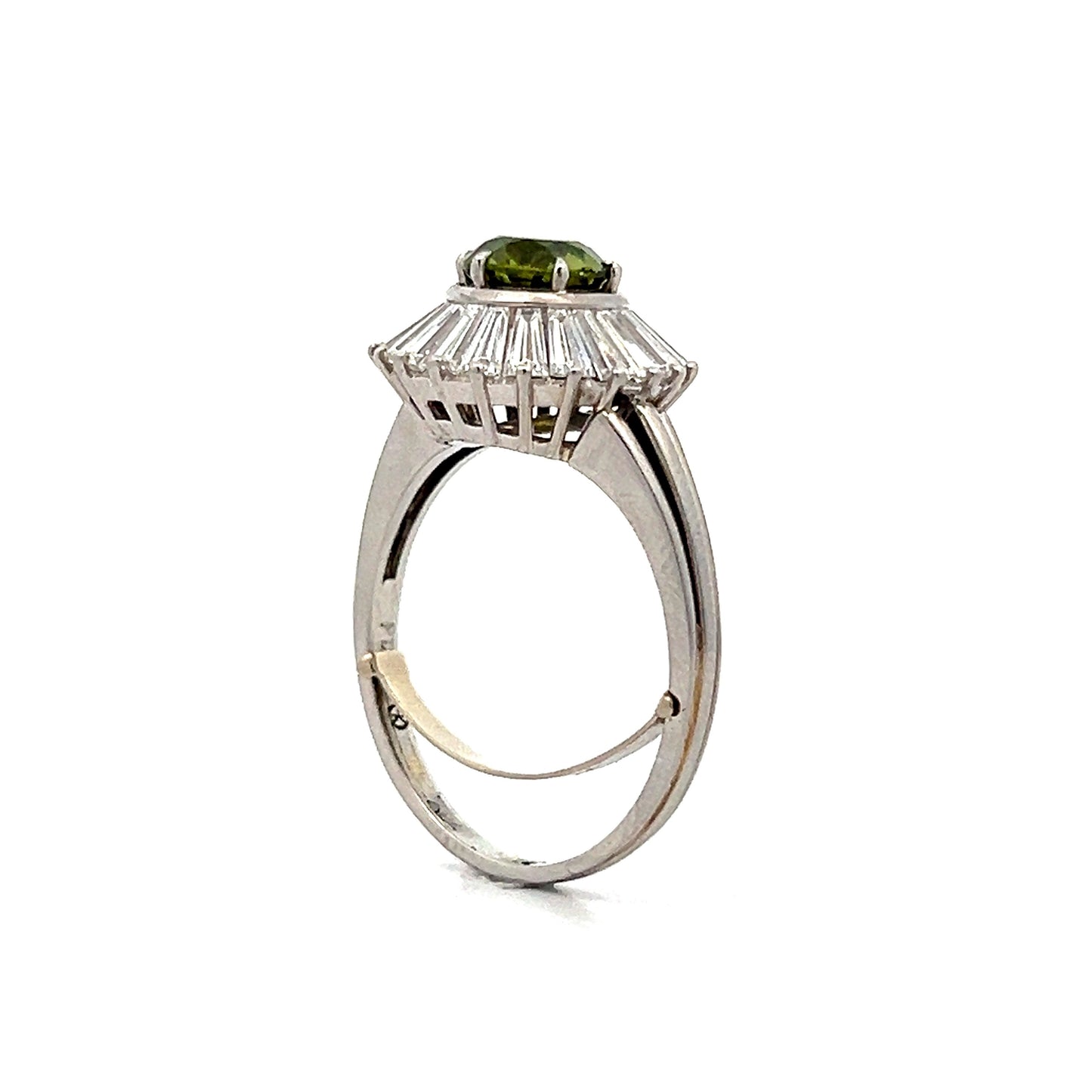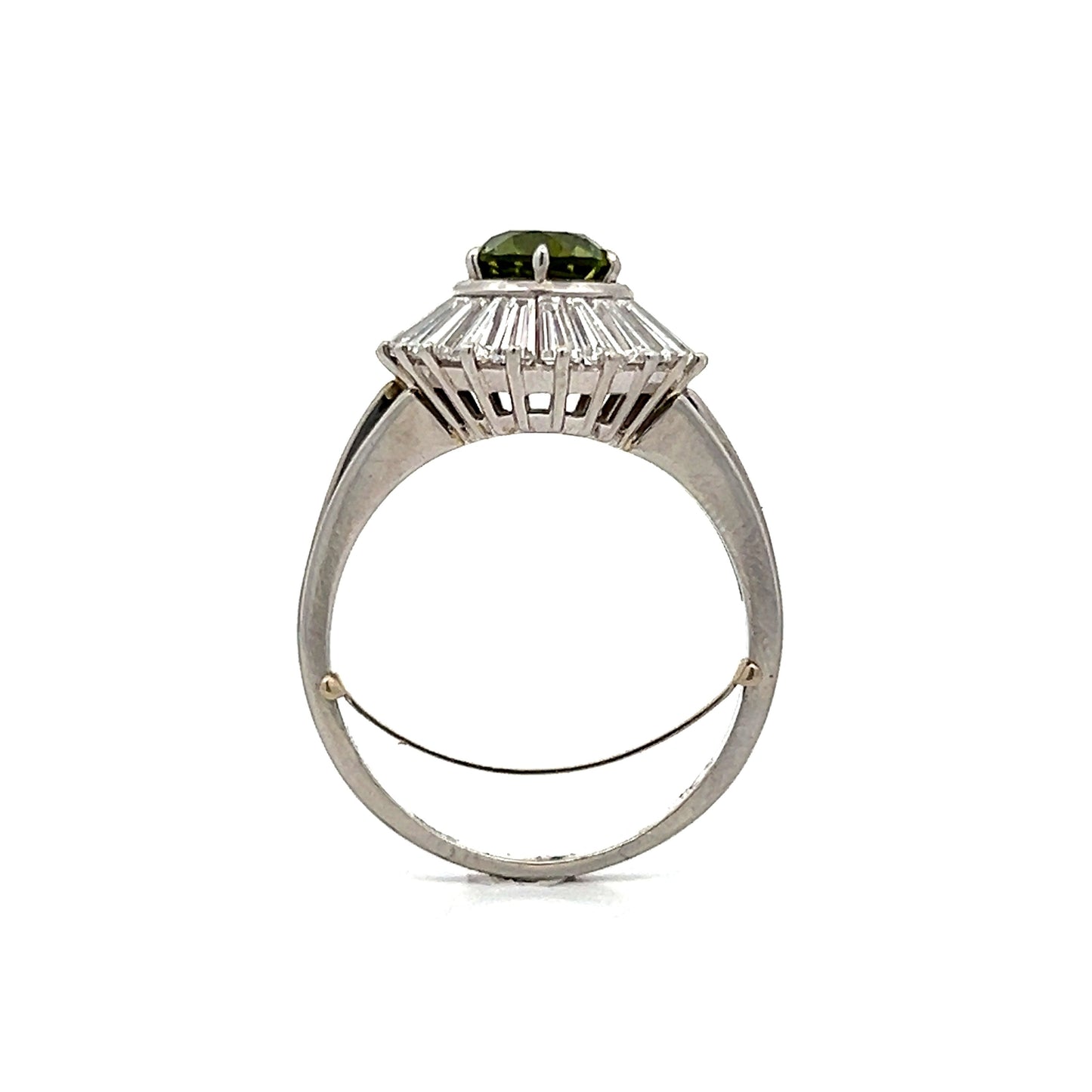 This exquisite cocktail ring is a celebration of modern design and floral elegance. The centerpiece is a vibrant 1.36-carat round cut Demantoid Garnet, set securely in six prongs, showcasing its brilliant green hue. Surrounding the center gemstone are twenty-three tapered baguette diamonds, forming a halo that enhances the floral motif. Each diamond measures 3.00 x 2.50 x 2.00 mm and collectively weighs 2.00 carats, adding a breathtaking sparkle. The ring is crafted from platinum, and the adjustable shank ensures a comfortable fit. This ring is perfect for any glamorous event, promising to be a show-stopper.