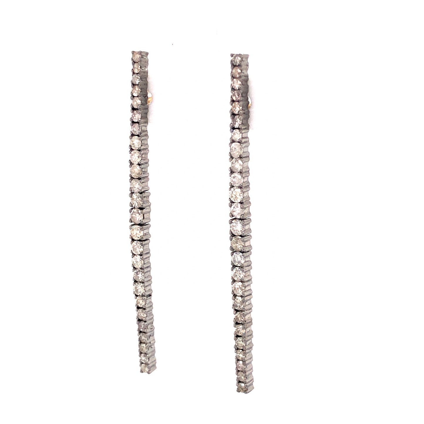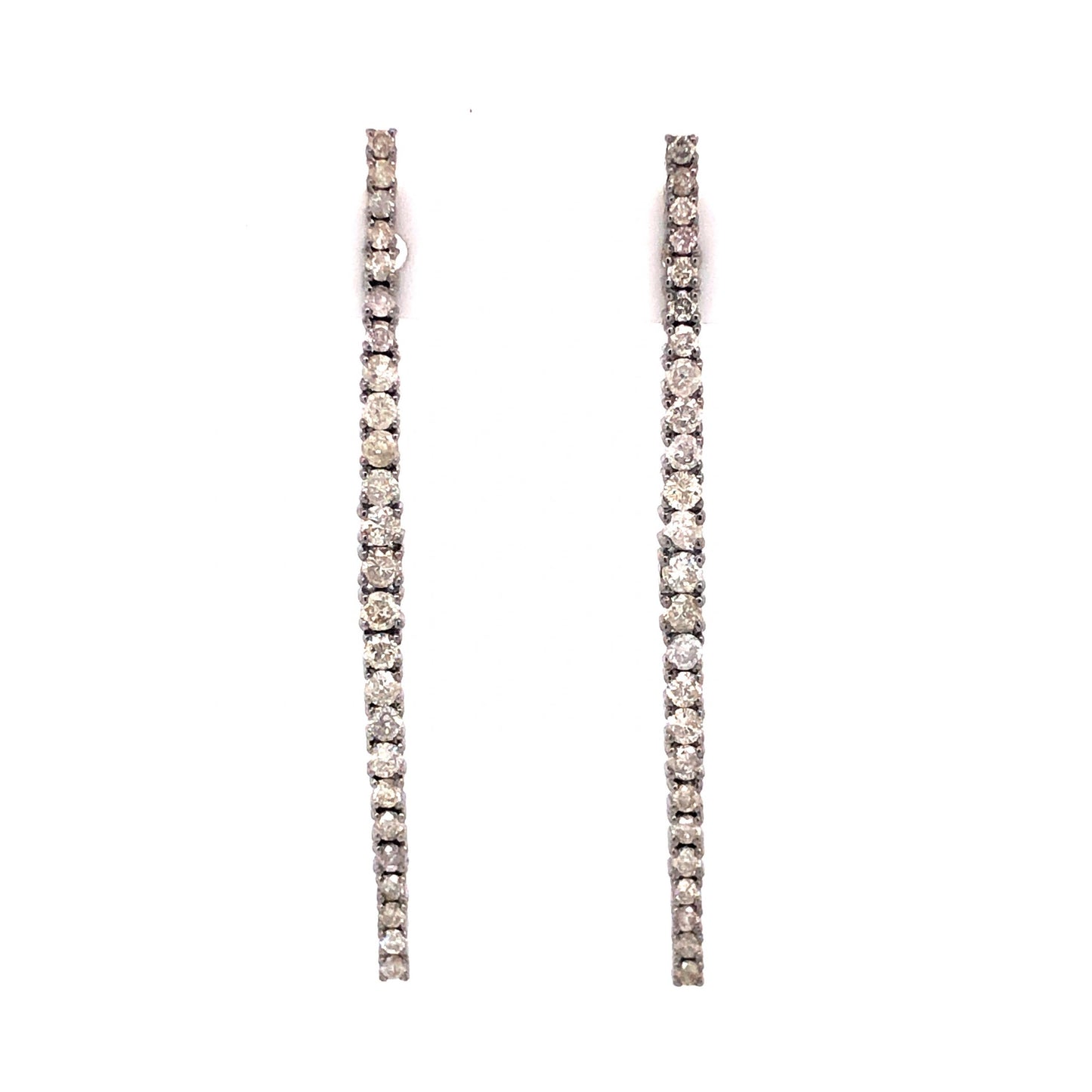 An elegant accessory to accentuate any neckline, these diamond bar drop earrings are structured and stylish. The collection of diamonds have an icy grey hue and are set in sterling silver. The drops feature 14 karat yellow gold posts (perfect for sensitive ears) and measure 2 inches long. With a total diamond weight of 1.26 carats, these modern diamond drops are a fabulous set of earrings to wear for a special event!