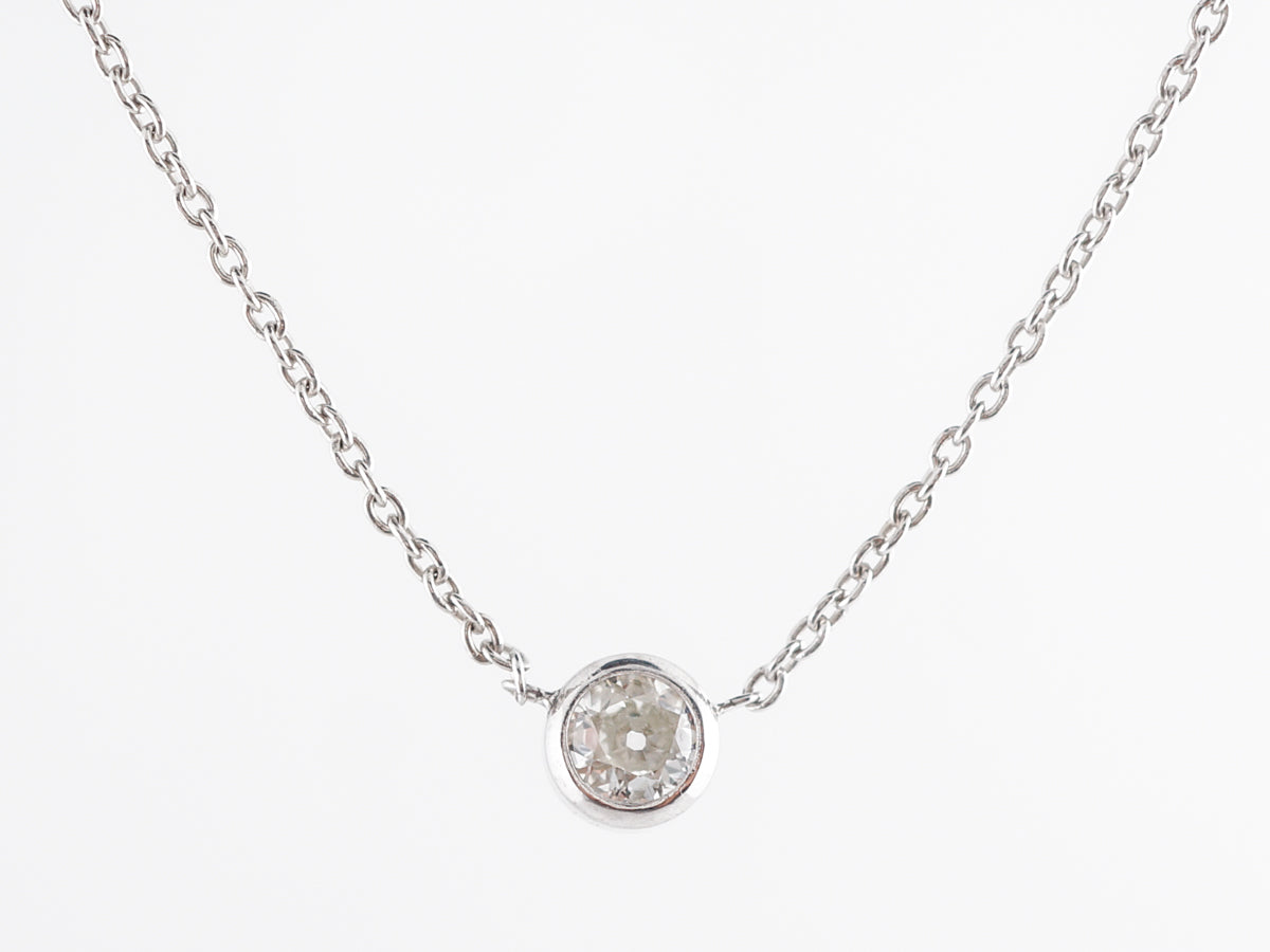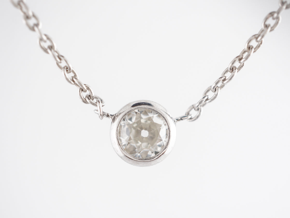 Diamond Bezel Necklace in 14K White Gold. This simple diamond bezel necklace features a .65 Old European cut diamond set in 14 karat white gold. The smooth polish of the white gold bezel make this a charming necklace that would be a perfect gift for a loved one.