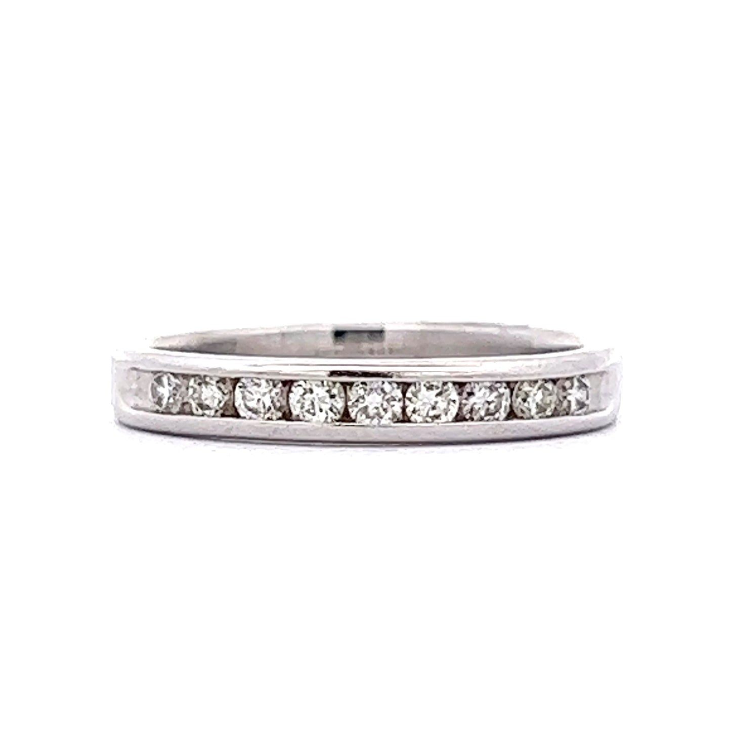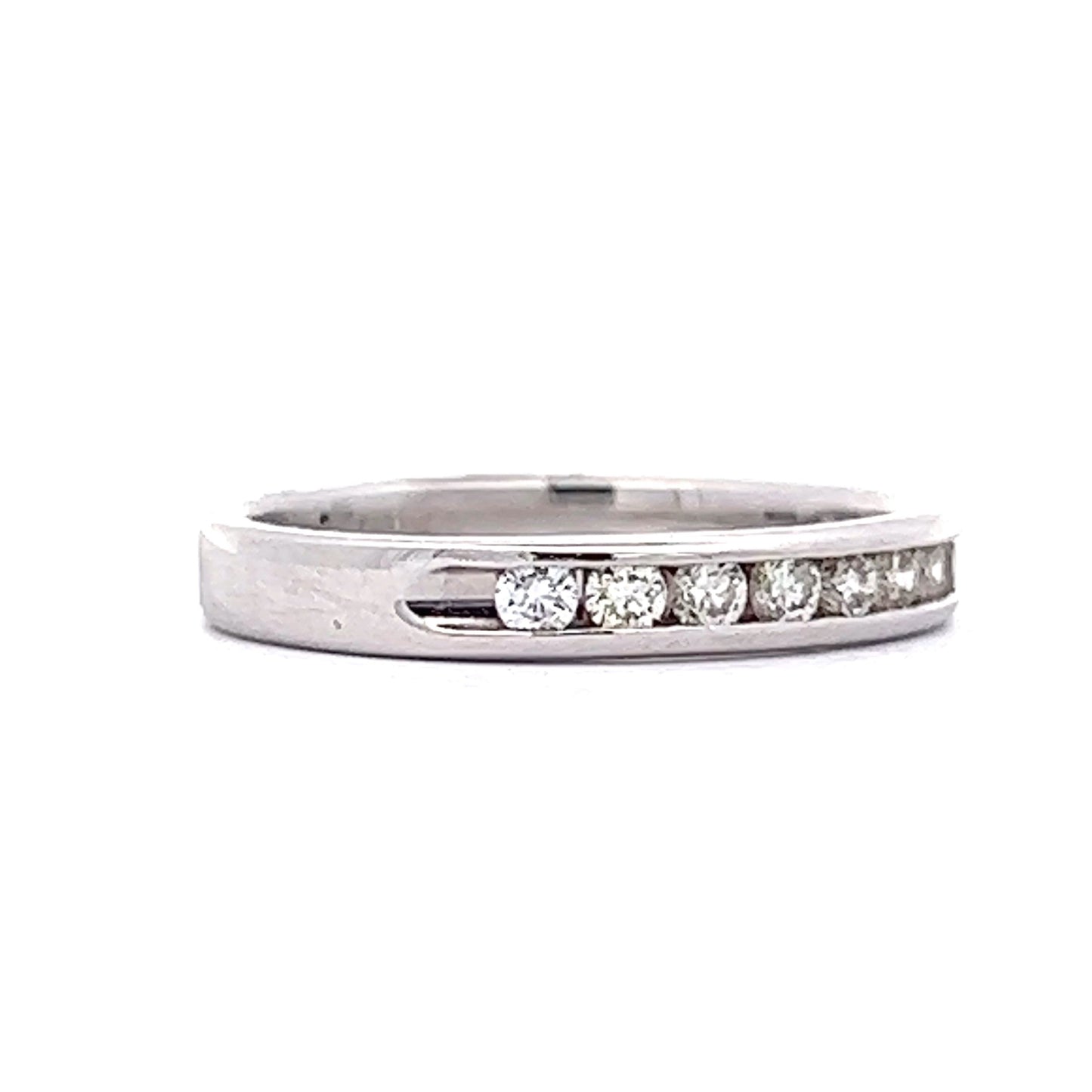 Channel Set Diamond Wedding Band in 14k White Gold. This sleek Modern wedding band is cast in 14 karat white gold and has .27 carats of channel set diamonds for a clean, contemporary look. This wedding band would look great with many of our diamond engagement rings and would also be excellent paired with other diamond bands if you are going for a less traditional look or working on a right hand stack.