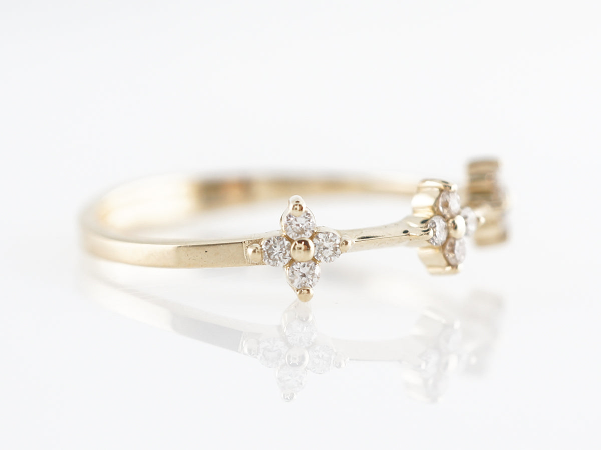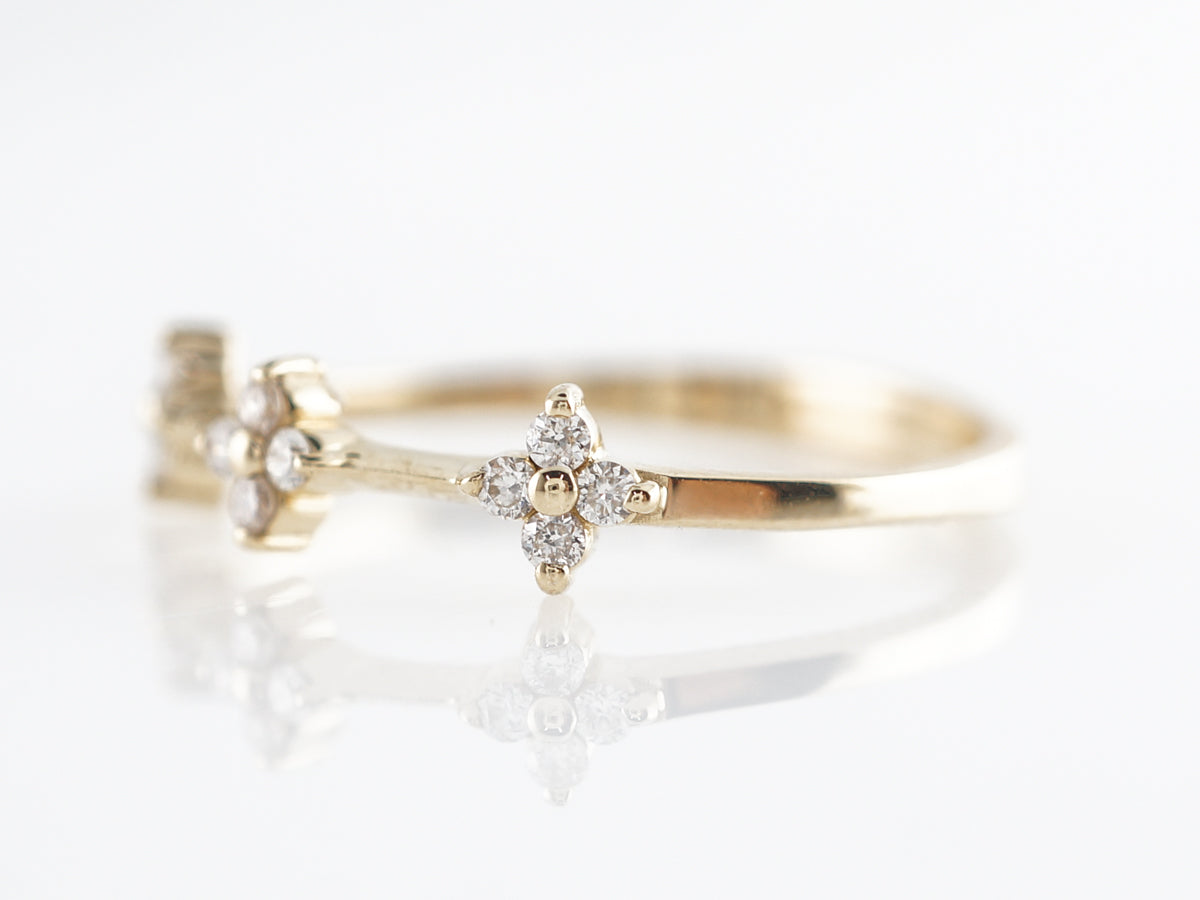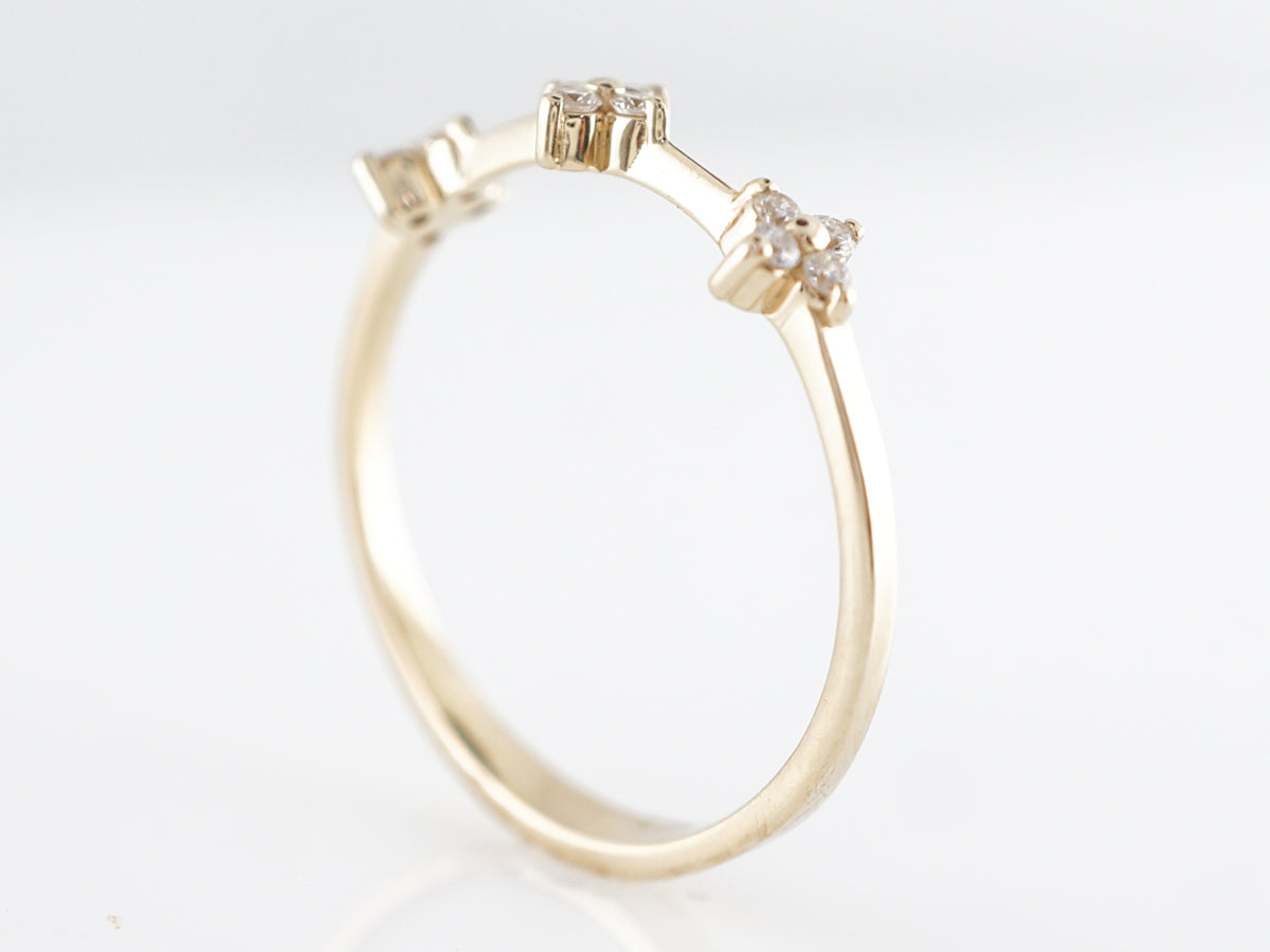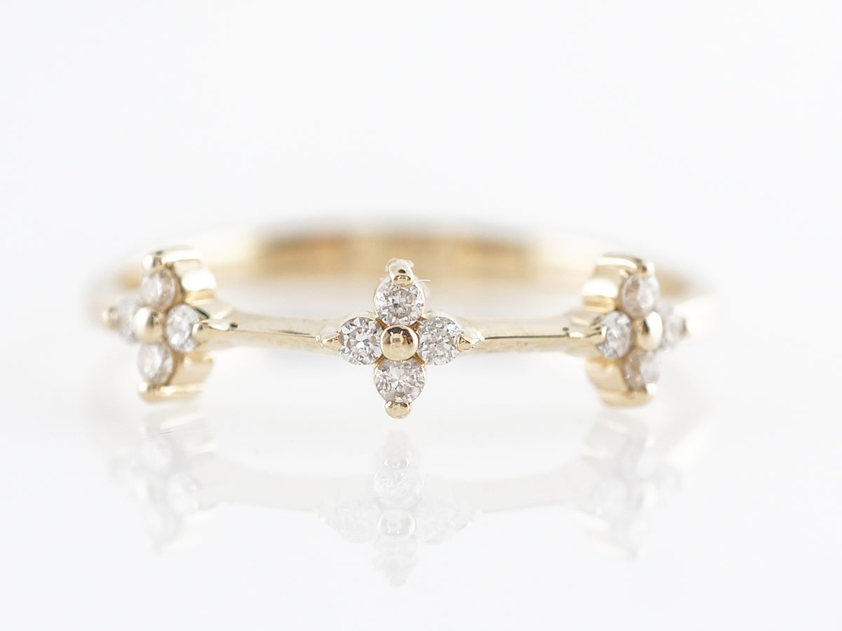Diamond Cluster Band in 14k Yellow Gold. This modern diamond cluster ring has a very elegant design containing .10 carats of round brilliant diamonds in 14 karat yellow gold. The thin shank allows each diamond cluster to jump out and shine. This band would be a great brush of sparkle to a ring stack or as a stand alone right hand ring!