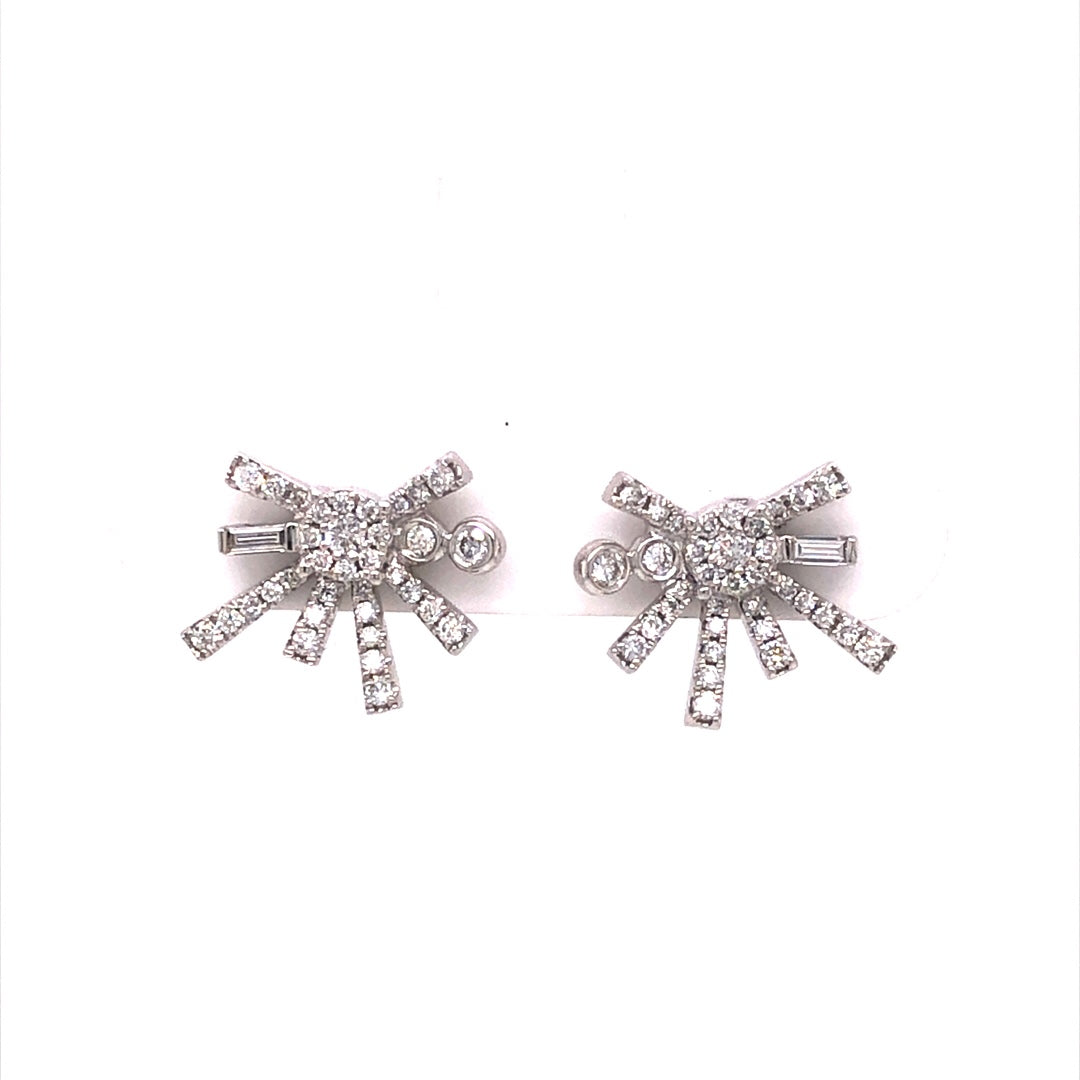 These dynamic modern cluster stud earrings feature .35 total carats of diamonds in 18 karat white gold. A pave of sixty-eight (68) Round Brilliant cut diamonds jut out from the center studs. A mixture of Round Brilliants and two baguette diamonds are crafted together for brilliance and fire, set in a structural sunburst pattern. Dazzling elegant. The perfect set of studs for a celebration or evening out!