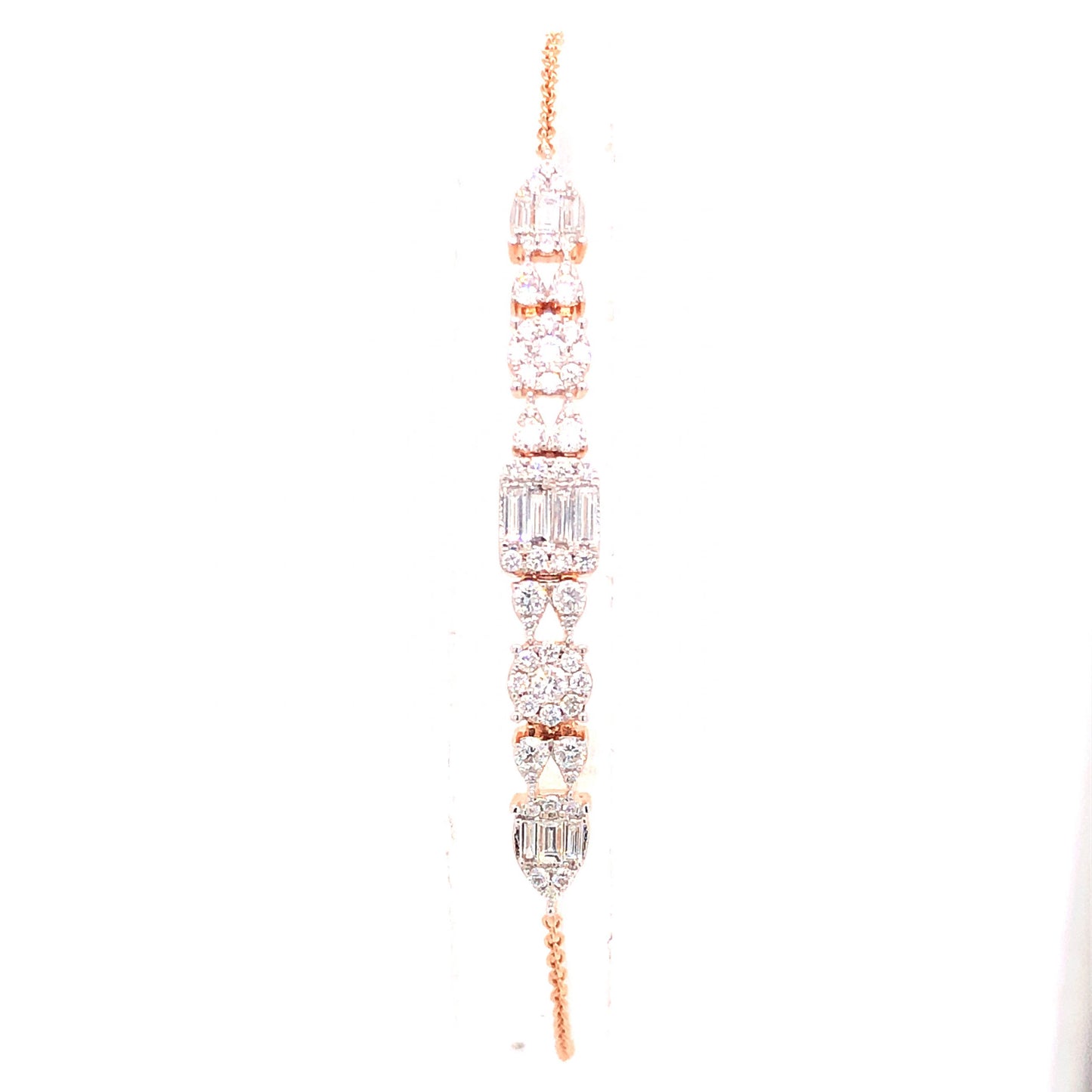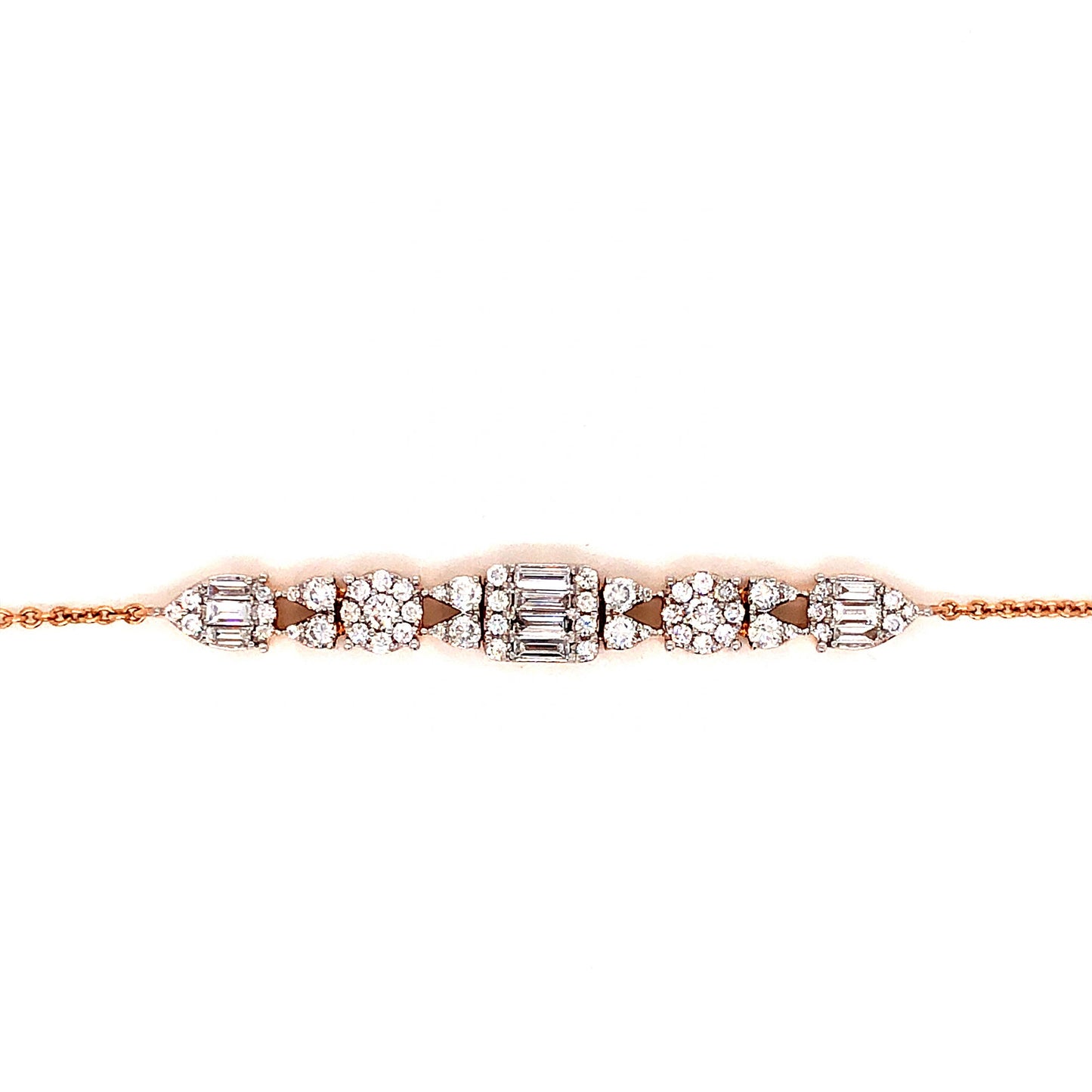 This lovely 7” diamond bracelet features .86 carats of near colorless diamonds finished in radiant 18 karat rose gold. Four (4) .035 carat baguette diamonds are set together as the centerpiece. Six (6) .021 carat round cut diamonds punctuate each shapely cluster. Ten (10) .03 carat and forty-four (44) .0066 carat diamonds complete the bracelet, each meticulously designed to form beautiful collected patterns. The balance of rounded and boxy clusters of diamonds are finished on a warm 18k rose gold chain bracelet. Wear this bracelet on its own or pair with some bangles or tennis bracelets for a modern, stacked look!