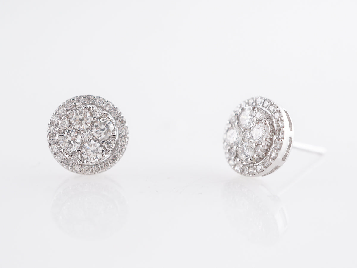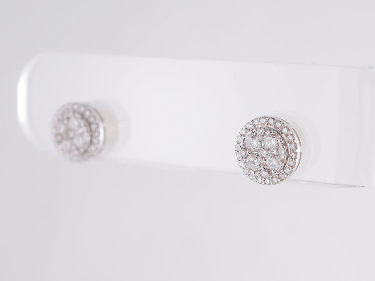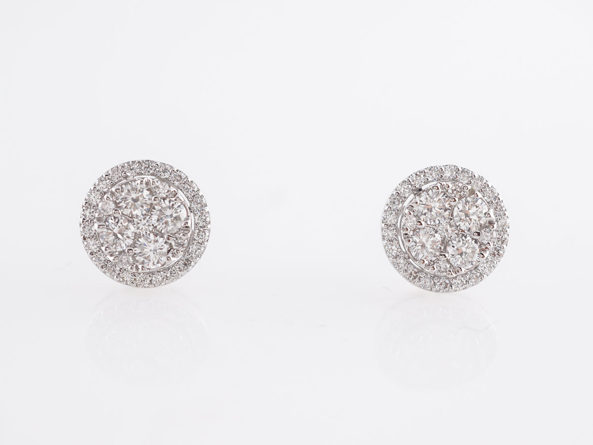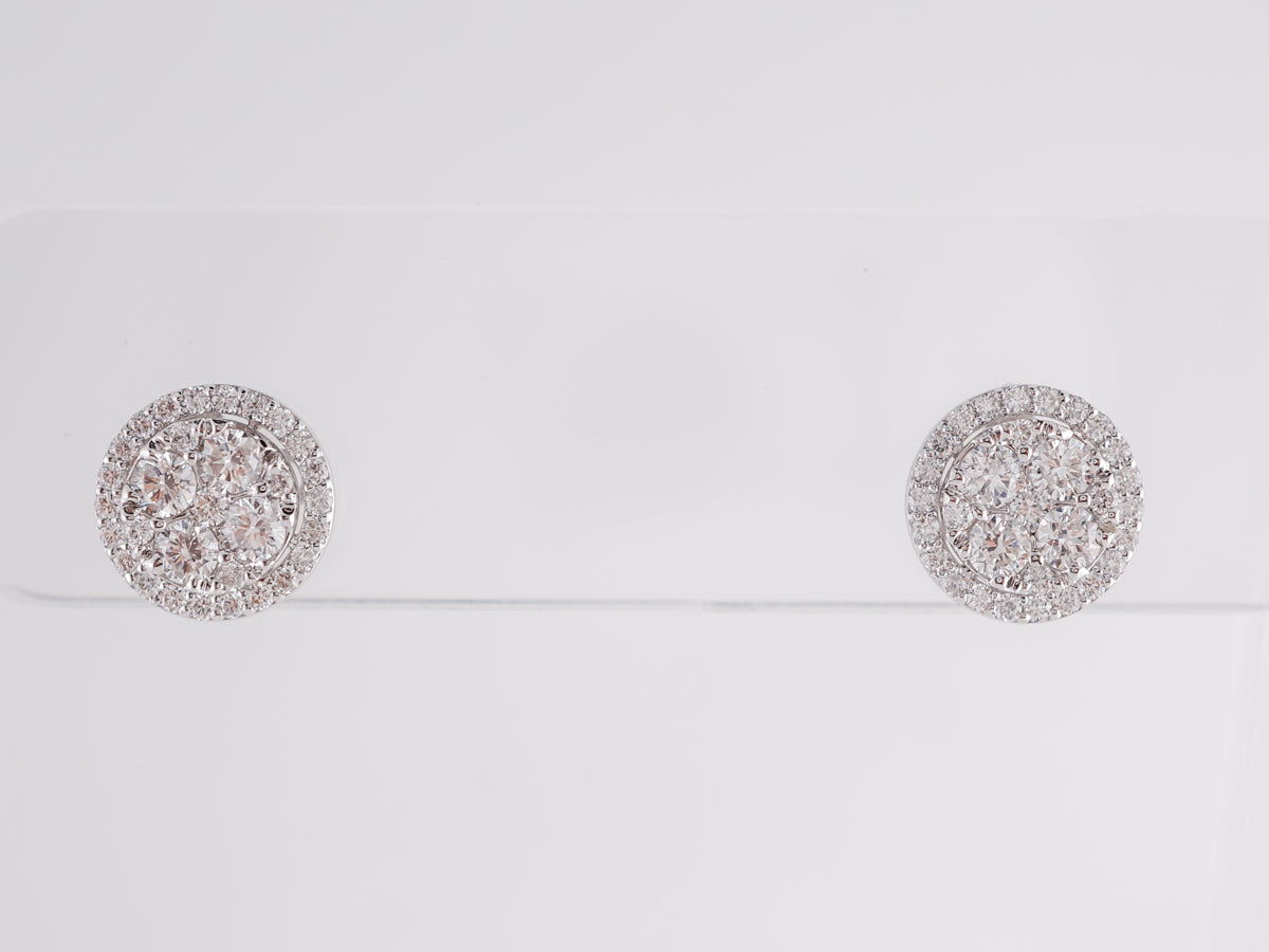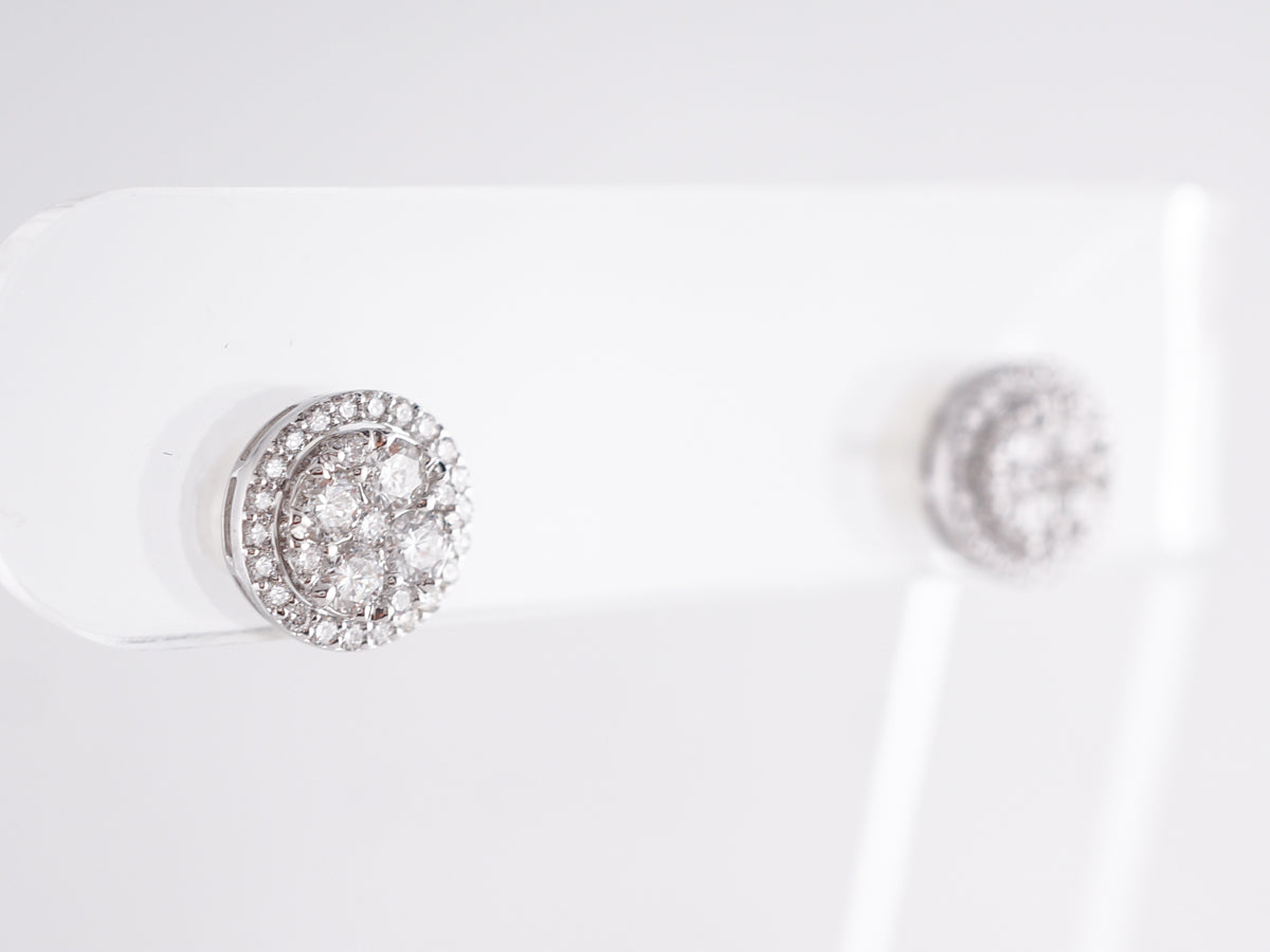 Diamond Cluster Halo Stud Earrings in 14k White Gold. These diamond cluster earrings feature .70 carats of round brilliant cut diamonds of various sizes set in 14 karat white gold. If you look closely you can see four larger stones clustered evenly together in the middle with a thin halo of small diamonds encircling the group. A design like this is a great way to achieve a big diamond look at a smaller price point!