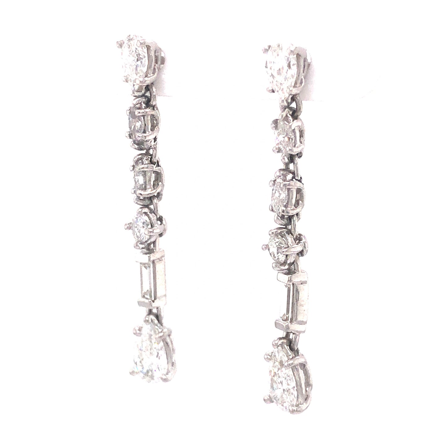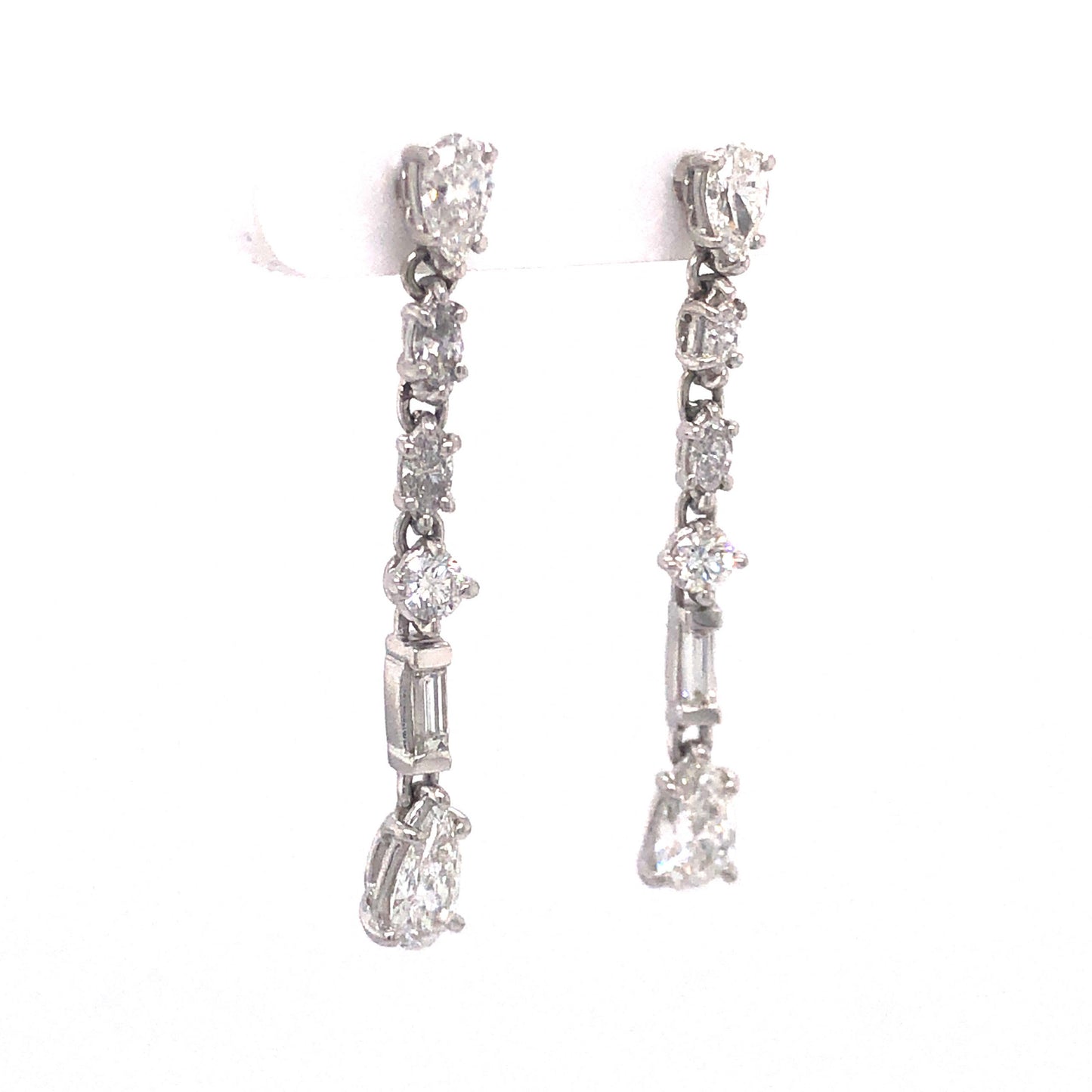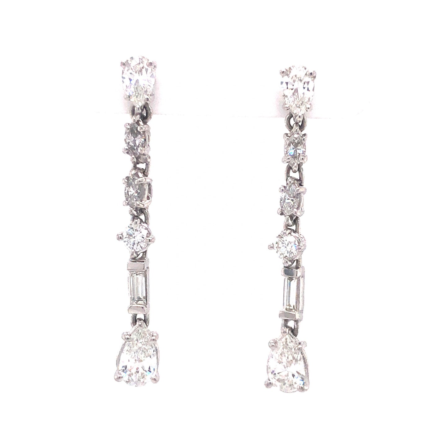These modern drop earrings feature 2.22 carats of diamonds finished in shimmering 18 karat white gold. Two (2) .50 carat diamonds, both near colorless and highly brilliant, hang at the bottom of the drops. Two (2) .30 carat diamonds are prong set on the stud backings of the drops. A lovely variety of diamond cuts decorate the middle of the dangling earrings. Two (2) .11 carat and four (4) .10 carat diamonds make a sparkling structured pattern in the center. This elegant diamond drop earrings measure 1.5” long and 3.36mm wide.