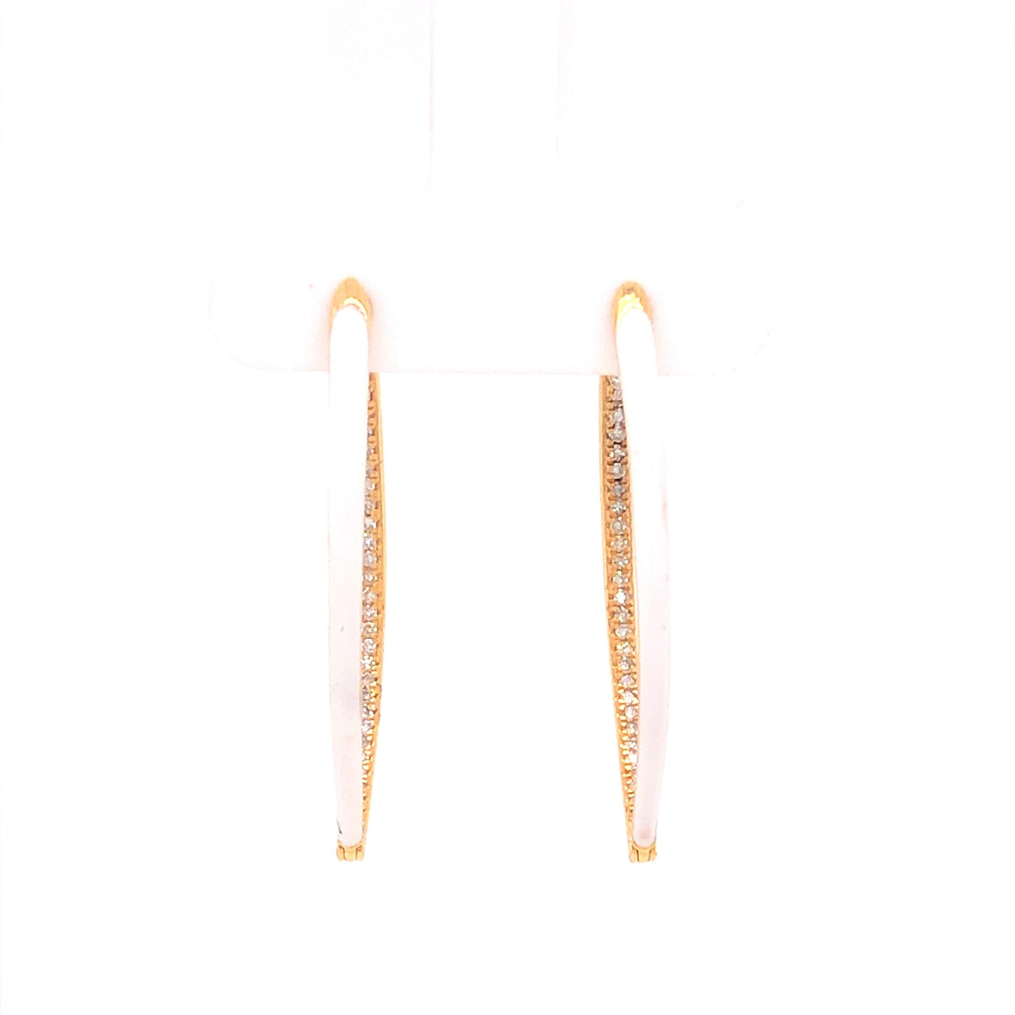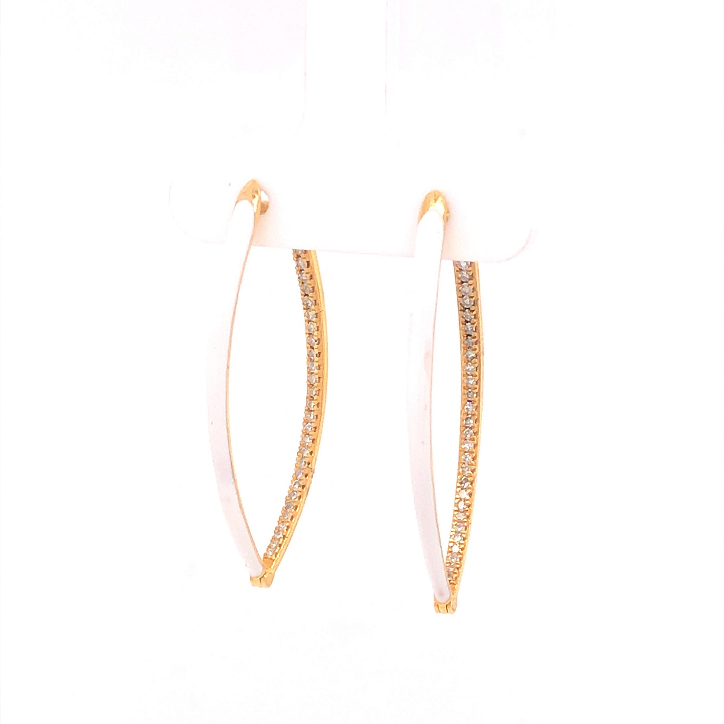 Joyful and stylish – these modern hoop earrings feature .39 carats of Round Brilliant cut diamonds in 14 karat yellow gold and white enamel. A perfect contrasting color palette of creamy white and warm yellow gold. The inside-out hoops measure 1.50 inches in length and would look beautiful with any style of wardrobe! Shop More Hoop Earrings.