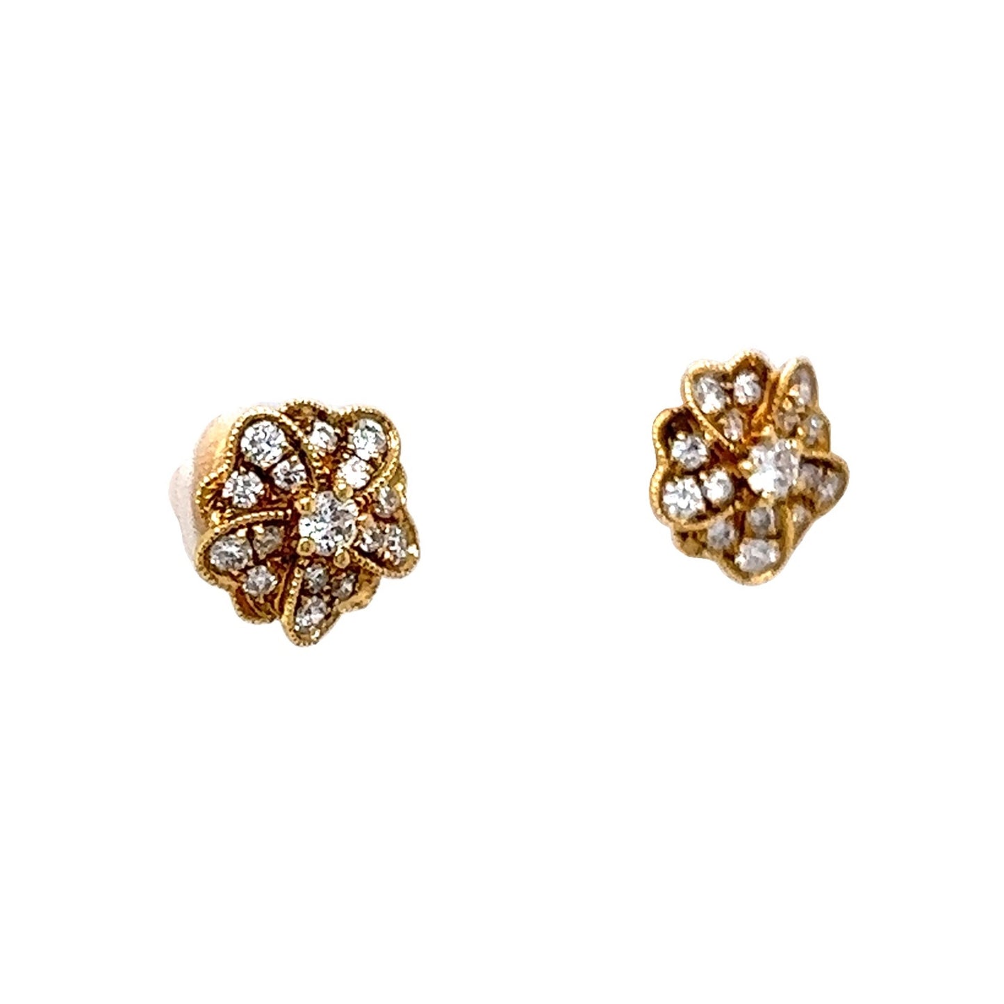 Diamond Flower Earring Studs in 18k Yellow Gold. These charming stud earrings feature clusters of diamonds weighing .32 carats and are set in 18 karat yellow gold. The swirling lines of milgrain detail separate little sections of round cut diamonds and create a nice floral look. The rich color of the yellow gold also has a nice contrast with the gorgeous white diamonds.