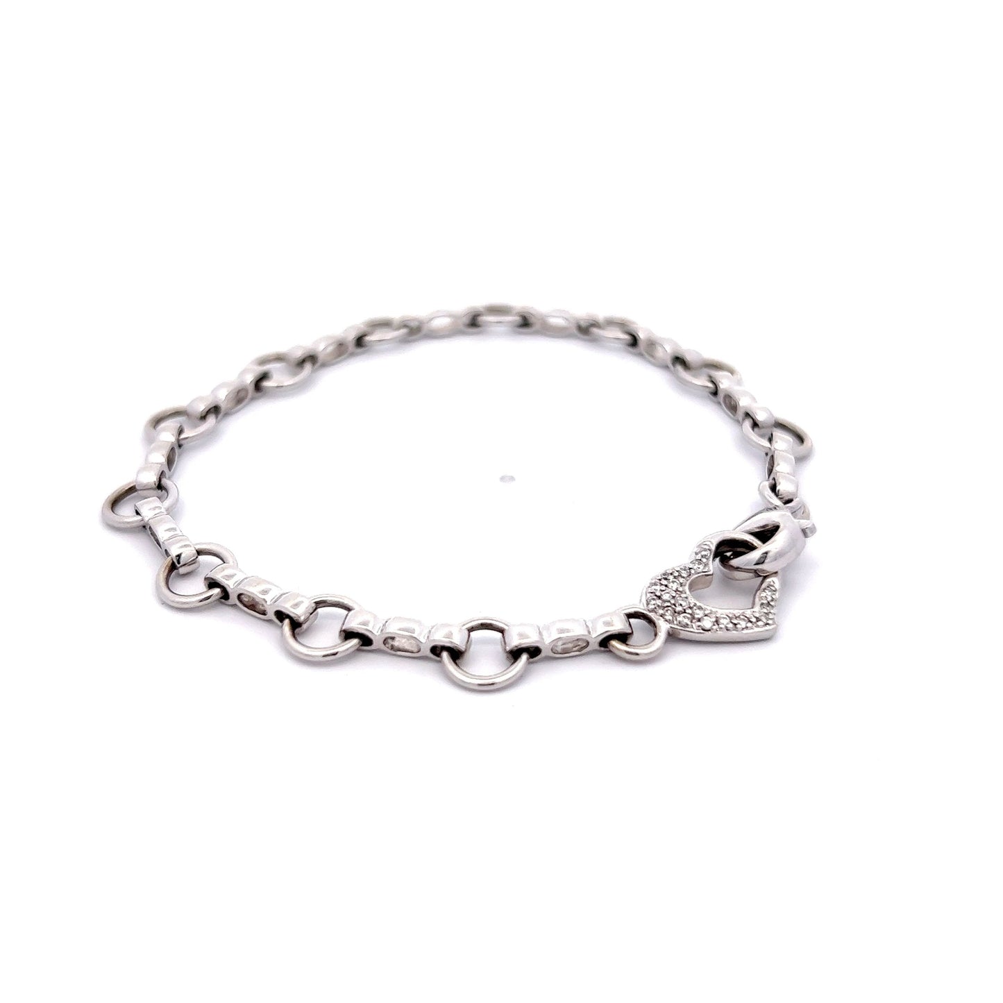 This modern charm bracelet features round brilliant diamonds The bracelet has a circular link chain and a pave diamond heart clasp.  The 14k white gold bracelet has thirteen (13) loops for you to add charms to.  Check out our charm section for some fun vintage ideas!