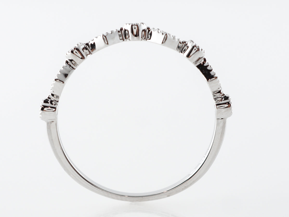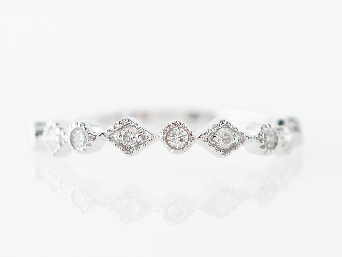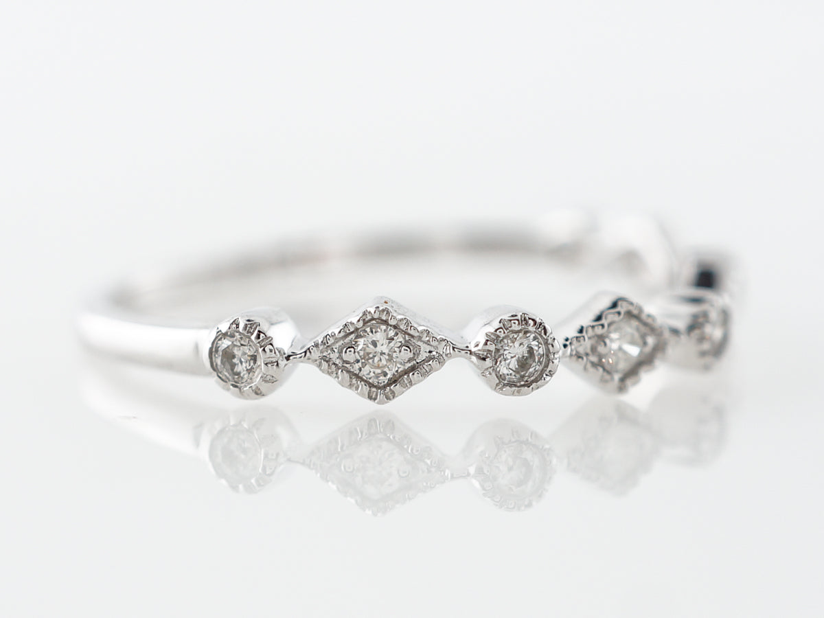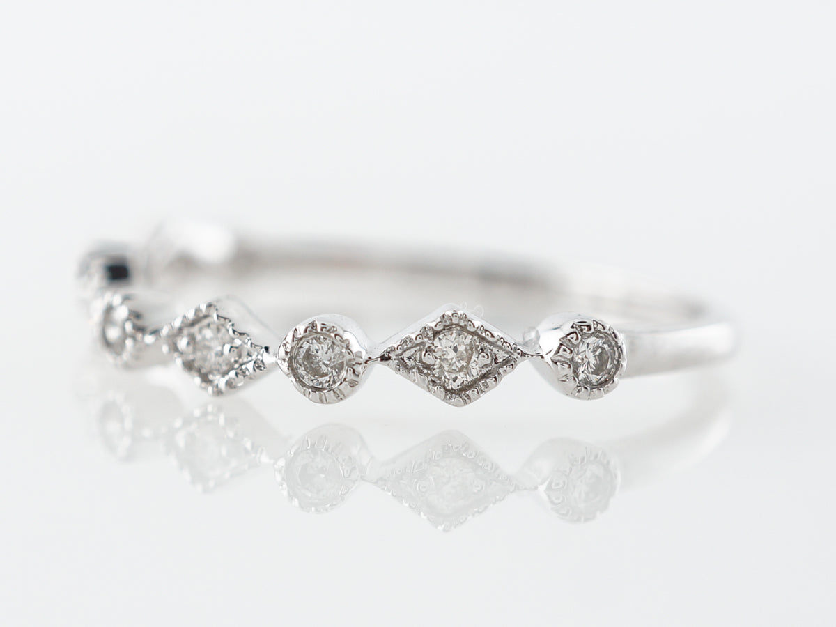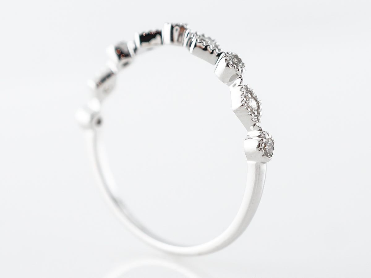 Diamond Milgrain Wedding Band in 14k White Gold. This modern wedding band features .11 carats of round brilliant cut diamonds set across the top of the band in 14 karat white gold. The graduated sized diamond give the ring a gorgeous geometric feel and the light milgrain edging provides the texture. This ring will pair nicely with an engagement ring or in a stack of bands.