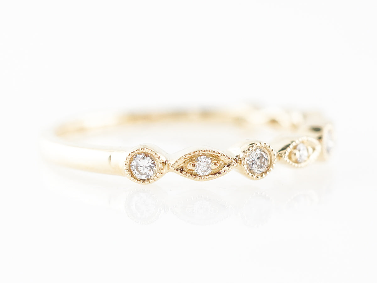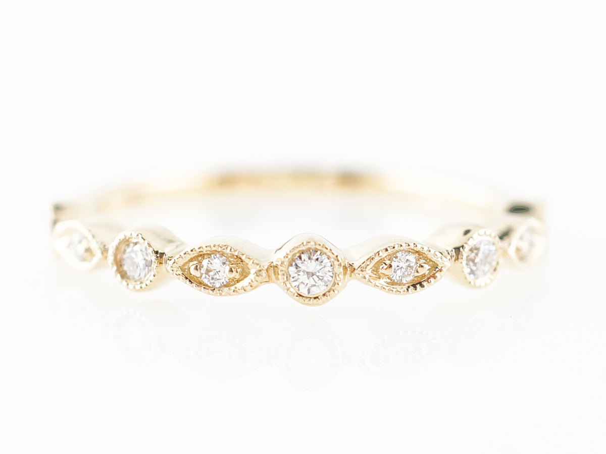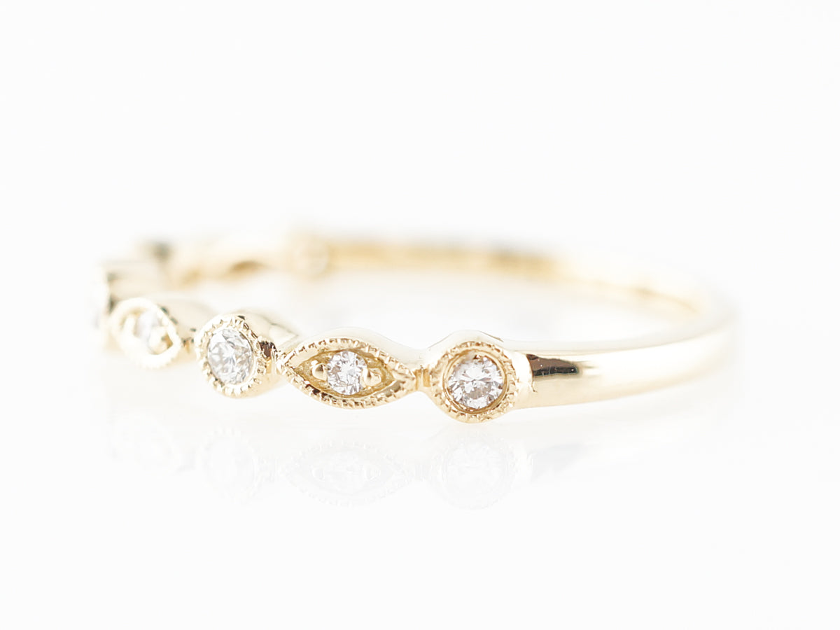 Diamond Milgrain Yellow Gold Wedding Band in 14k. This modern wedding band features .15 carats of round brilliant cut diamond set across the top of the band in 14 karat yellow gold. The differing sized diamonds give the ring a gorgeous geometric feel and the light milgrain edging provides the texture. This ring will pair nicely with an engagement ring or in a stack of bands.