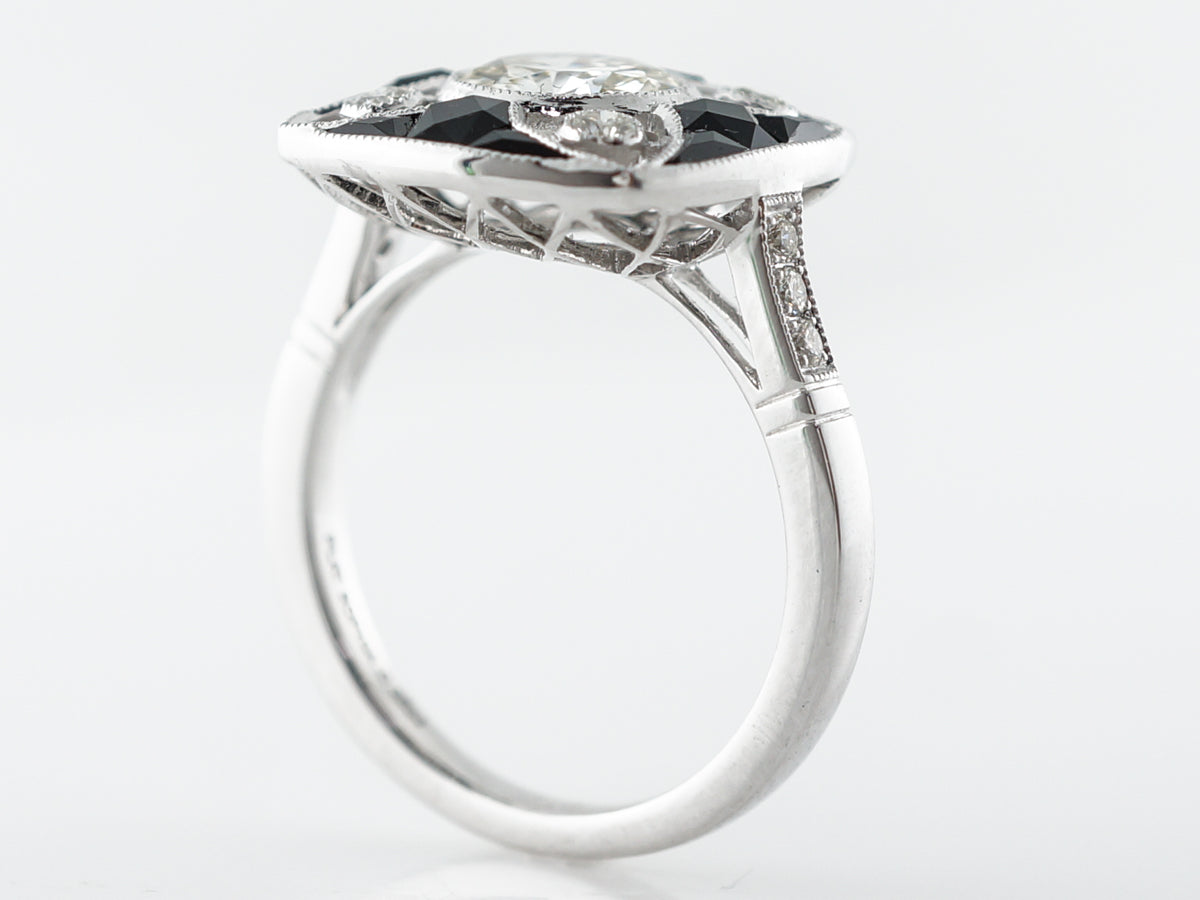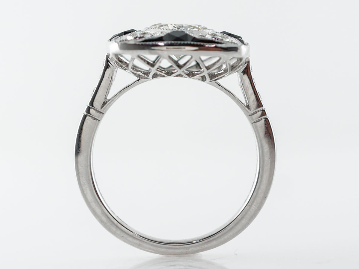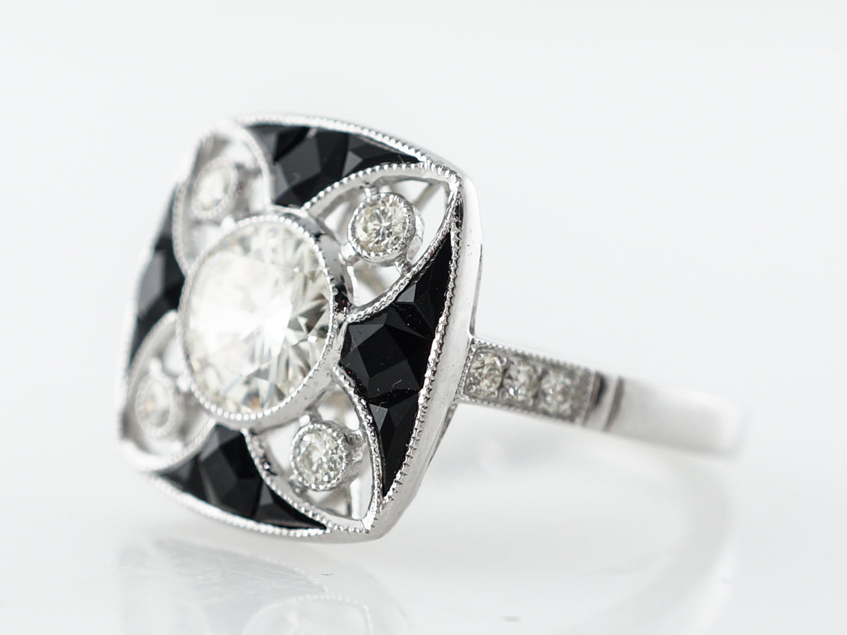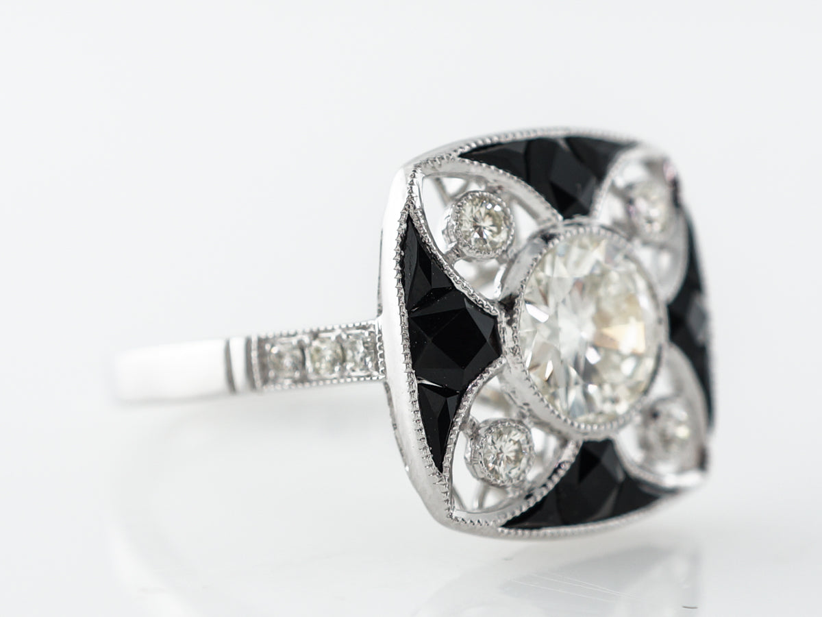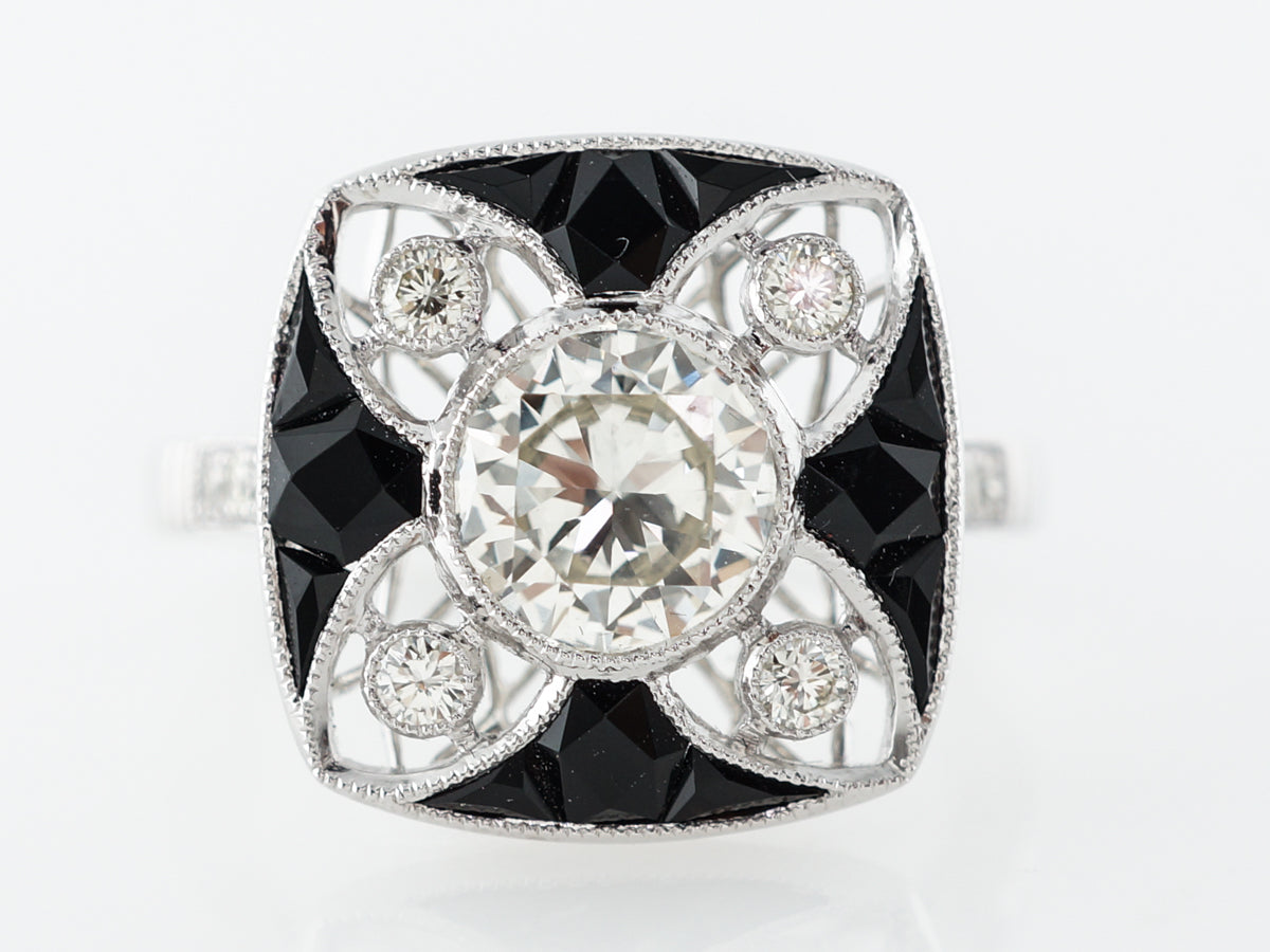 This modern cocktail ring features a 1.19 carat round brilliant cut diamond and is set in platinum. The face of the ring has a wonderful and intricate design around the bezel set center diamond. The accent stones are placed very creatively with small diamonds in floating bezels occupying the negative space, and onyx which has been cut perfectly to fit the remaining space. Around all of this there is more milgrain surrounding the entire top face. There is a short string of diamonds on the shoulders completing this eye catching cocktail ring.