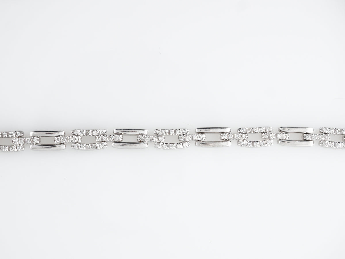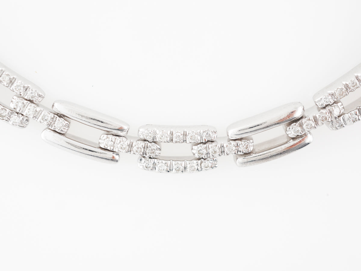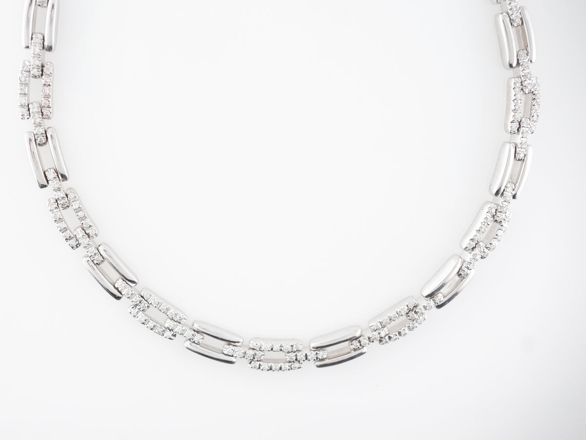 Diamond Pave Chain Necklace 18k White Gold 16 inches. This fine link chain necklace features 1.48 of pave set round cut diamonds and is finished in 18 karat white gold. The necklace measures 16 inches in length and the pave links are separated by smooth links with a high polish. This could be worn every day and would be a fabulous gift for special person in your life.