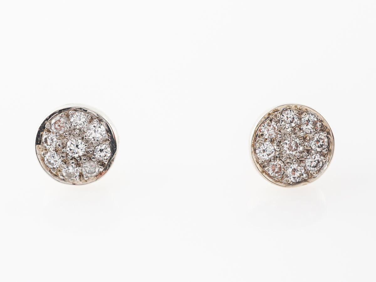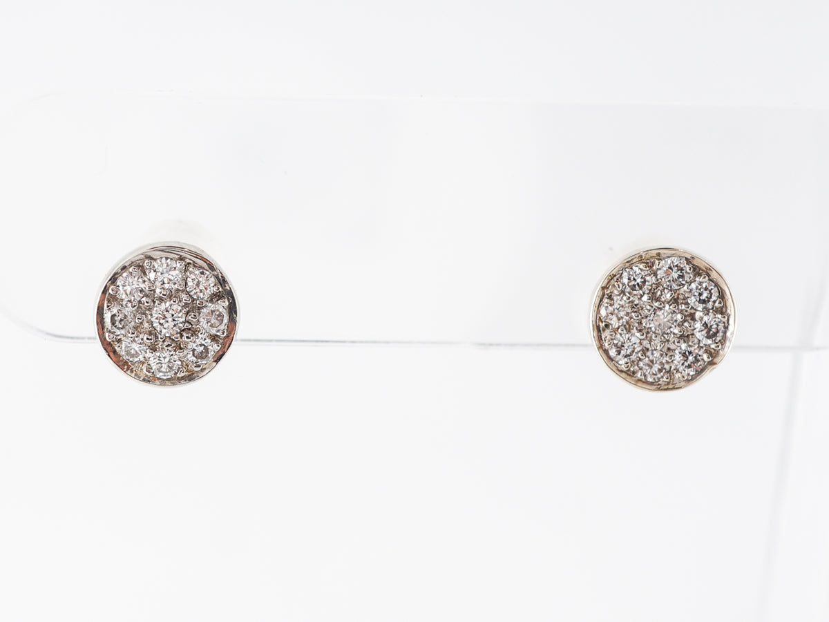 Diamond Pave Stud Disc Earrings in 14k Yellow Gold. These modern stud earrings feature .36 carats of round brilliant cut diamonds and are set in 14 karat yellow gold. The lovely round pave clusters would be great for everyday wear and could be easily worn on a fancy night out.