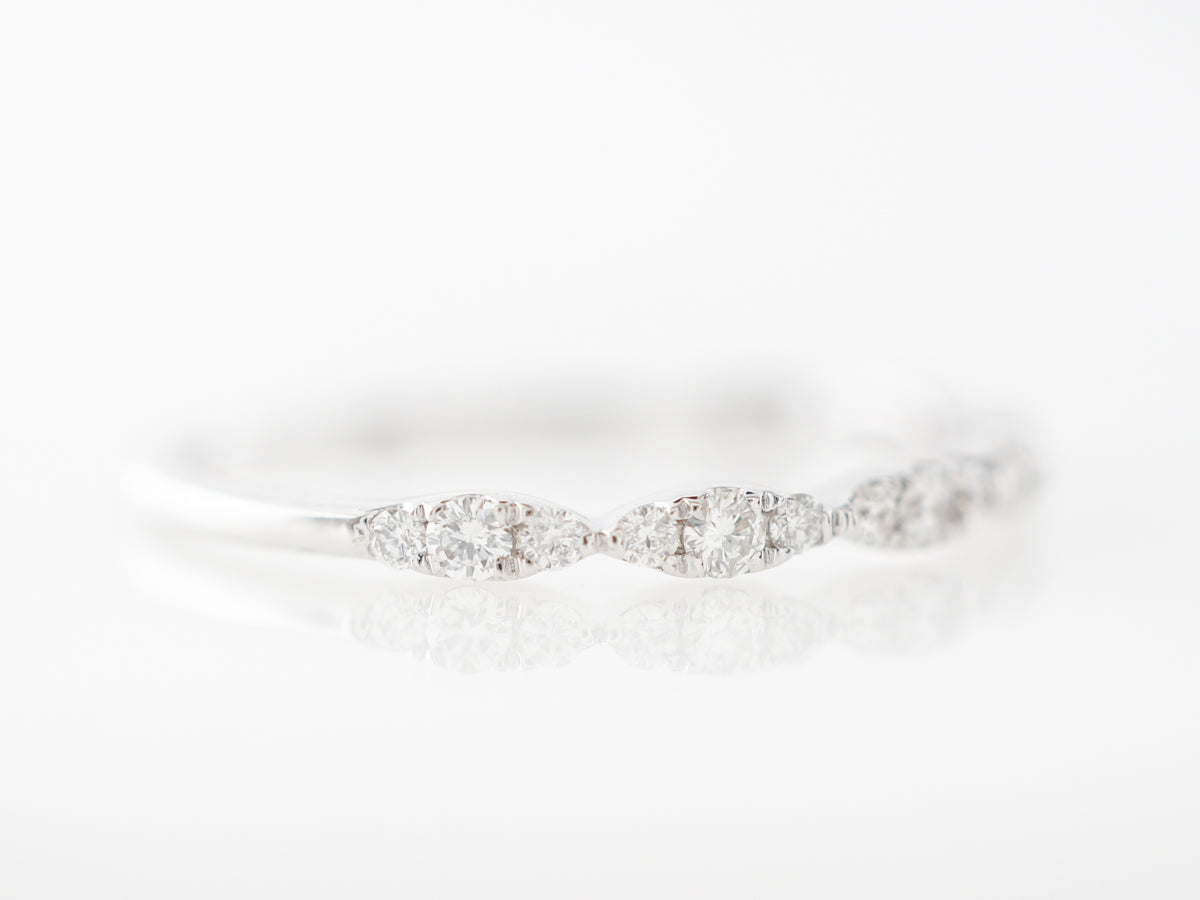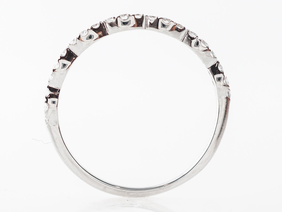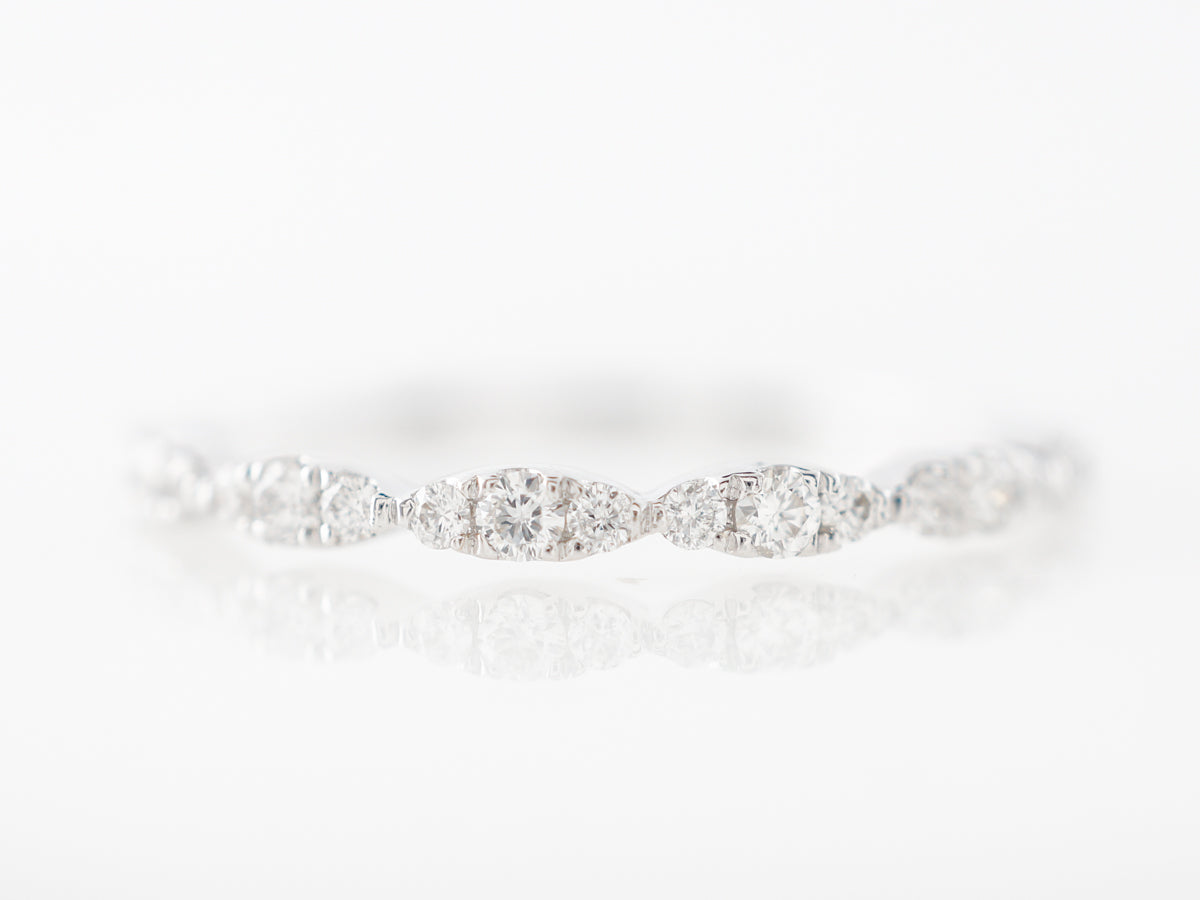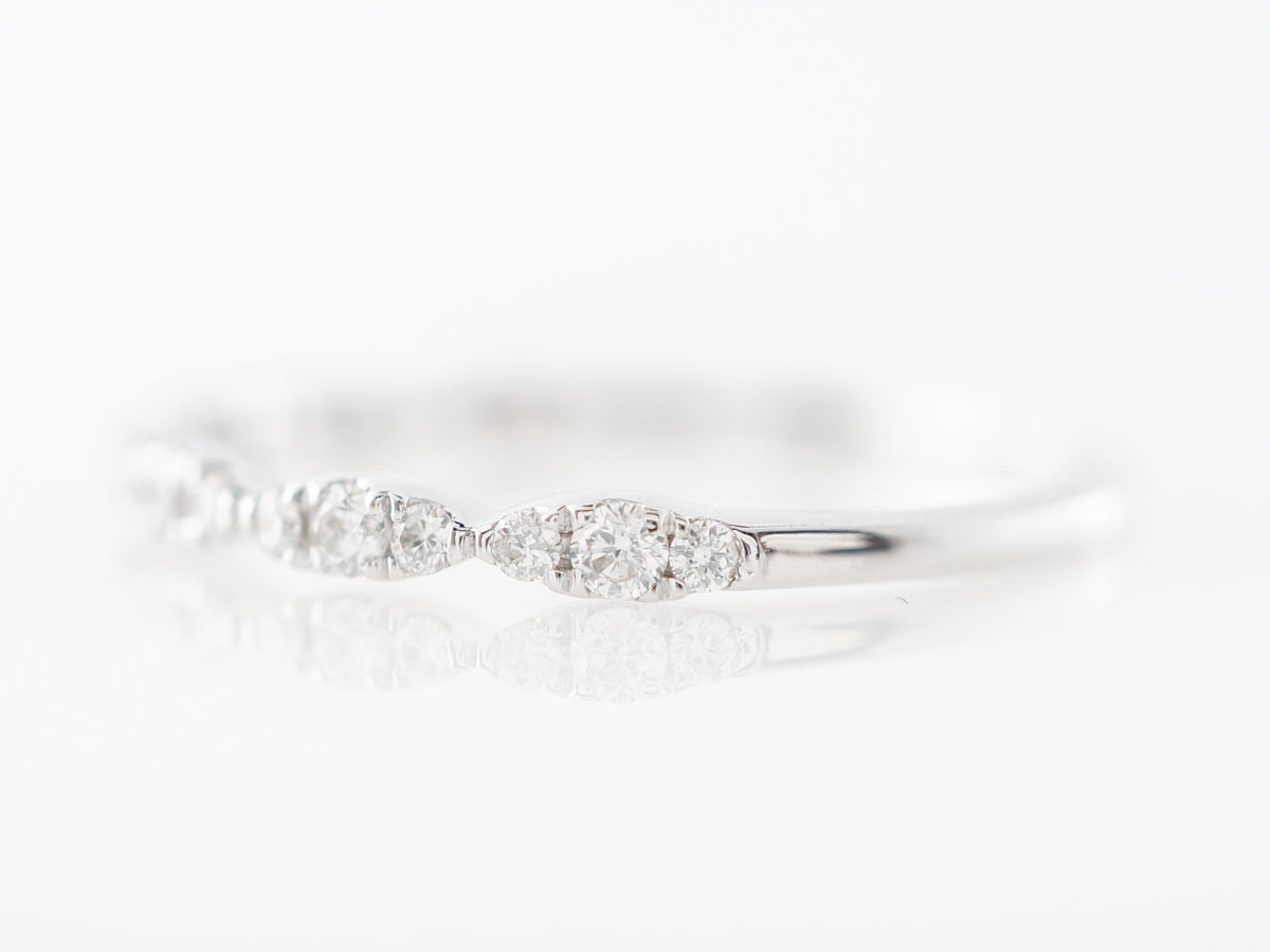 Diamond Pave Wedding Band in 14k White Gold. This pave diamond wedding band consists of repeating clusters of diamonds covering the top half of the ring. The diamonds total .21 carats and are set in 14 karat white gold.