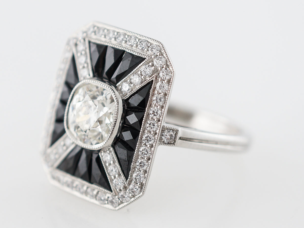 Diamond Sapphire Right Hand Ring in Platinum. This incredibly elegant modern right hand ring features both diamonds and sapphires. The center diamond is a gorgeous .93 carat old mine cushion cut that is set in a bezel with light milgrain detailing. Fourteen (14) sapphires are set in triangular patterns on each side of the center diamond and separated by four rows of diamonds, creating a beautiful geometric pattern. The undercarriage features beautiful filigree work that allows light in from every angle to enhance the sparkle of the stones. Finished in platinum, this stylish right hand ring is forever cool!