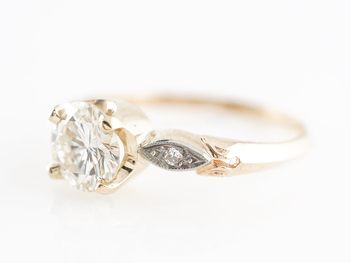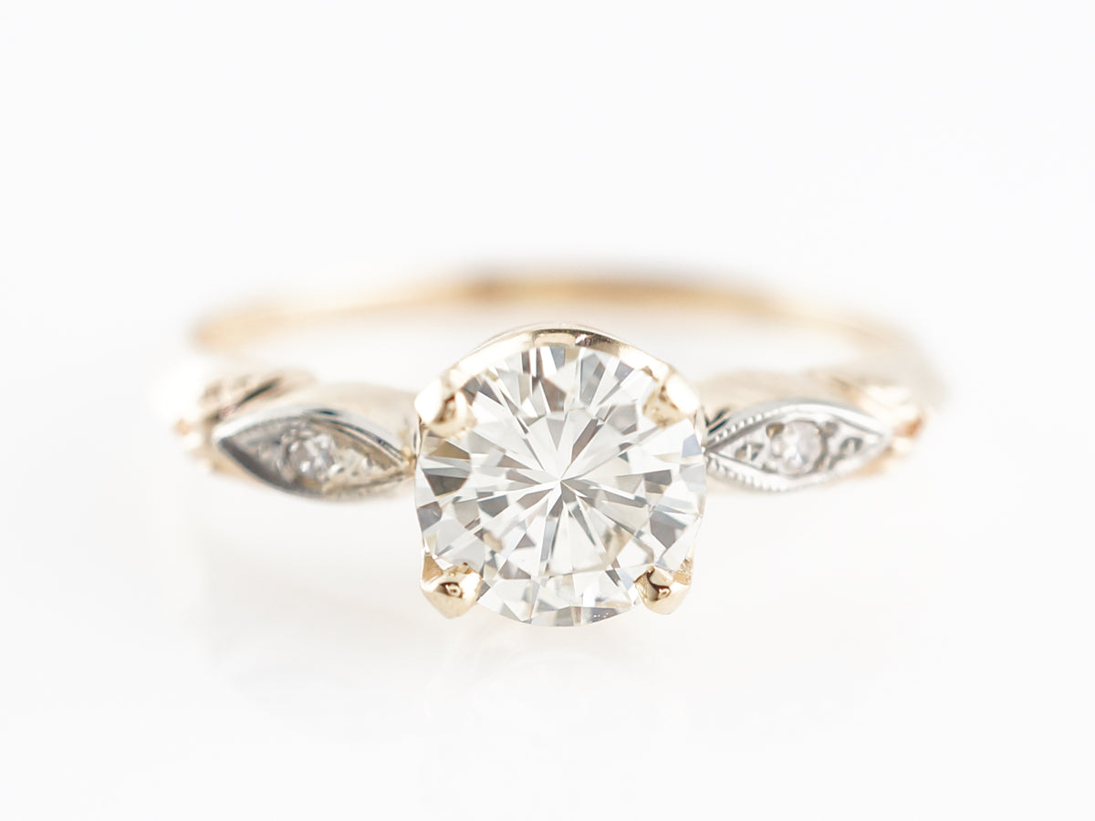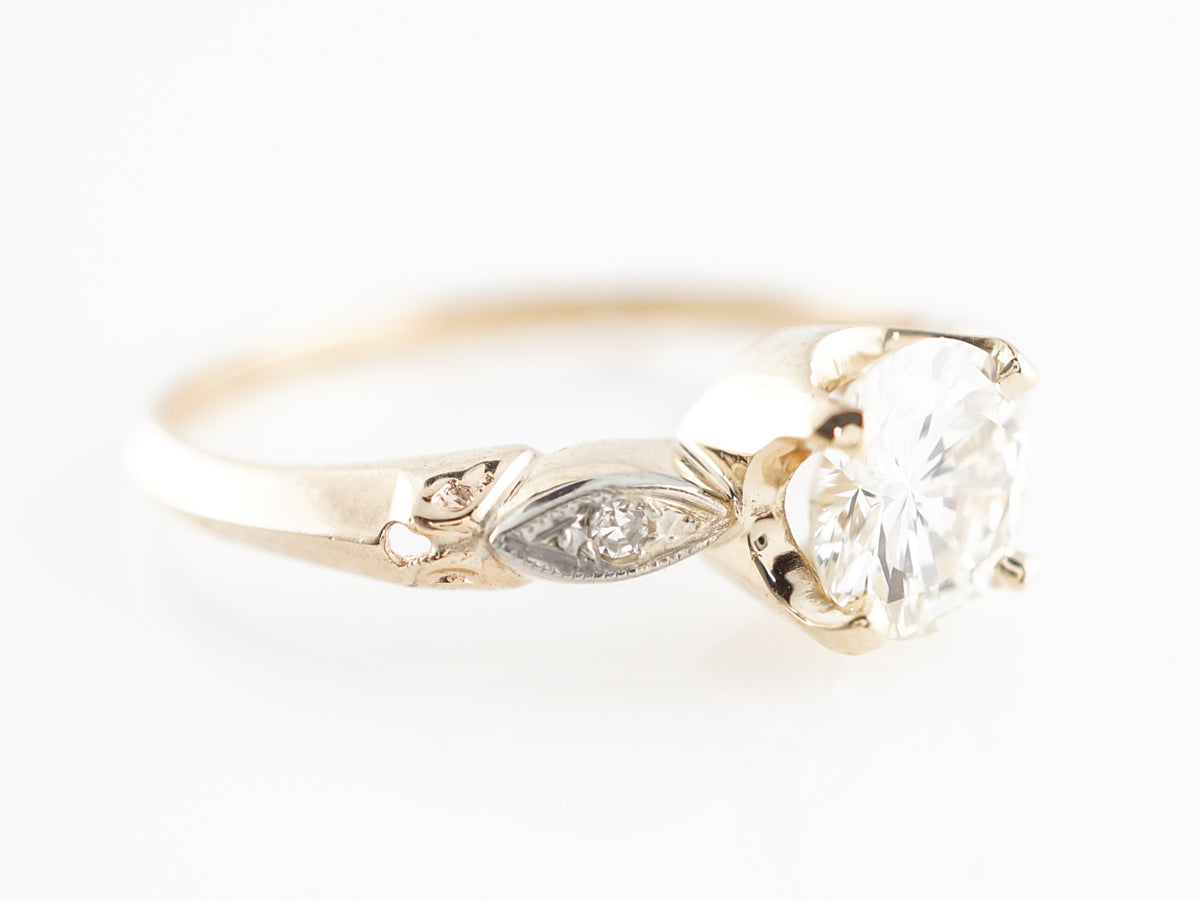 Diamond Solitaire Two-Tone Engagement Ring in 14k. This fine engagement ring features a round brilliant cut .86 carat diamond and is finished in 14 karat yellow gold. The small marquise sections on the shoulders contain little accent diamonds and are bordered with milgrain detail, these are actually done in white gold to create a bit of color contrast. Below the shoulder accents the yellow gold band is adorned with swirling metal work that hugs and emphasizes their brilliance.
