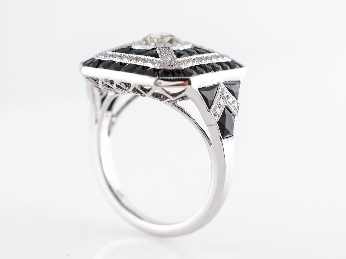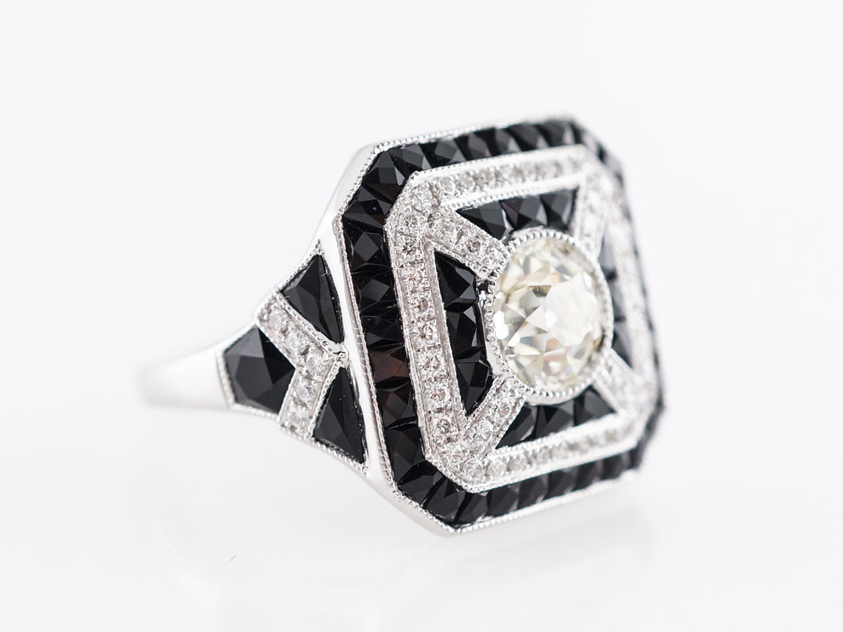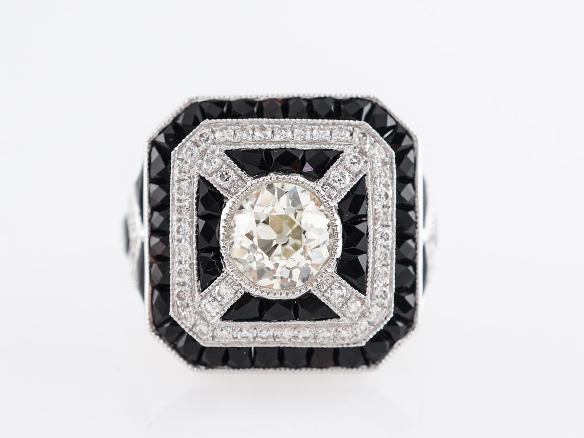 This ornate modern cocktail onyx ring features a 1.10 carat old European cut diamond set in platinum. Black onyx and diamond accents create an X-marks-the-spot motif. The dazzling design places the primary stone in the center. A milgrain bezel and rows of diamonds lead to each corner of the cushion shaped halo. In the negative space created by the diamonds sits a few groups of channel set onyx that are French cut giving them a tidy and symmetrical look. The shoulders of this statement ring each have a lovely design of onyx and diamond as they flay out from the shank. This cocktail onyx right with diamonds is a work of art!