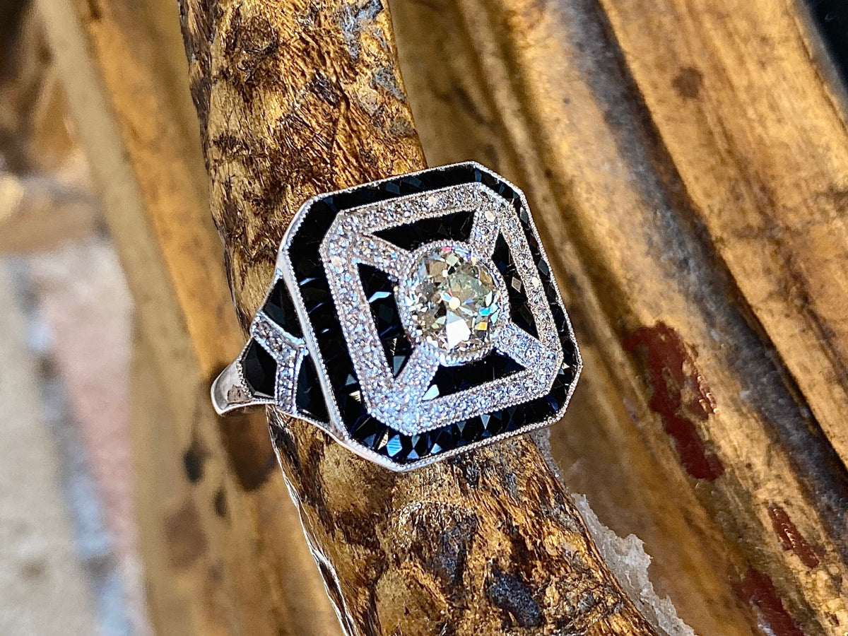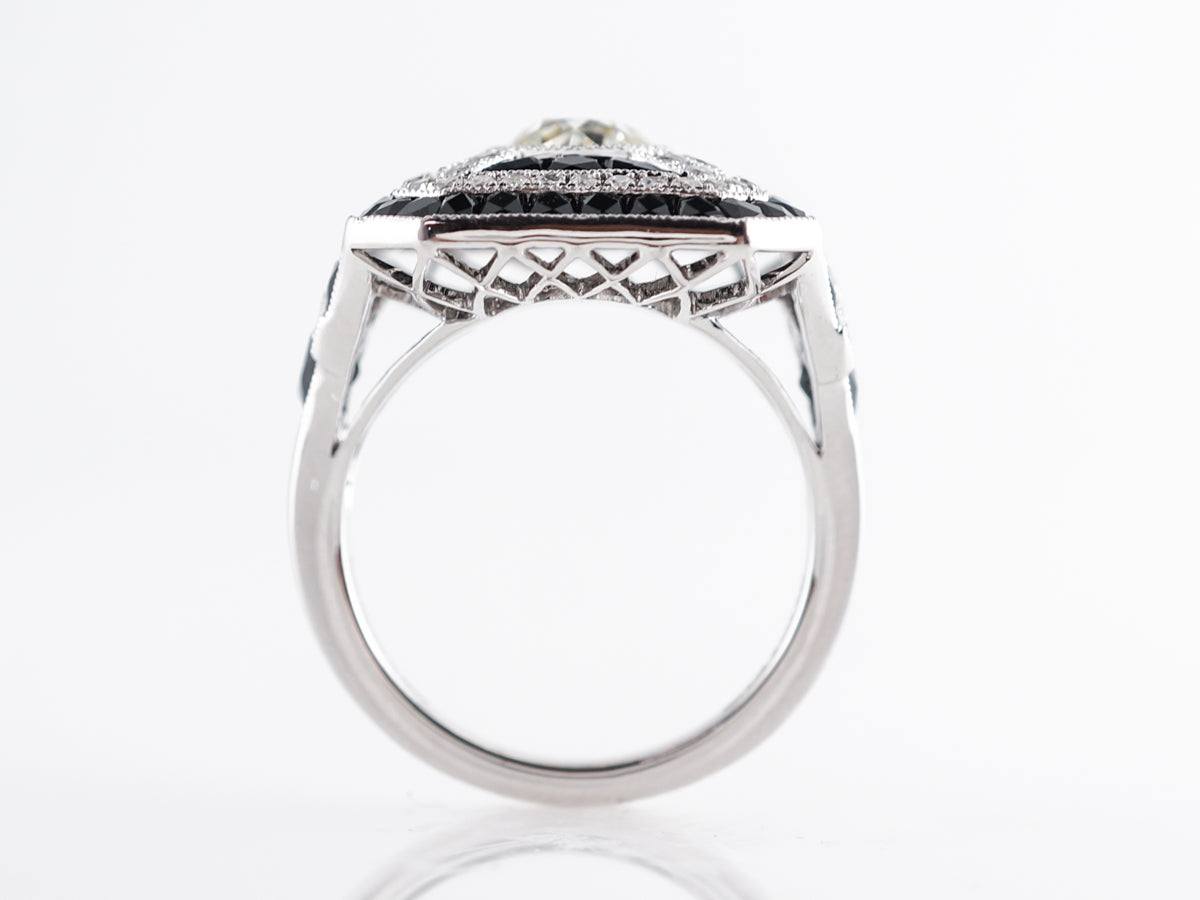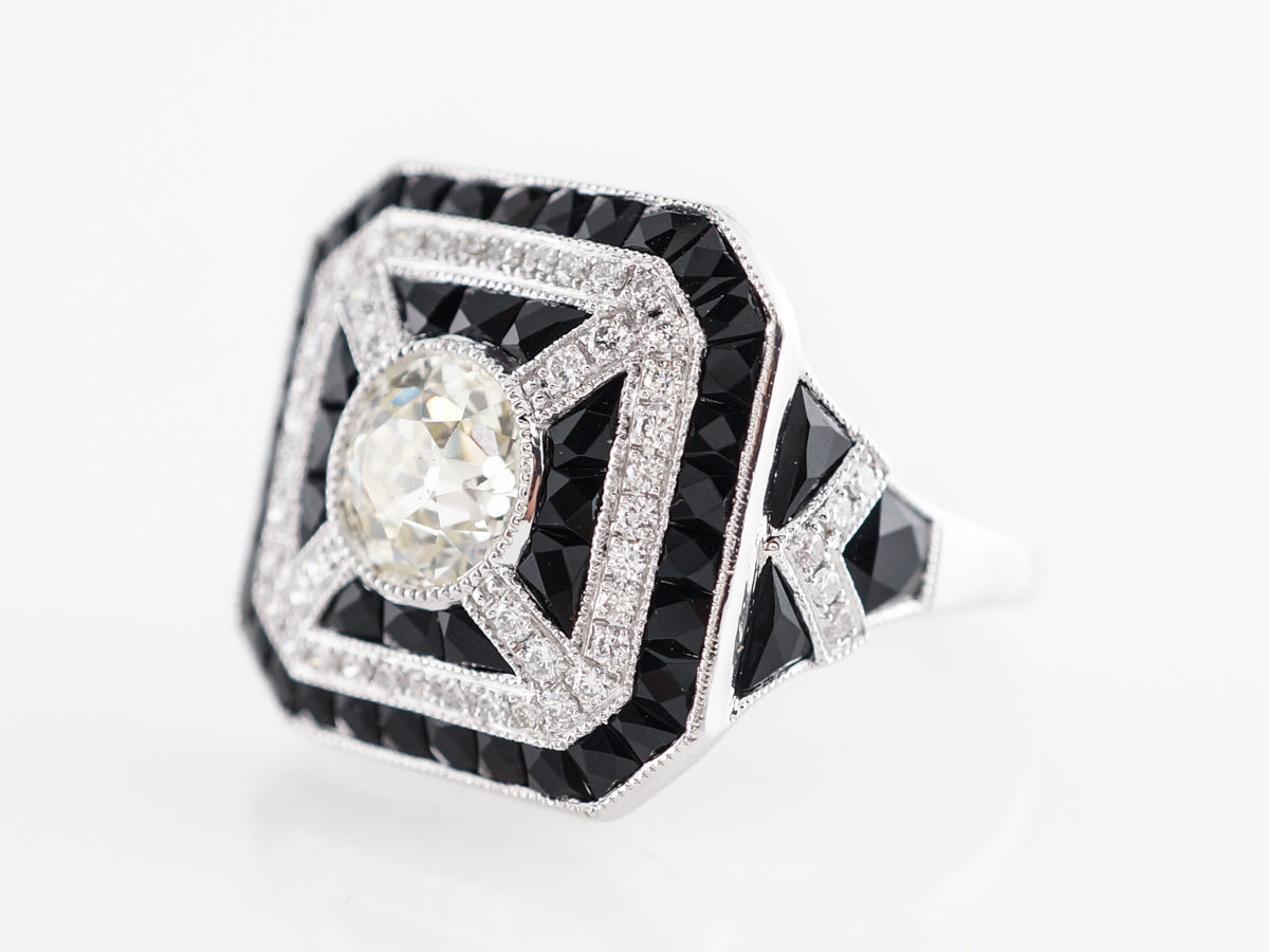 This ornate modern cocktail onyx ring features a 1.10 carat old European cut diamond set in platinum. Black onyx and diamond accents create an X-marks-the-spot motif. The dazzling design places the primary stone in the center. A milgrain bezel and rows of diamonds lead to each corner of the cushion shaped halo. In the negative space created by the diamonds sits a few groups of channel set onyx that are French cut giving them a tidy and symmetrical look. The shoulders of this statement ring each have a lovely design of onyx and diamond as they flay out from the shank. This cocktail onyx right with diamonds is a work of art!