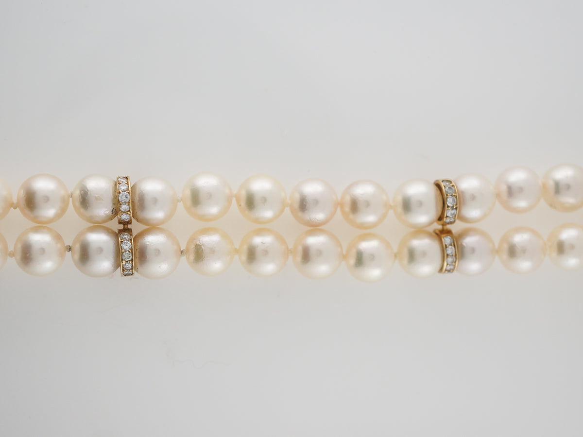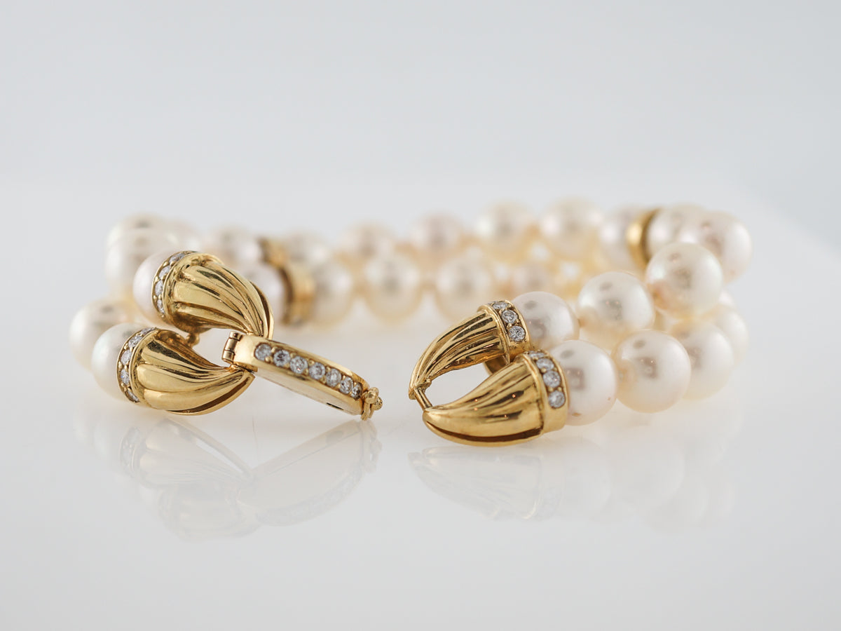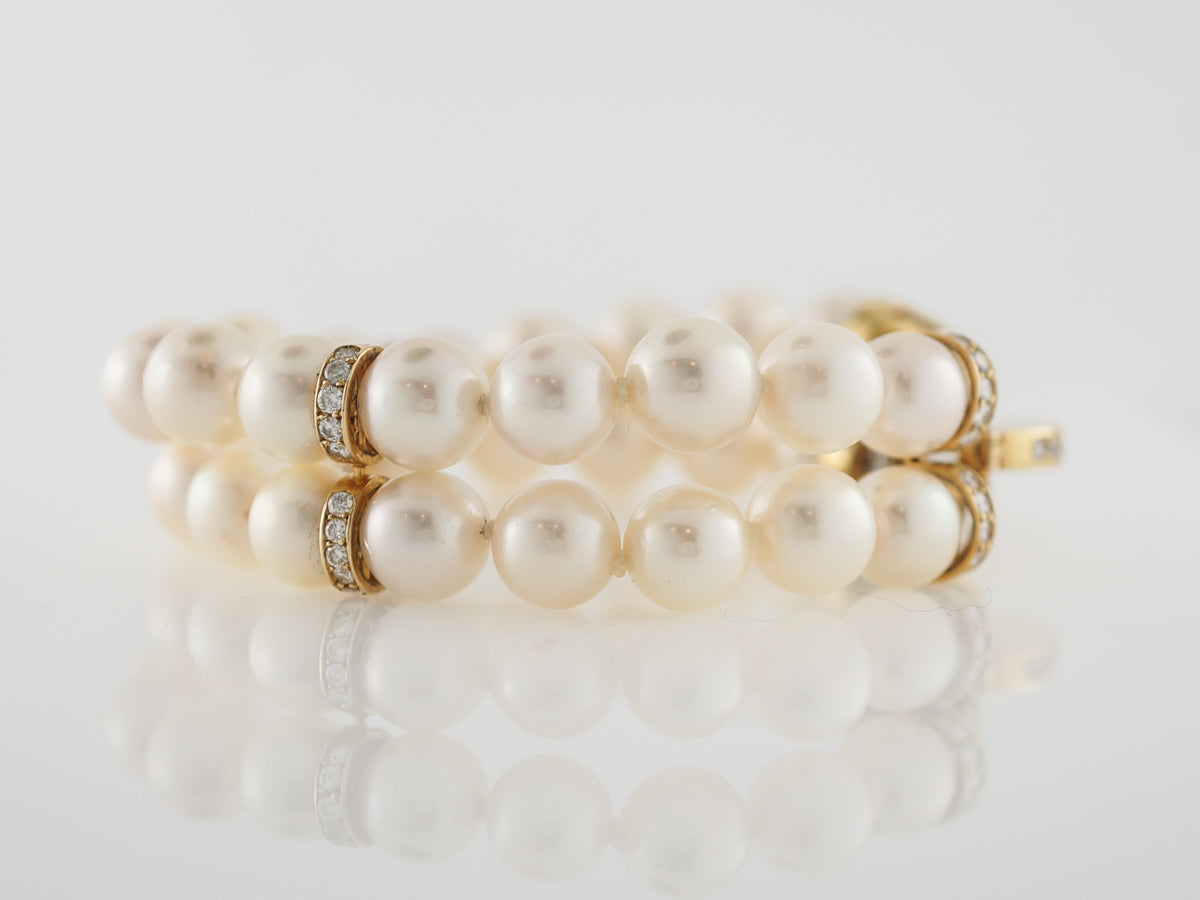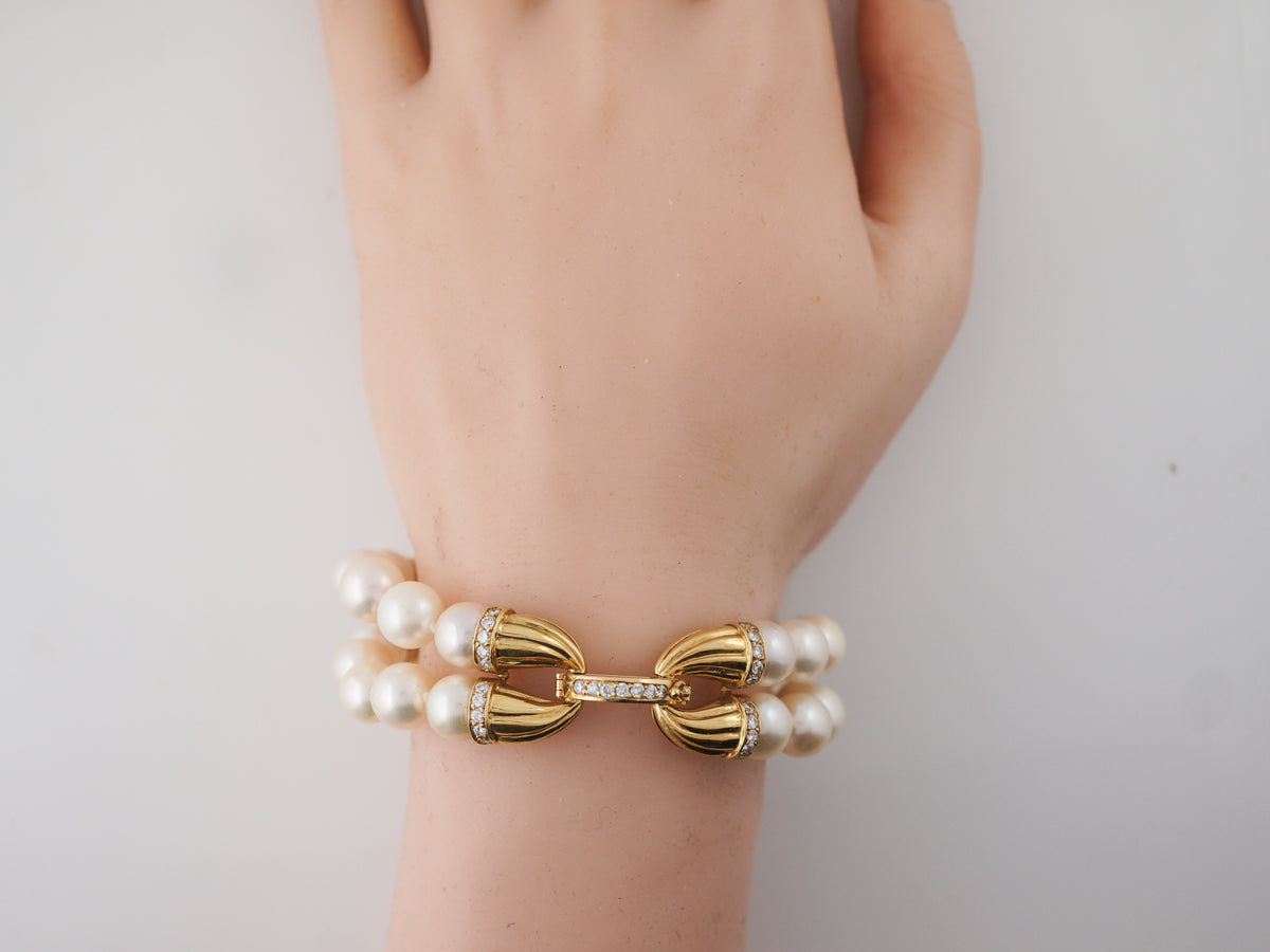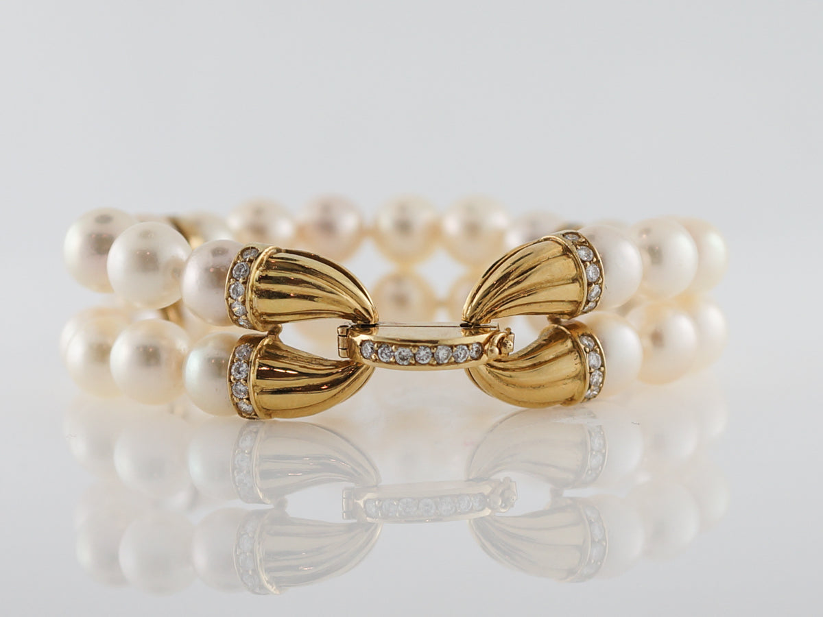Diamonds Pearl Cuff Bracelet in 14k Yellow Gold. This Modern pearl bracelet has double strung pearl beads as well as .80 carats of round brilliant cut diamonds which are prong set in 14k yellow gold. Each pearl is beautifully lustrous and the texture worked into the gold offer a bold, glamorous look. Pearls are never left out of any haute couture collection and add a look of high fashion with a single strand or for a show stopping look try layering strands of pearls together.