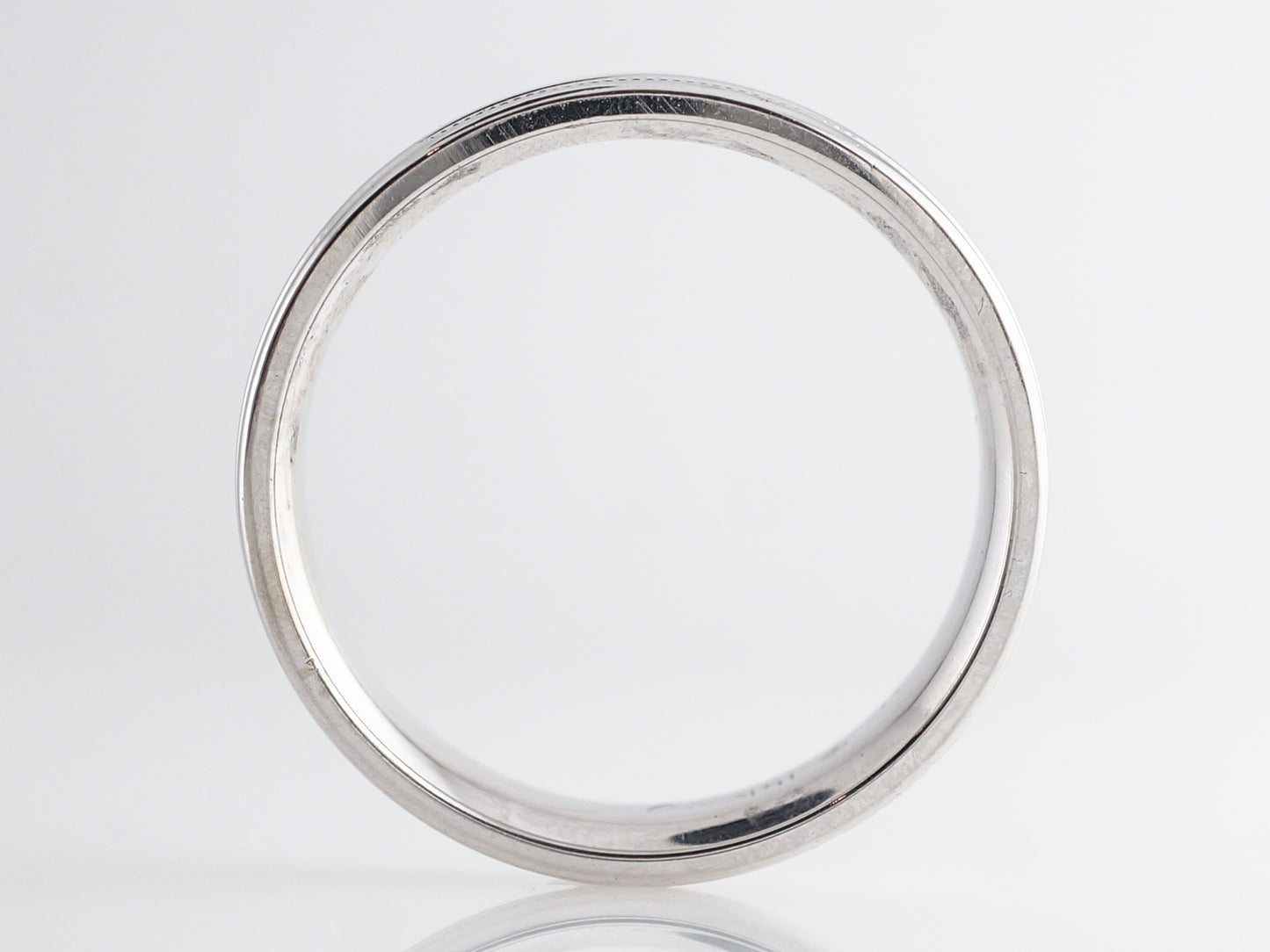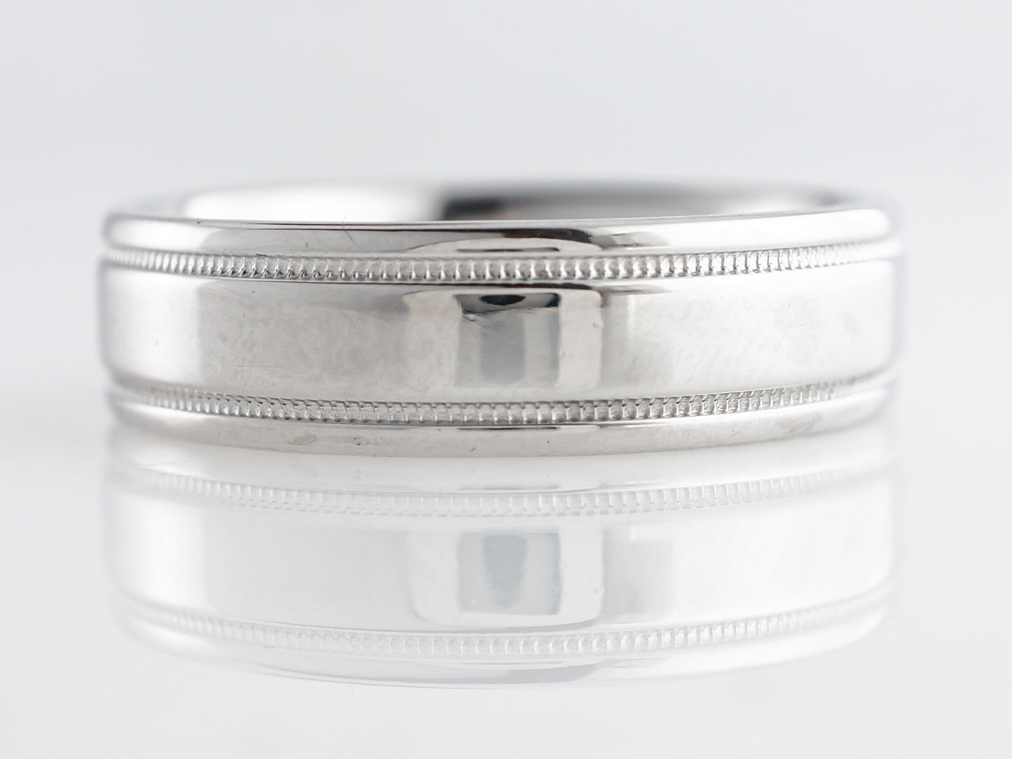 Double Milgrain Mens Wedding Band in White Gold. This wide modern men’s band is finished in 14 karat white gold. A nice design for someone looking for a classic style and a bit of flair detail on the outer borders with double milgrain work.
