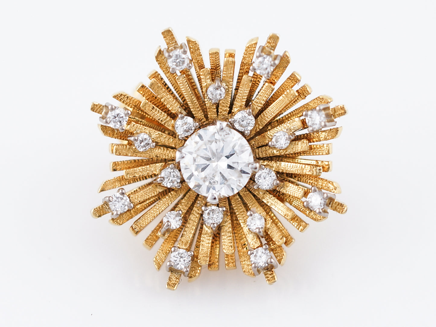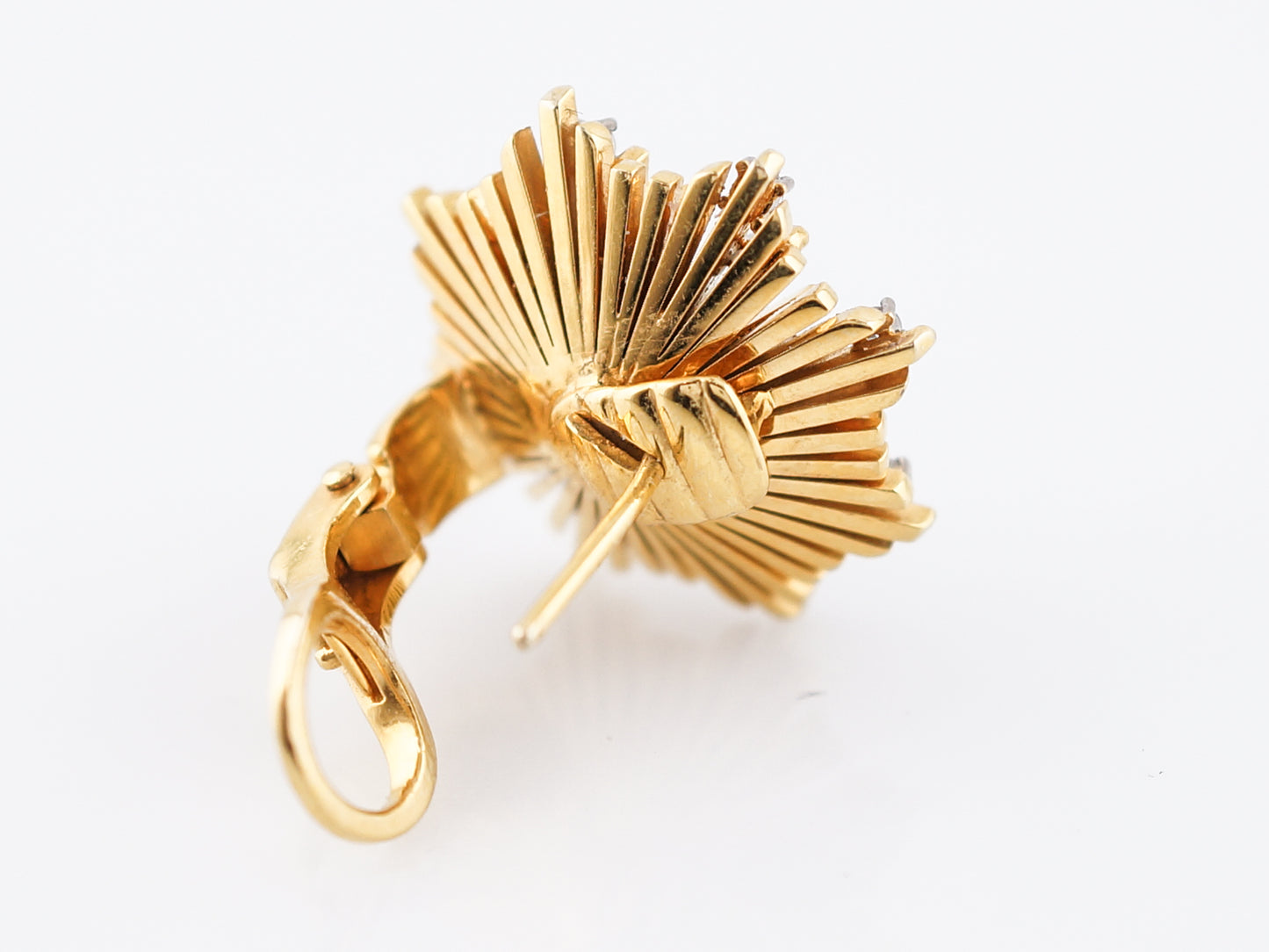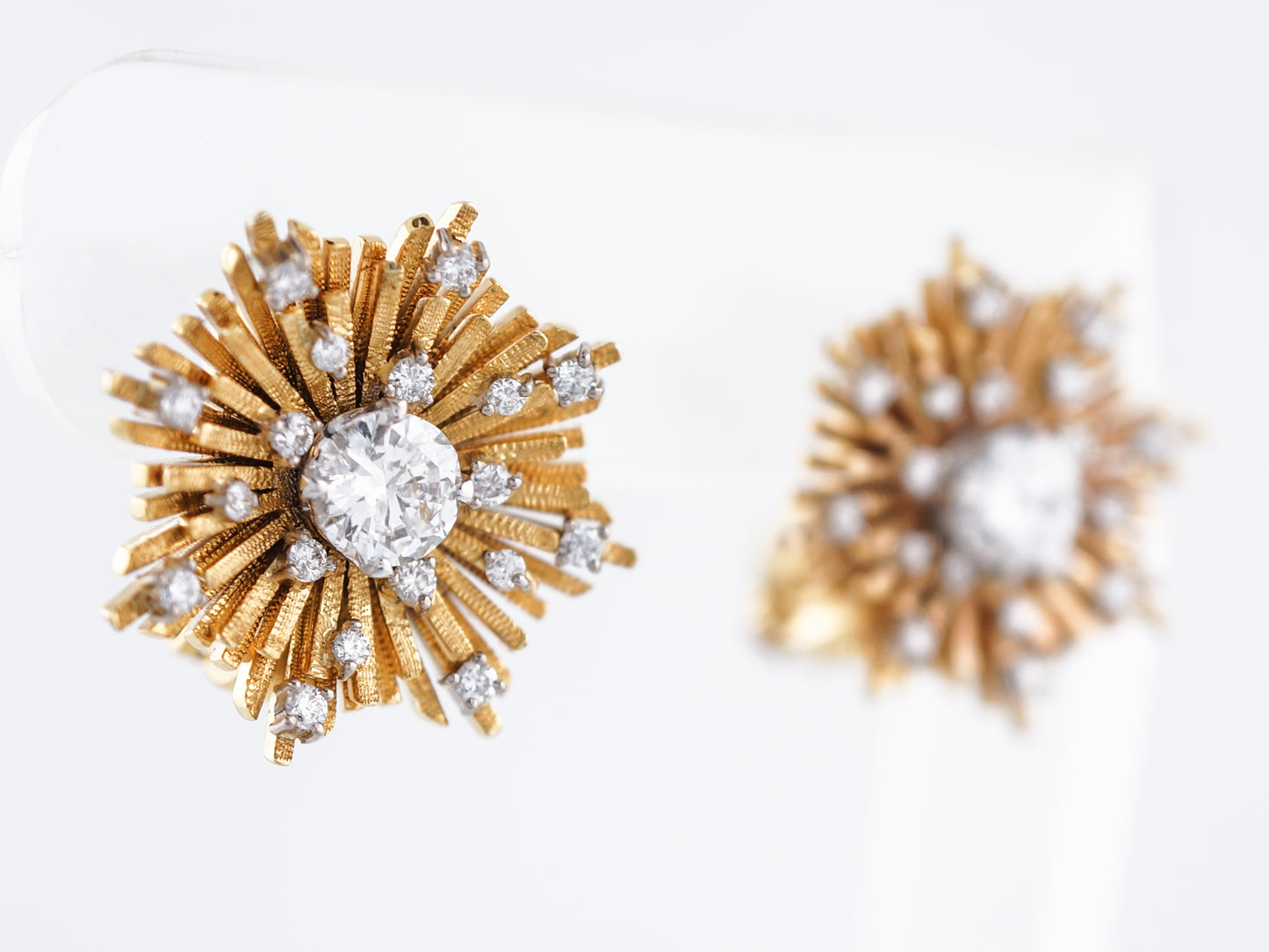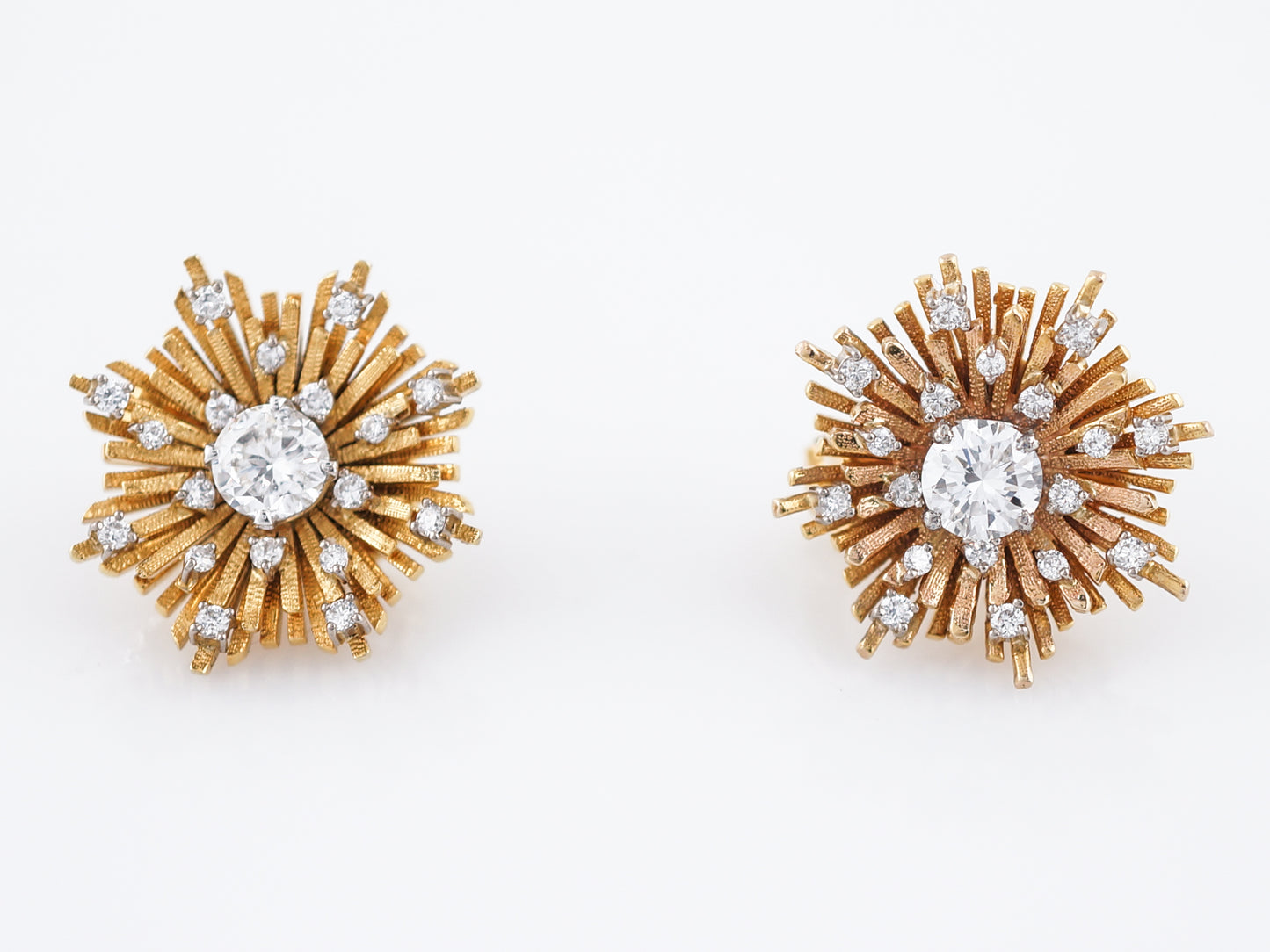 Set in a 18k yellow gold, these modern earrings are full of flair. Each earring is like a star-burst with .66 round brilliant cut diamonds at the center. the F color center diamonds are spectacularily white and positively radiate from the center. Thirteen (13) accent diamonds cluster around the center stone and provide another layer of gorgeous sparkle. The white diamonds and yellow gold beautifully contrast one another and make these earrings extremely special!