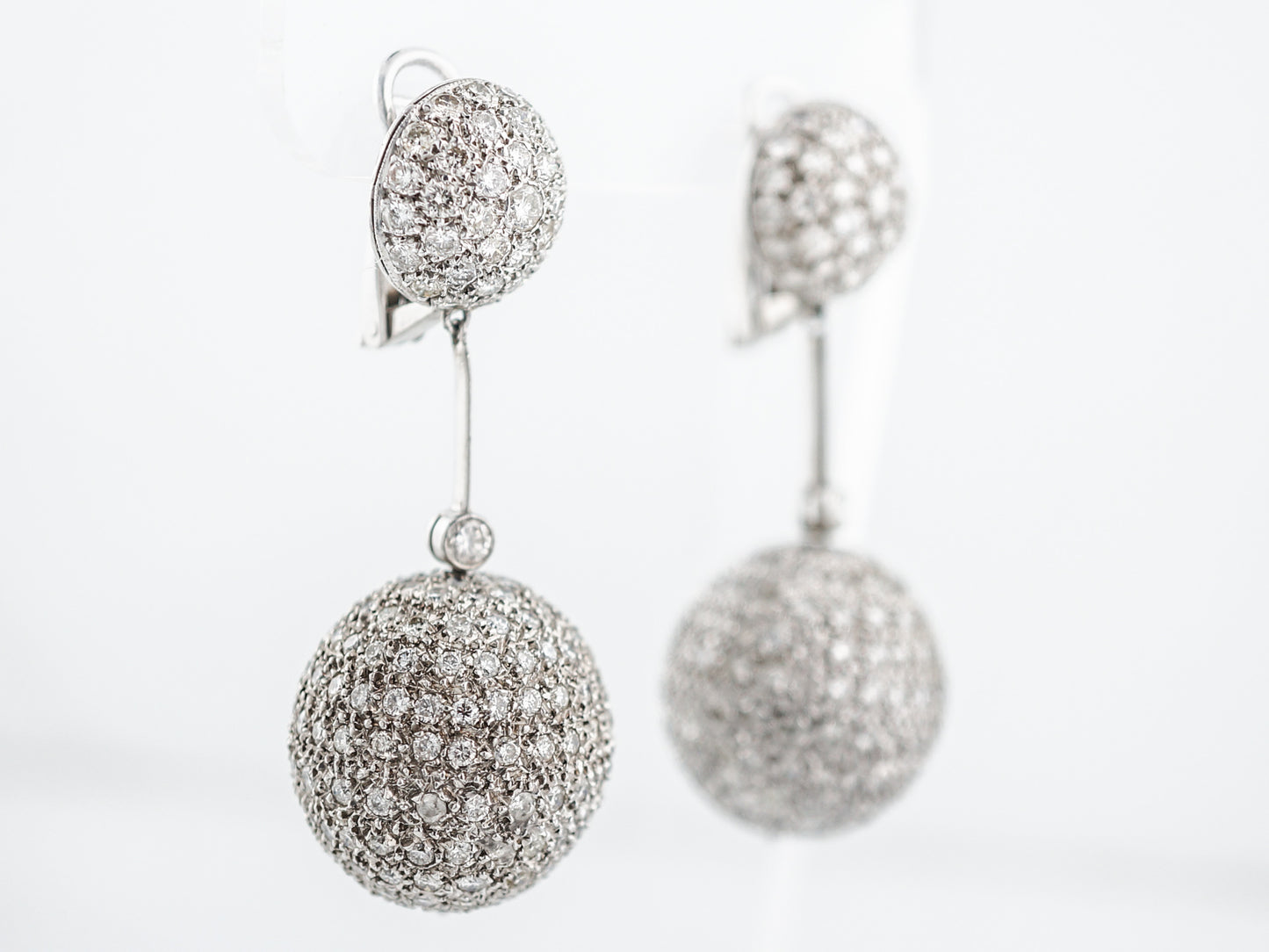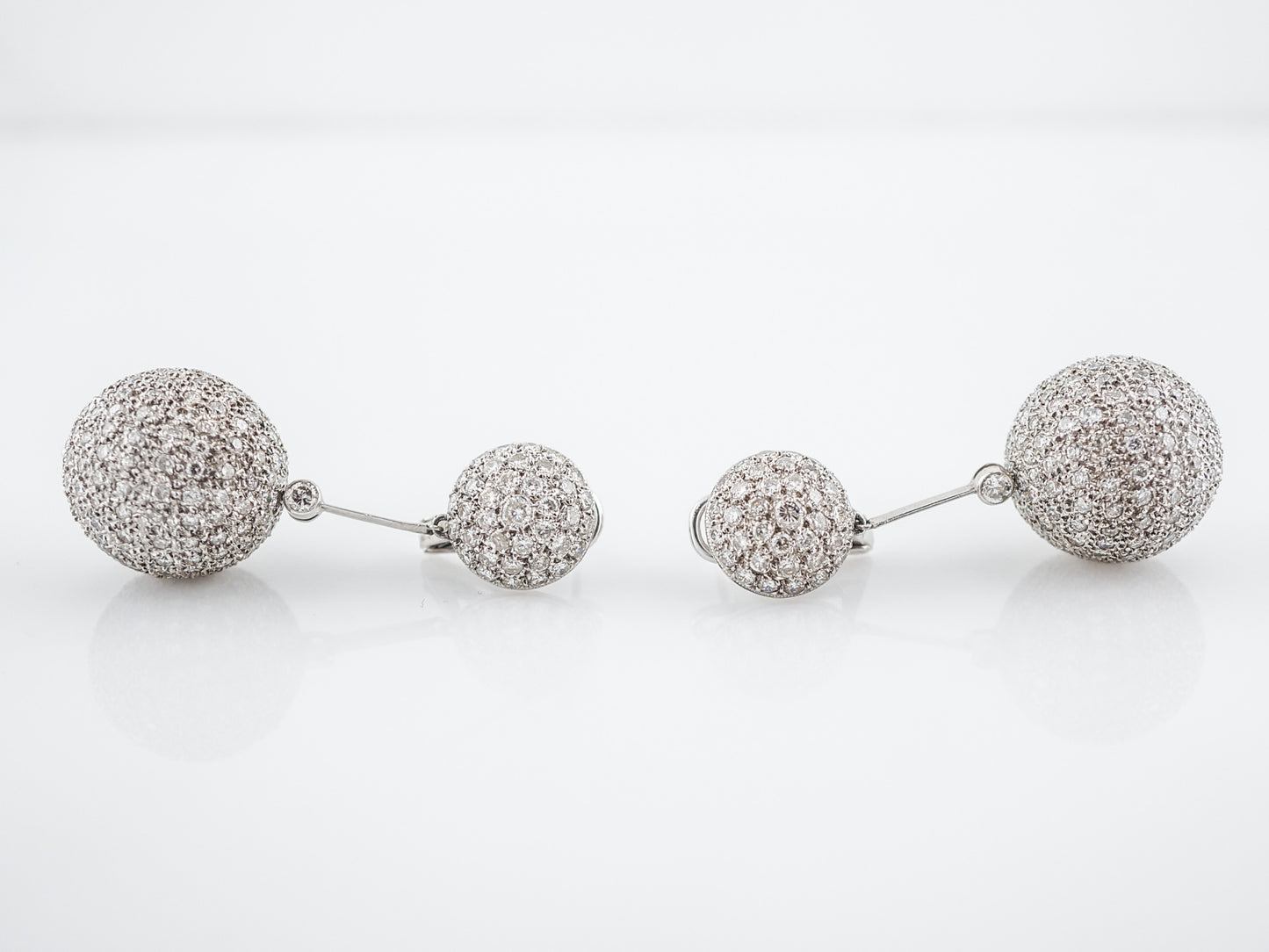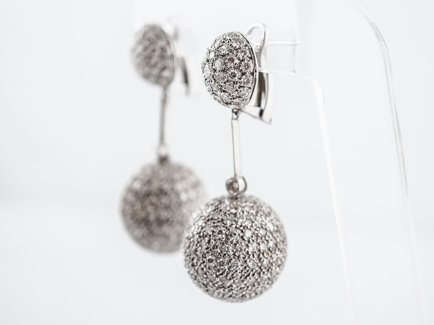 These Modern diamond earrings are show stoppers. These beauties have a pave diamond circular post connected to a rod of white gold that leads to a bezel set diamond sitting atop a pave diamond sphere. These 18k white gold earrings are covered in a total of 10.82 carats of round brilliant diamonds. These post earrings are two inches in length. These dazzling drops sparkle from every angle.