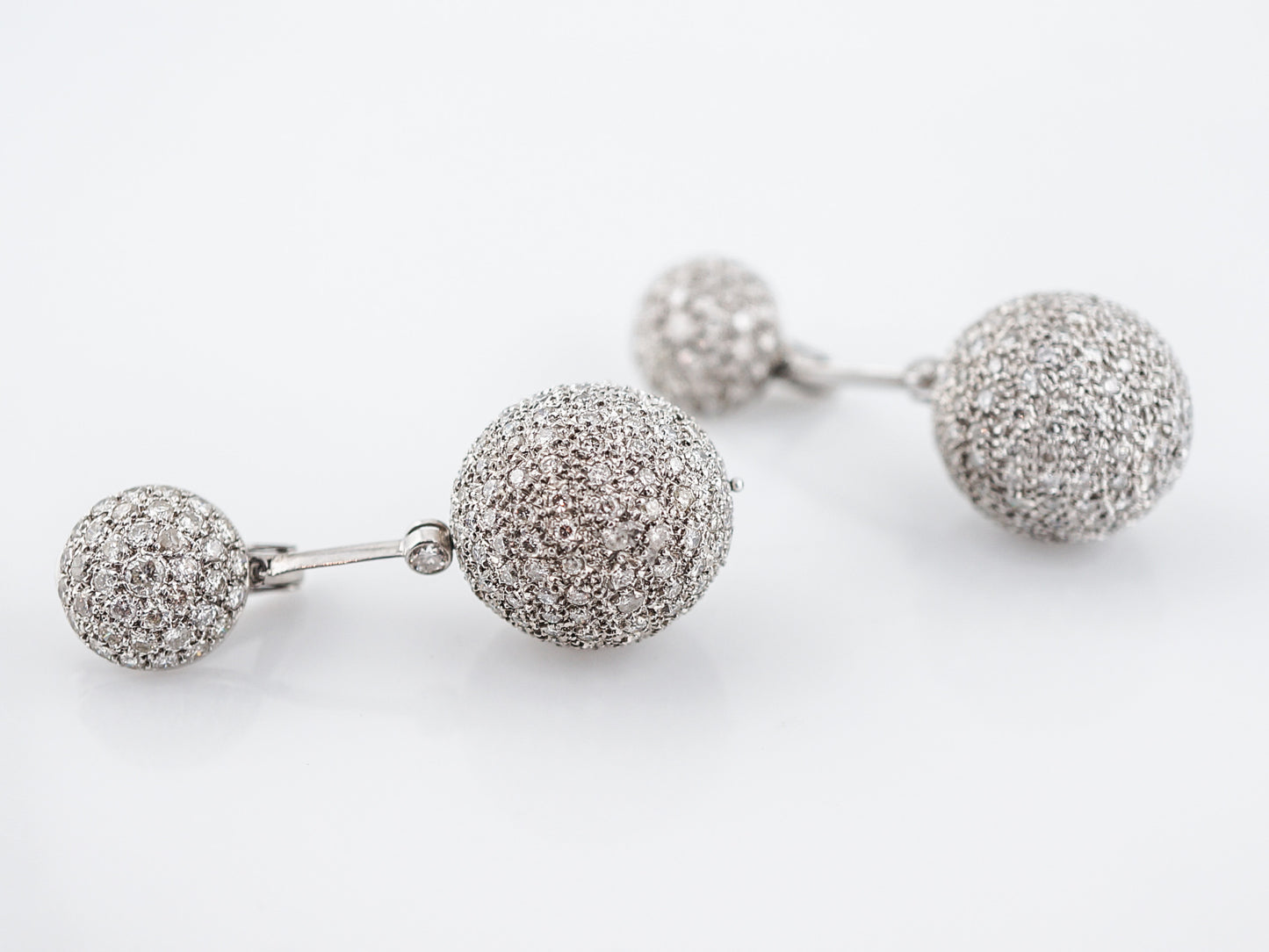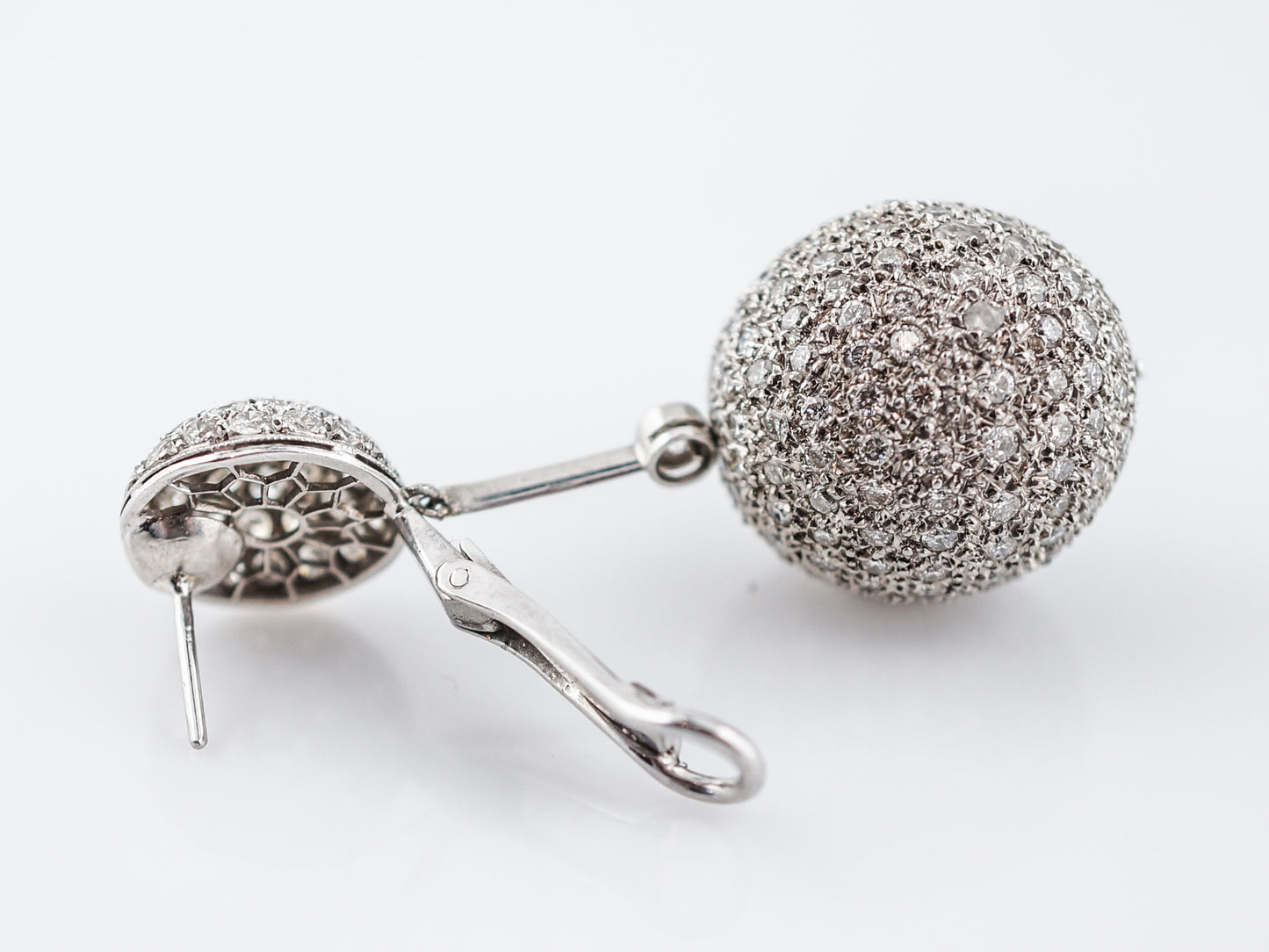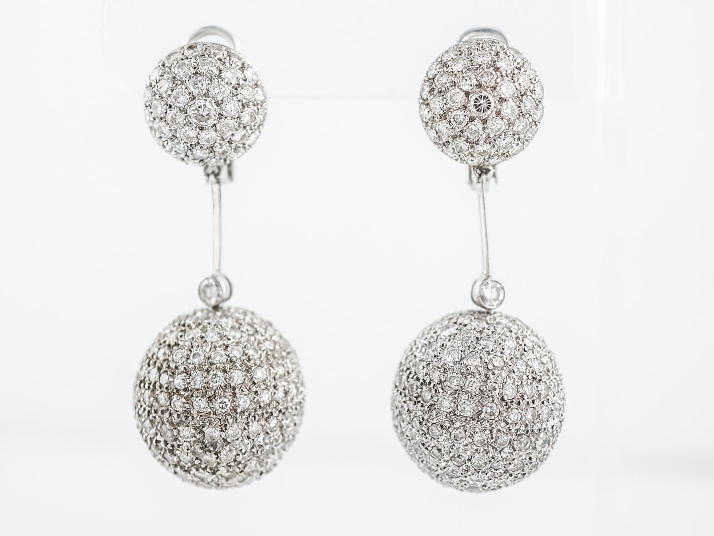 These Modern diamond earrings are show stoppers. These beauties have a pave diamond circular post connected to a rod of white gold that leads to a bezel set diamond sitting atop a pave diamond sphere. These 18k white gold earrings are covered in a total of 10.82 carats of round brilliant diamonds. These post earrings are two inches in length. These dazzling drops sparkle from every angle.