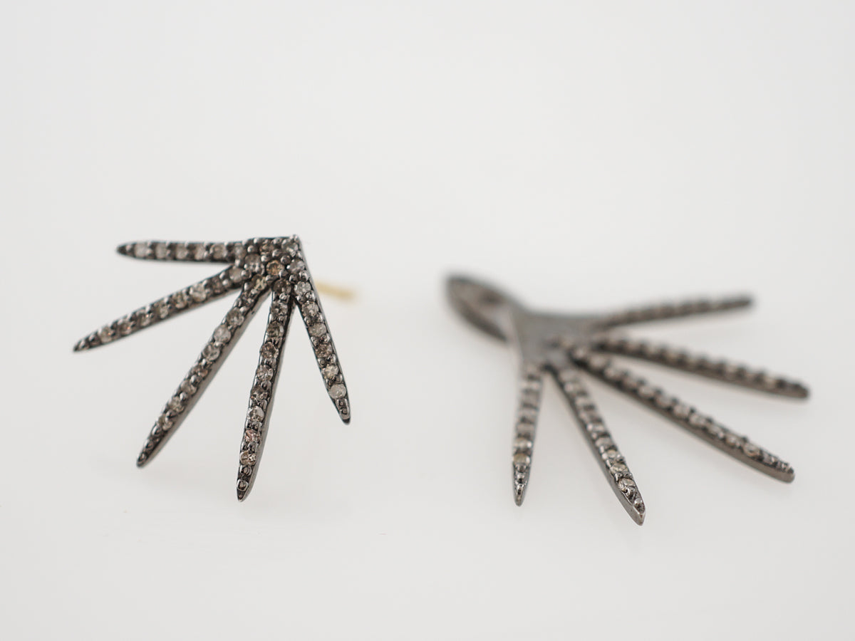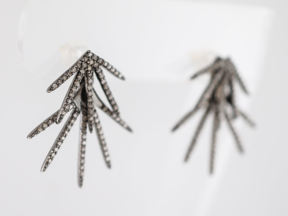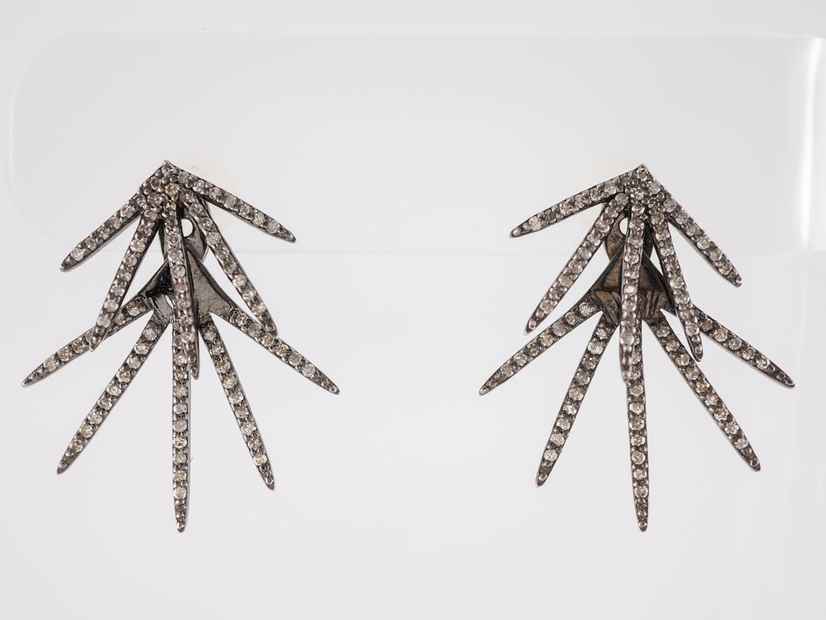 These modern earrings feature a double burst design that comes apart and can be worn together or separately. Finished in sterling silver, the earrings are light weight and easy to wear and the diamonds lend a hint of sparkle that combines to create a unique contrast and an industrial-glam look. The sharp angles are bursting with visual energy!
