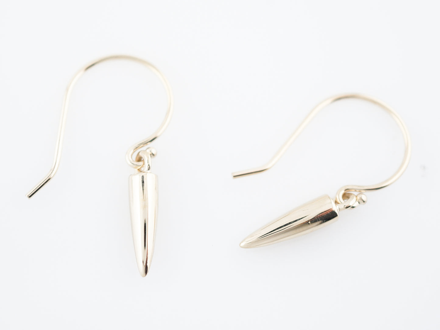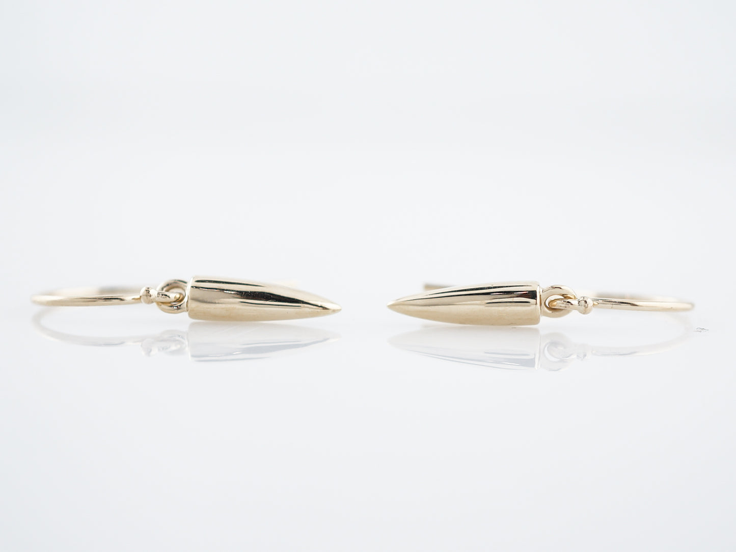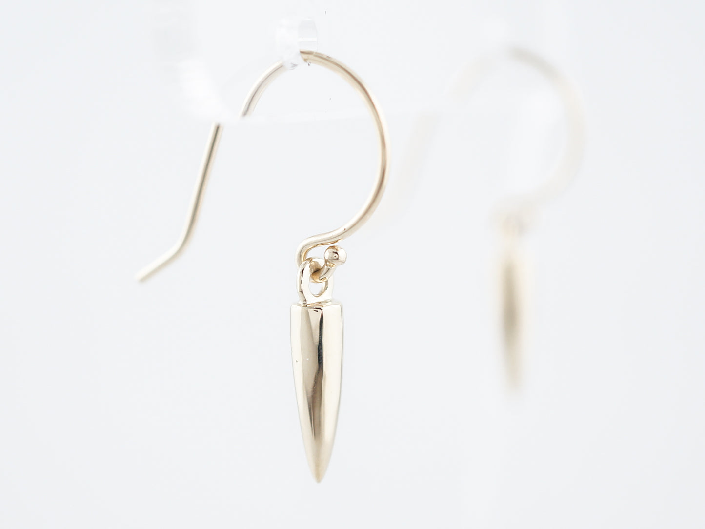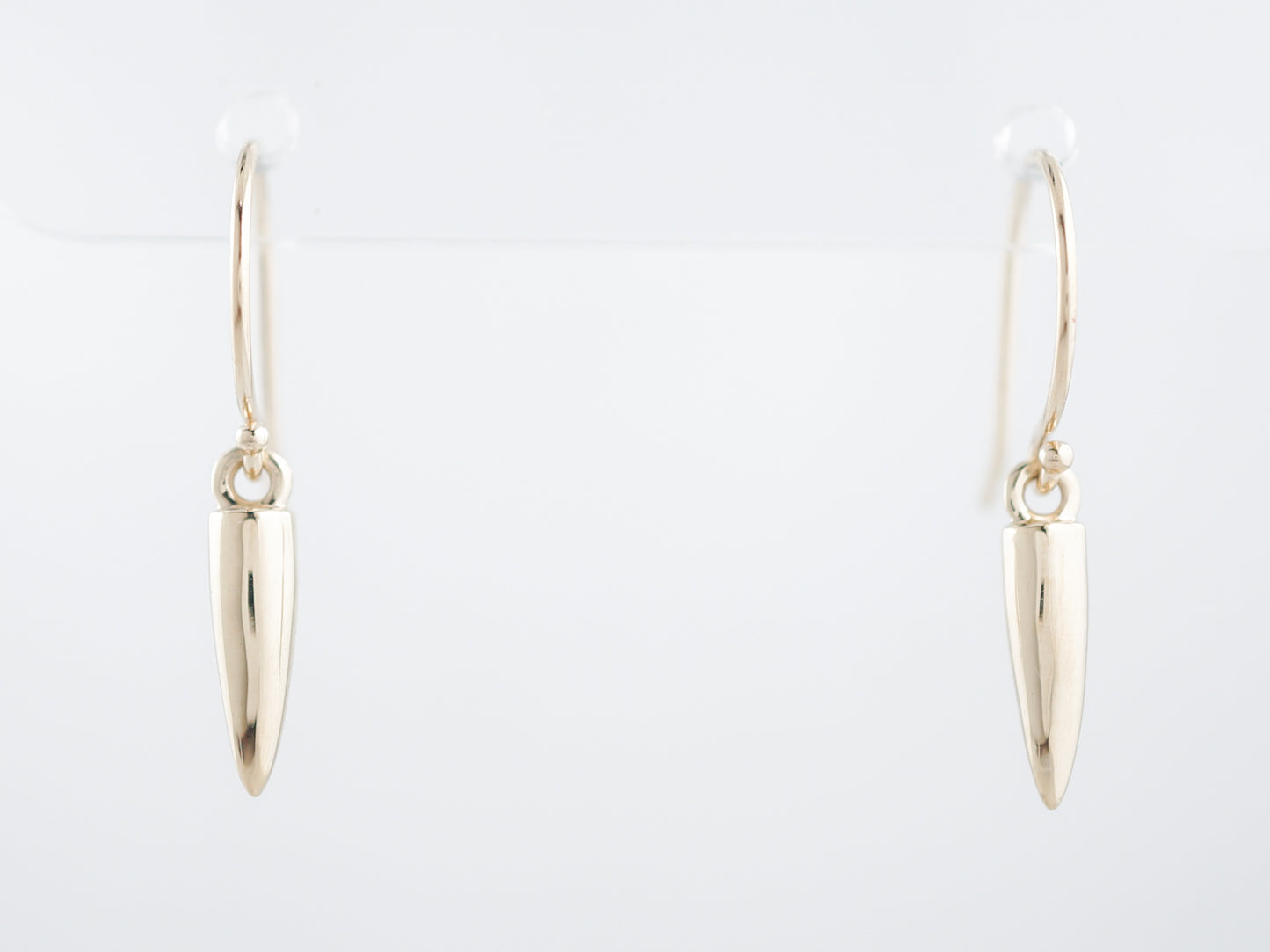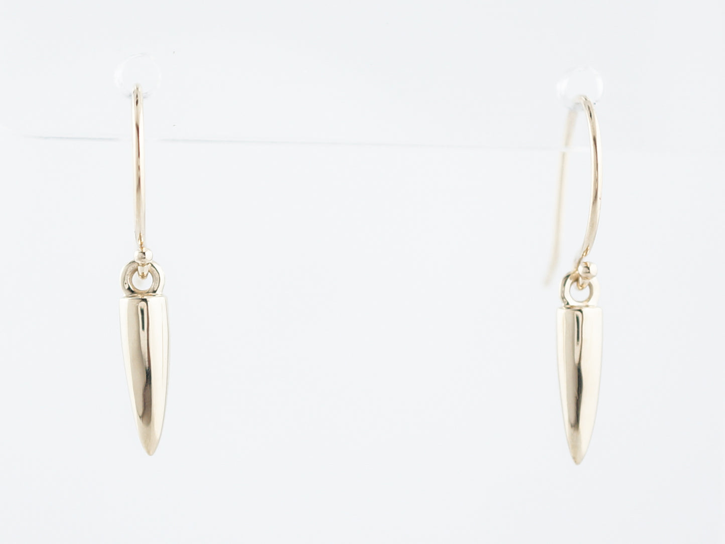 A high polish finish and great movement make these modern era dangle style studs a wonderful piece for everyday wear. Cast in 14 karat yellow gold, these earrings have a fishhook style post and a cylindrical dangle with a pointed end that hangs from the hook. These earrings are wonderful for adding a little bit of luxury into everyday life!