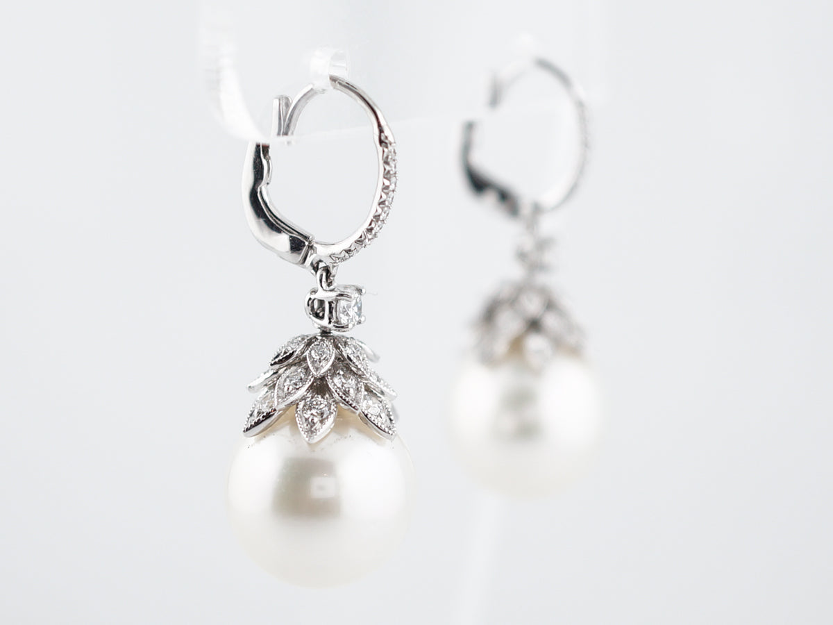 High quality diamonds and pearls always give an aura of refinement and sophistication and these Modern platinum earrings are no exception. This pair features tiny diamonds covering the front of the ear hook and the pearl is topped with a layers of diamonds set into leaf shapes. The leaves together with the round pearl remind us of a bud just about to flower. These regal looking platinum earrings boast a total of 1.34 carat of sparkling round brilliant cut diamonds.