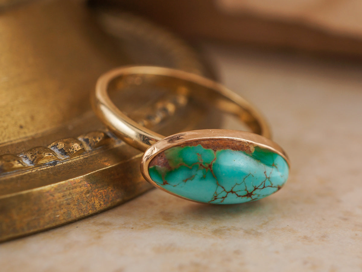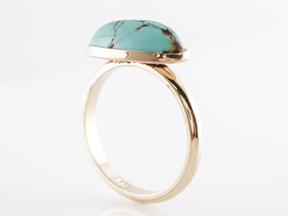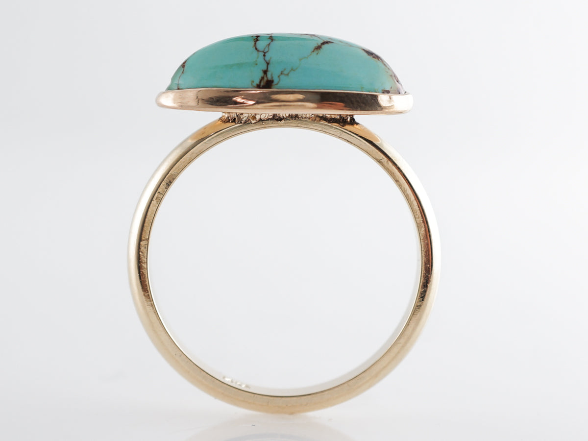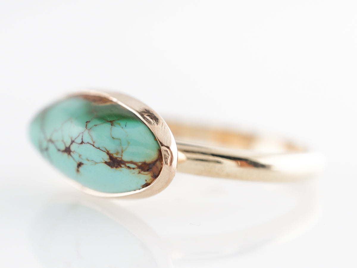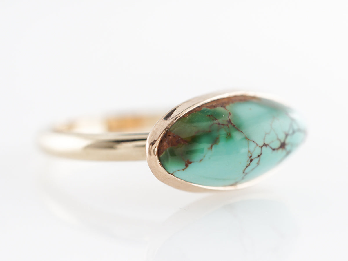 East/West Cabochon Turquoise Cocktail Ring 14k. This modern cocktail ring features a 3.00 carat cabochon cut turquoise which is bezel set in 14 karat yellow gold. The turquoise contains beautiful amber veins that offset the light blue color and settle in the warm gold mounting.