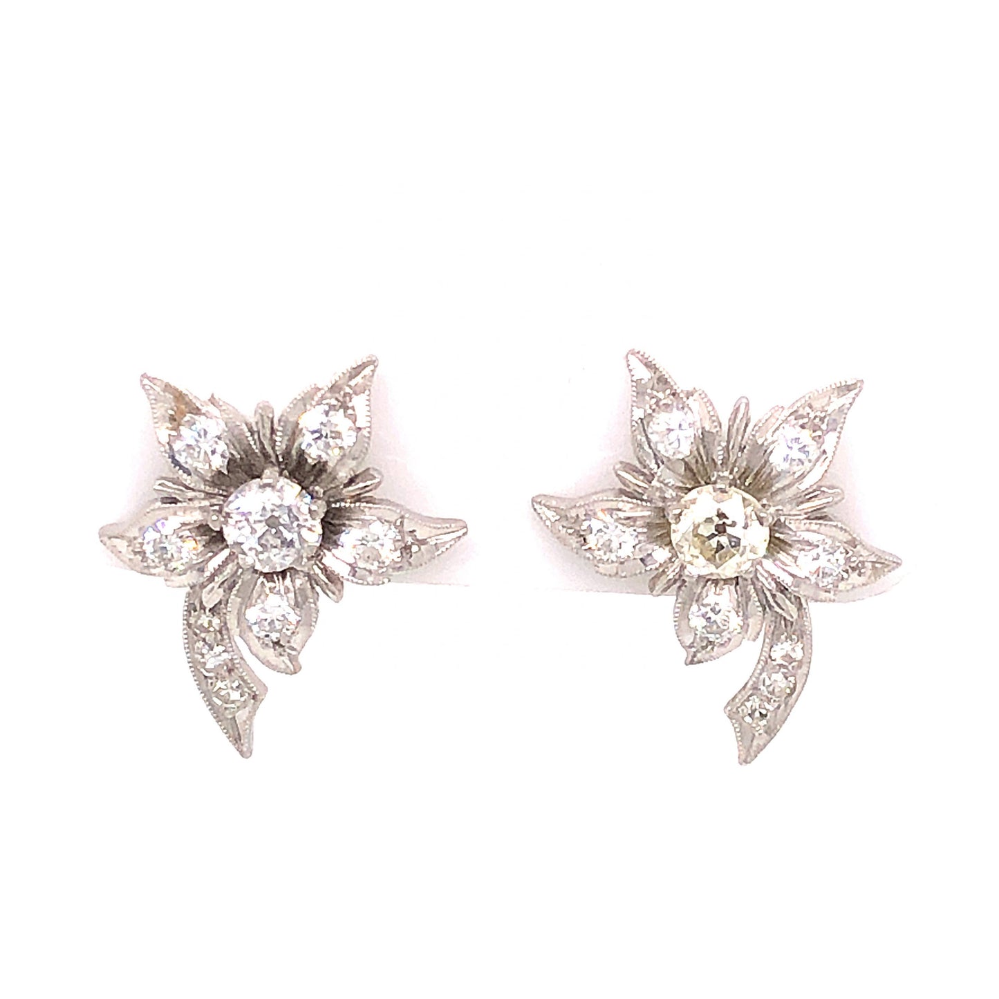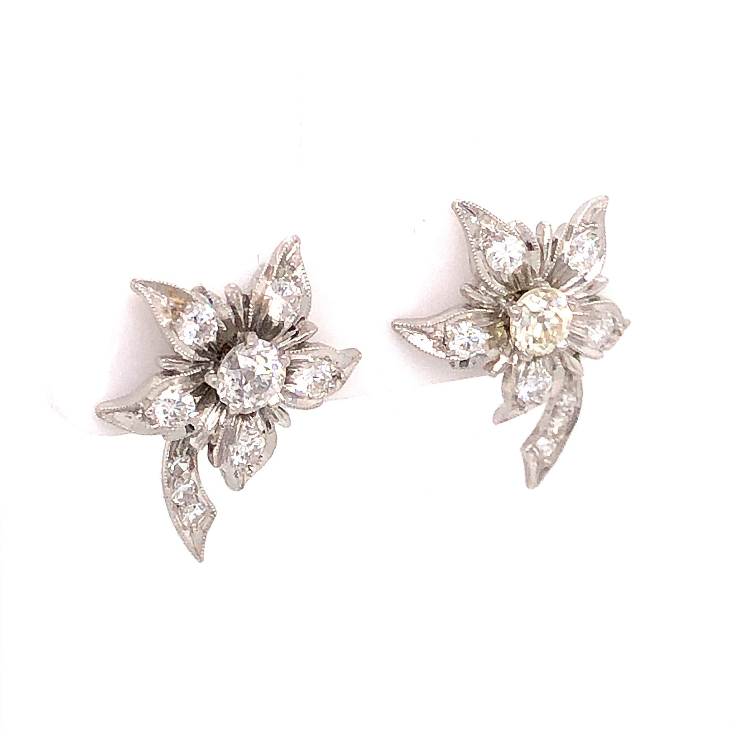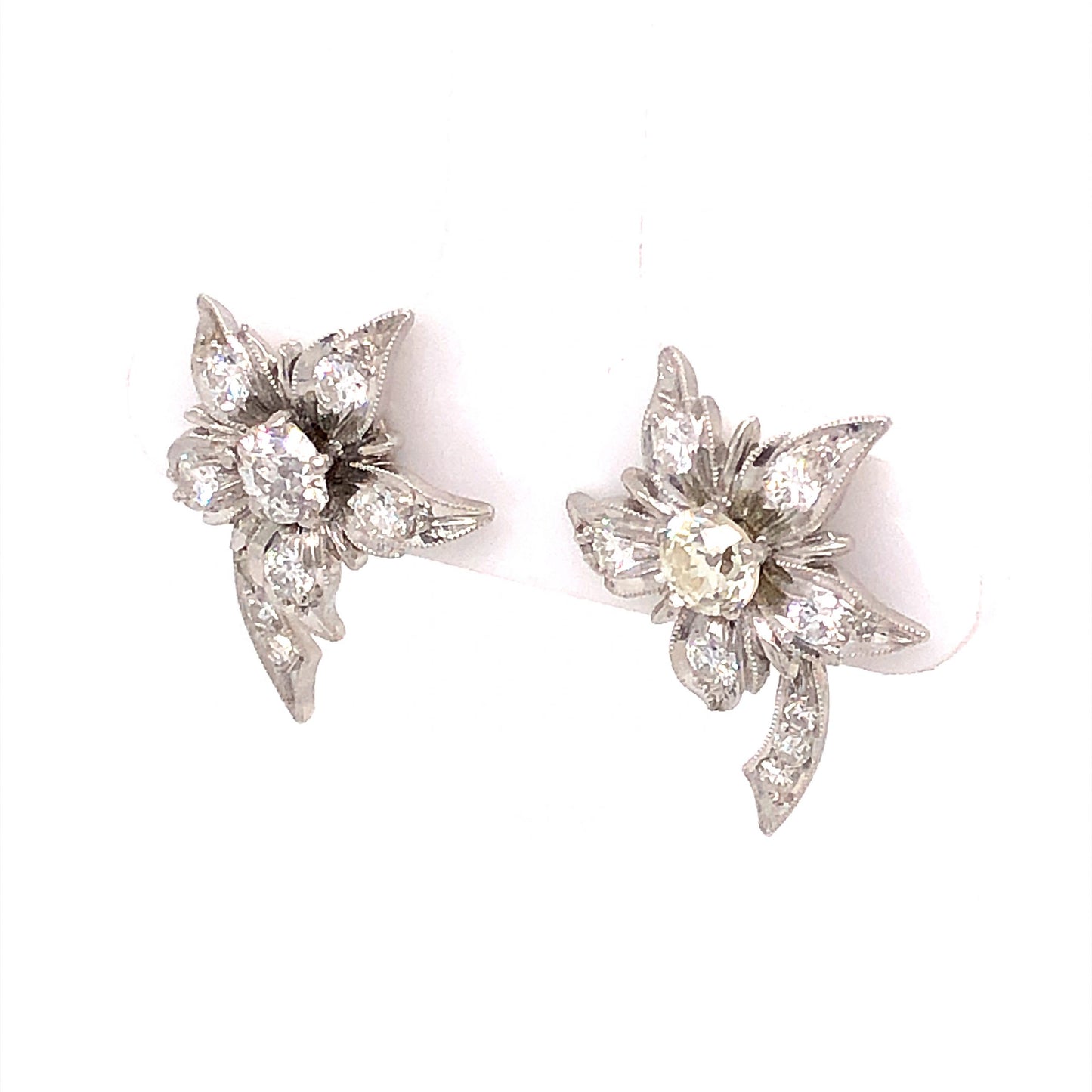 Edward Petri Art Deco Diamond Earrings in Platinum. These Art Deco flower earrings feature .67 carats of diamonds finished in platinum. At the center of the flower shapes, two (2) .17 carat near colorless diamonds are set in platinum prongs. Ten (10) .03 carat Old European cut diamonds decorate the petals of the flowers. An additional six (6) .005 carat single cut diamonds are mounted on the stems of the flowers. Made by the legendary designers at Edward Petri Jewelers, these custom platinum flower earrings will bring some thoughtful sparkle to your wardrobe!