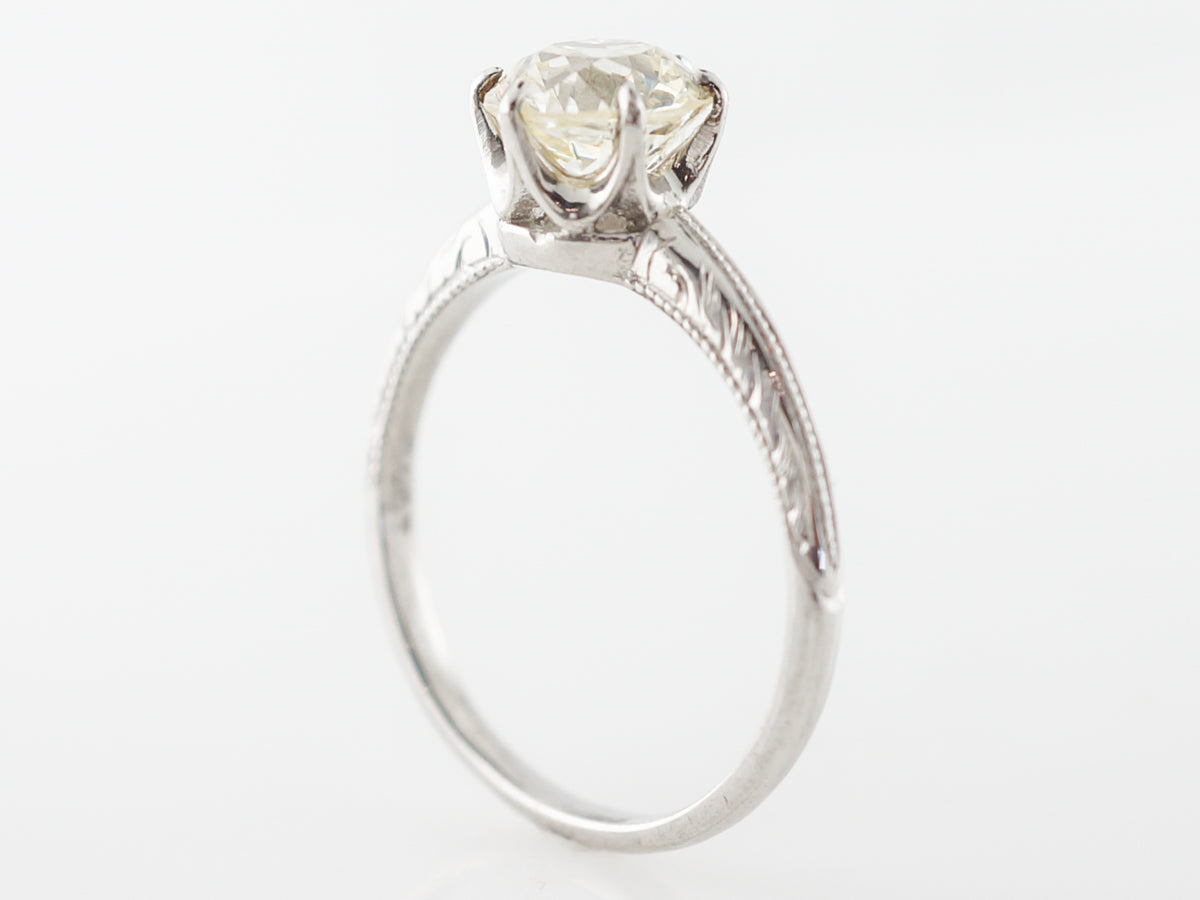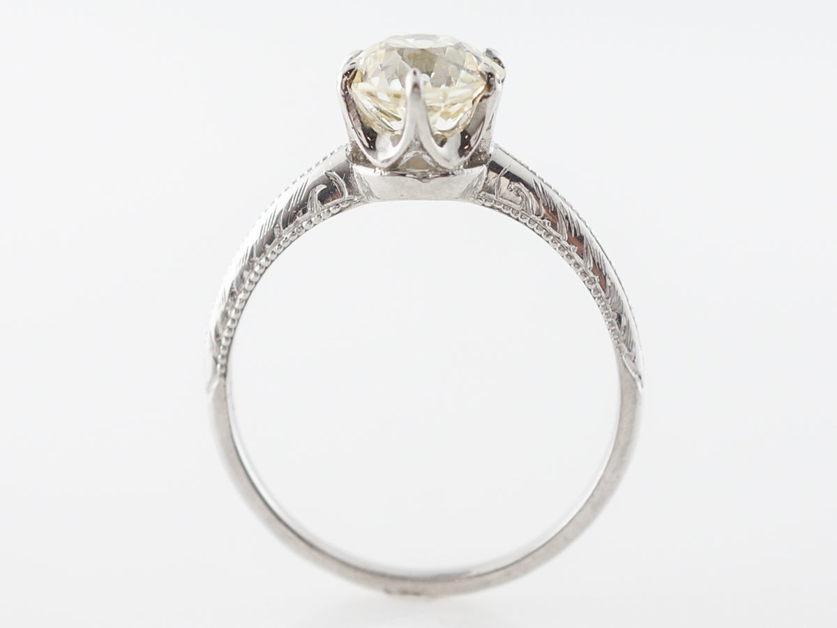 Edwardian Solitaire Diamond Engagement Ring in Platinum. This simple antique engagement ring is from the Edwardian period and features a 1.57 old European cut diamond. The solitaire diamond is held in a crown basket that allows the stone to be in full view for maximum scintillation. The platinum mounting features original engraving on the shoulders of the ring and this solitaire ring is as classic as they come.