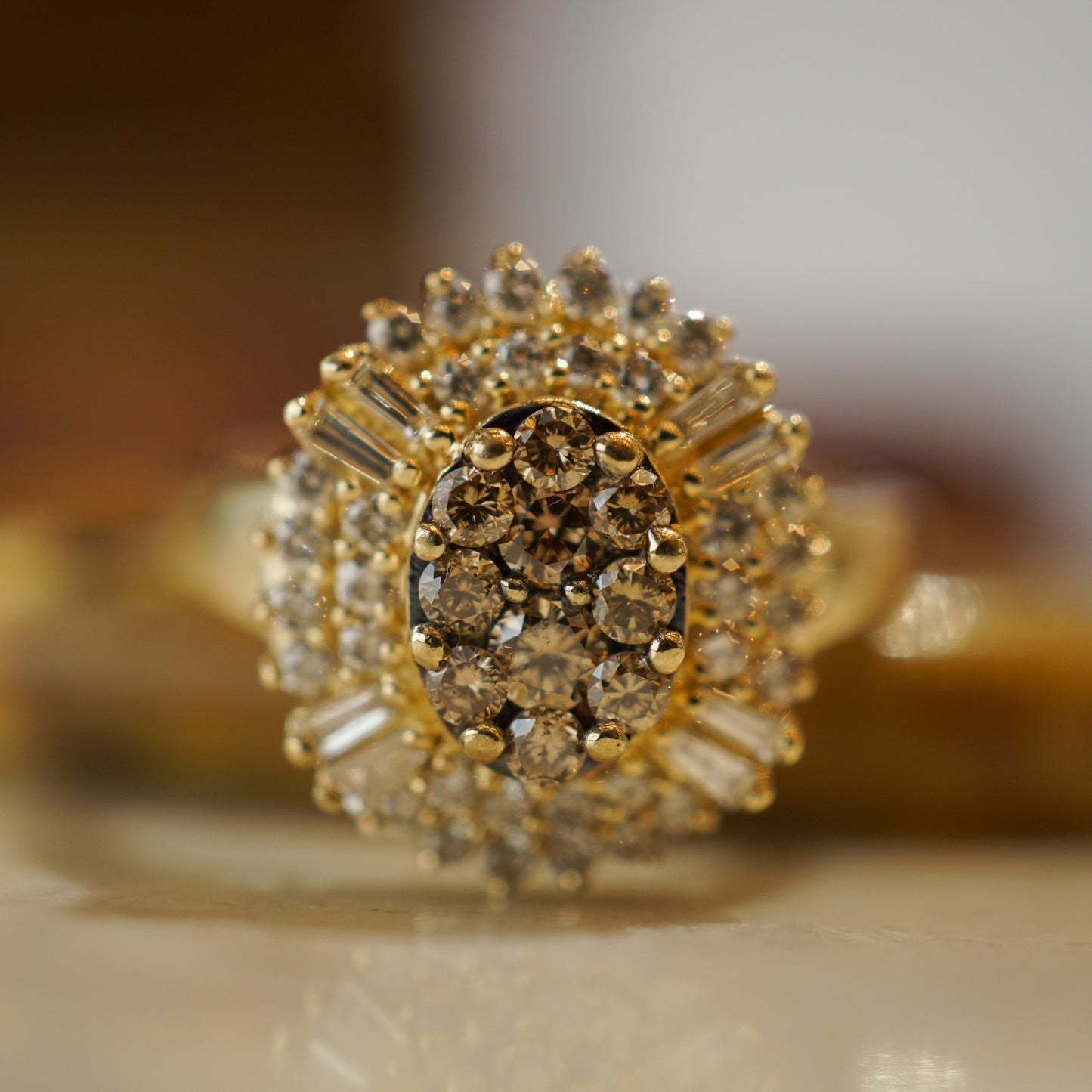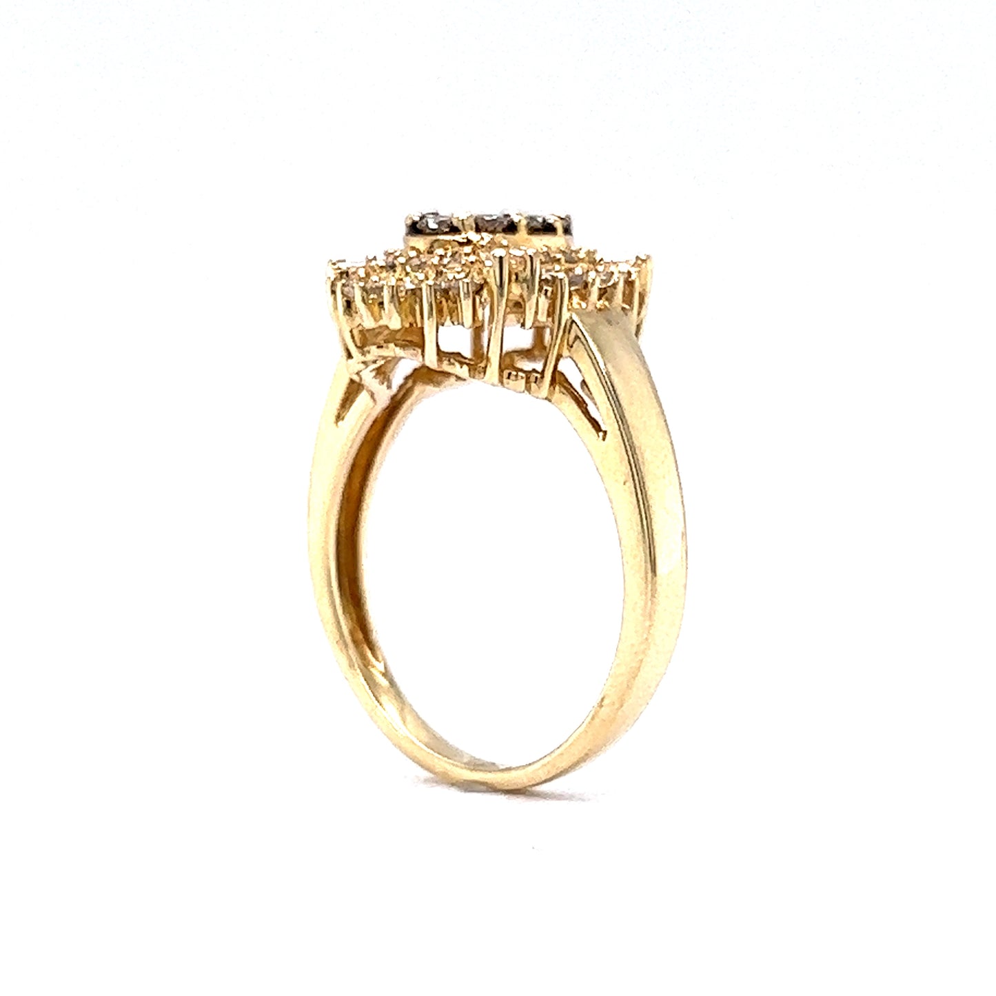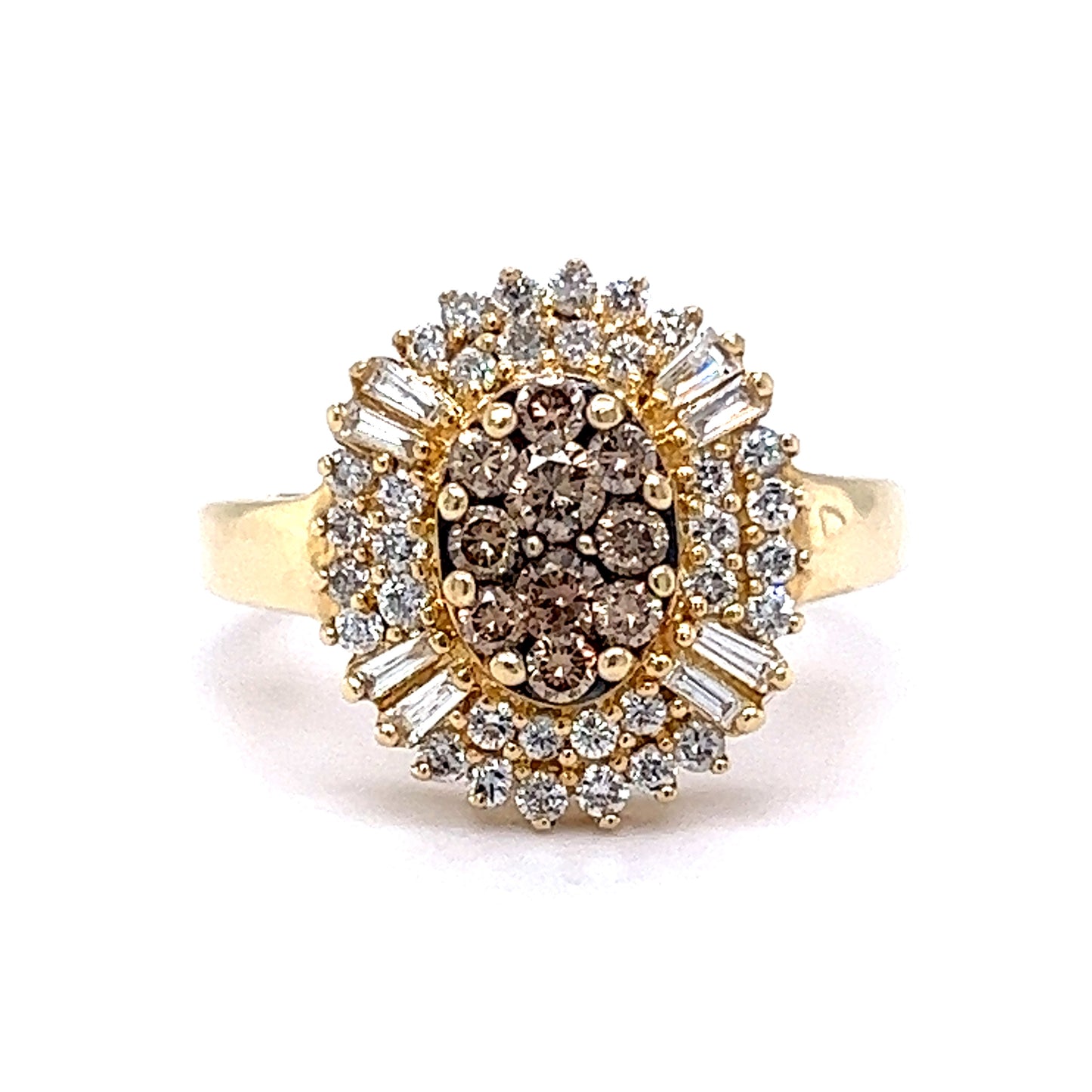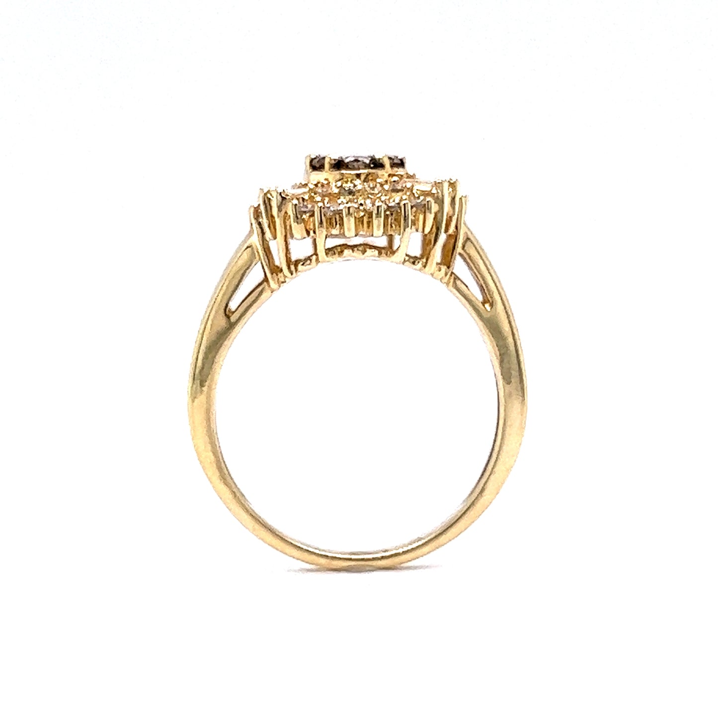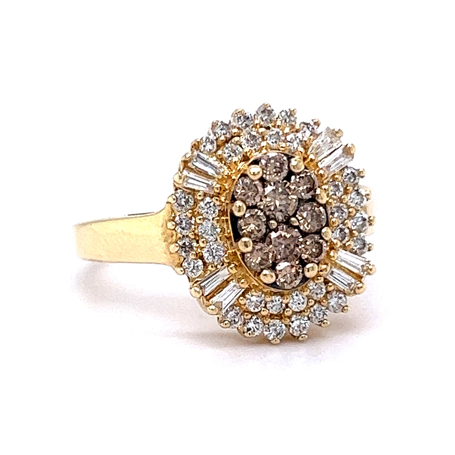 From jewelry legend Effy Hematian, this diamond cluster ring features a sparkly ballerina halo in 14 karat yellow gold. Ten (10) brown diamonds dazzle at the center of the ring. With a toffee brown hue, the diamonds are haloed by eight (8) baguette diamonds and forty (40) round cut diamonds. Glittering, scintillating and full of fire that catches the eye, this ballerina halo ring is an elegant piece of designer jewelry. The 14 karat yellow gold prongs have a smooth and bubbly flair that keeps the diamonds in place. From the profile, a 14K gold crown basket hold the collection of diamonds.