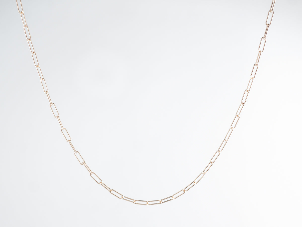 Elongated Flat Link Chain 18 Inches 14k Yellow Gold. This elongated link chain necklace measures 18 inches in 14 karat yellow gold. A chain like this is a beautiful way to hold your favorite charm or pendant. Wear it alone or layered with a few others!