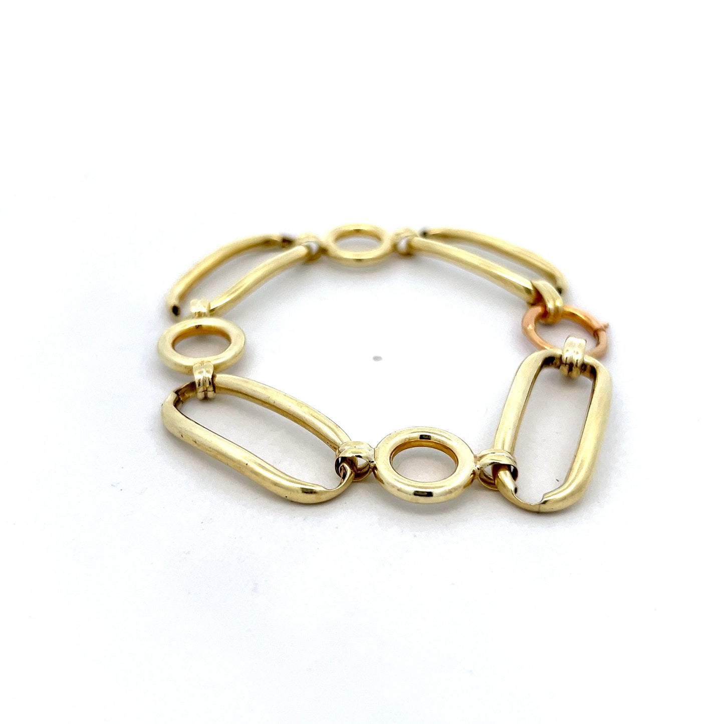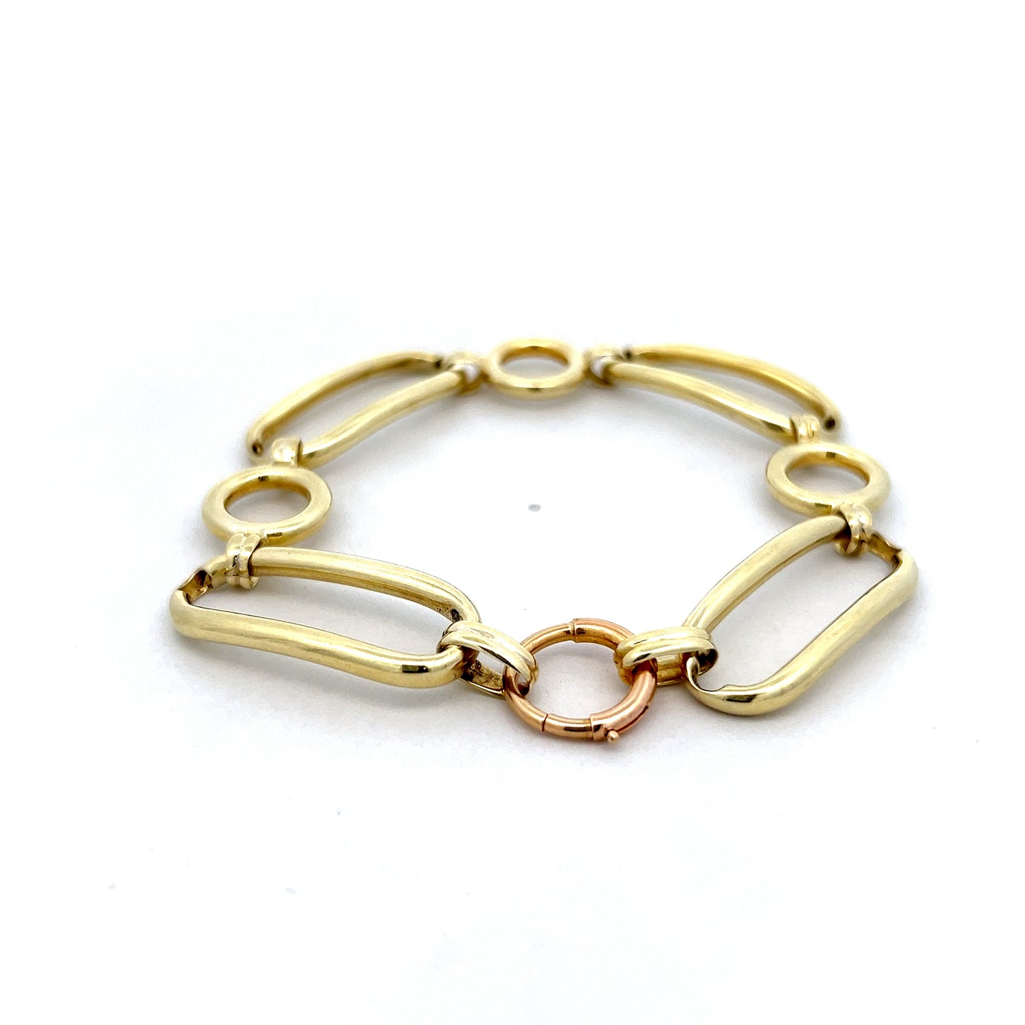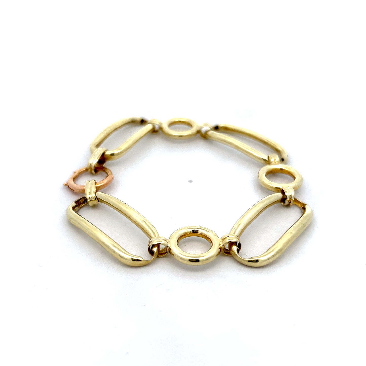 This modern chain bracelet features alternating elongated oval and circular links made from 14 karat yellow gold. The hollow link design creates interesting light and shadow effects while keeping the piece lightweight. At 8 inches long, the bracelet fits comfortably around most wrists and has a warm gold color that works with many outfits.