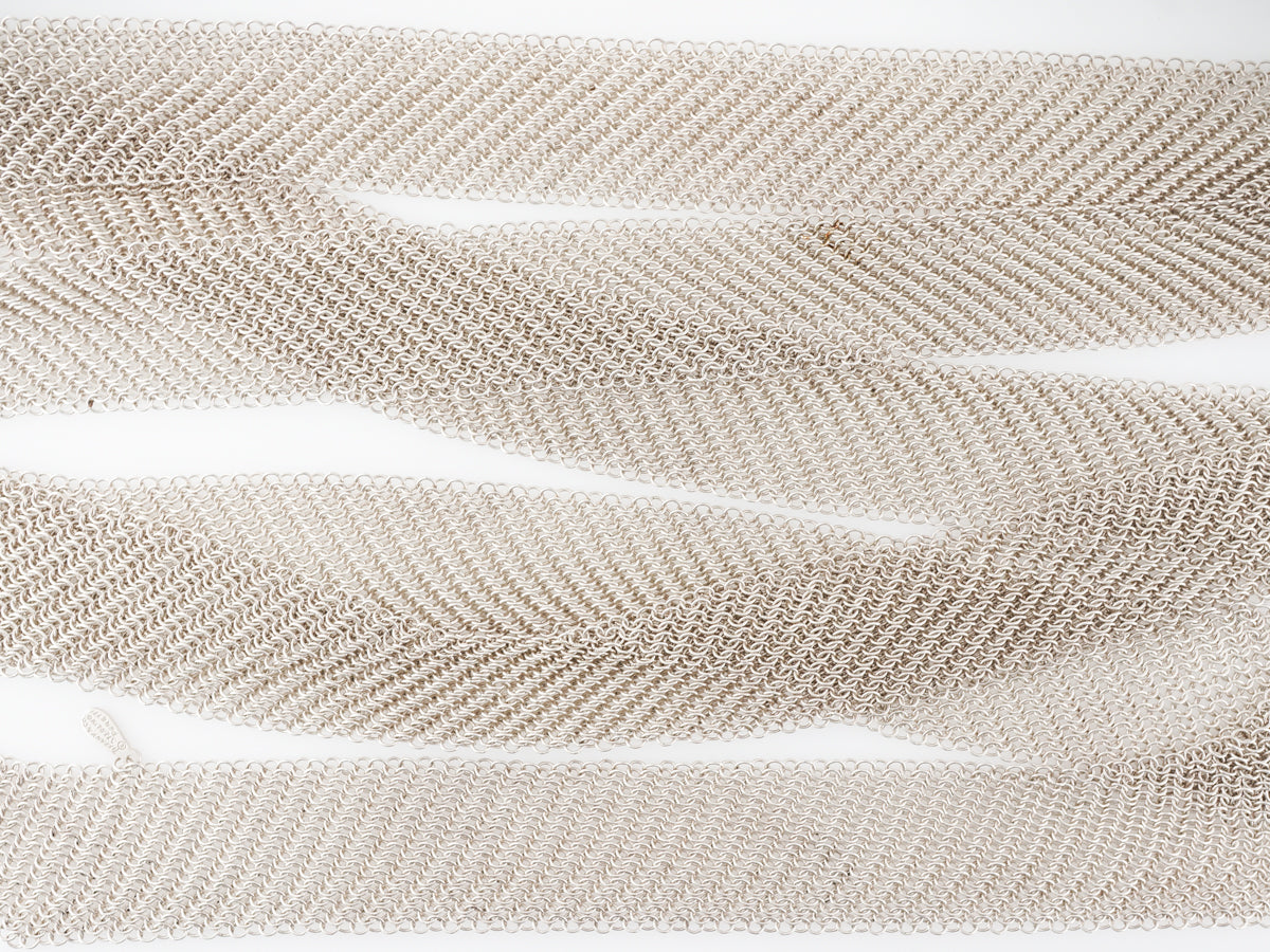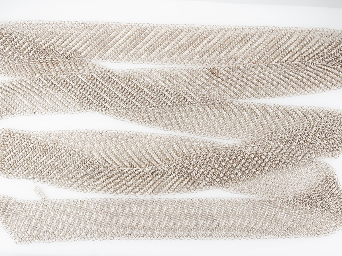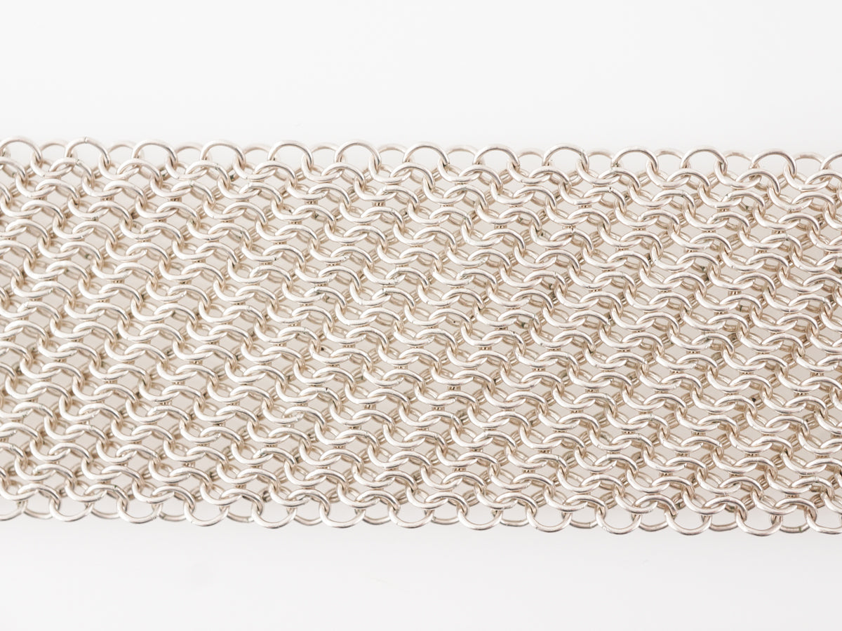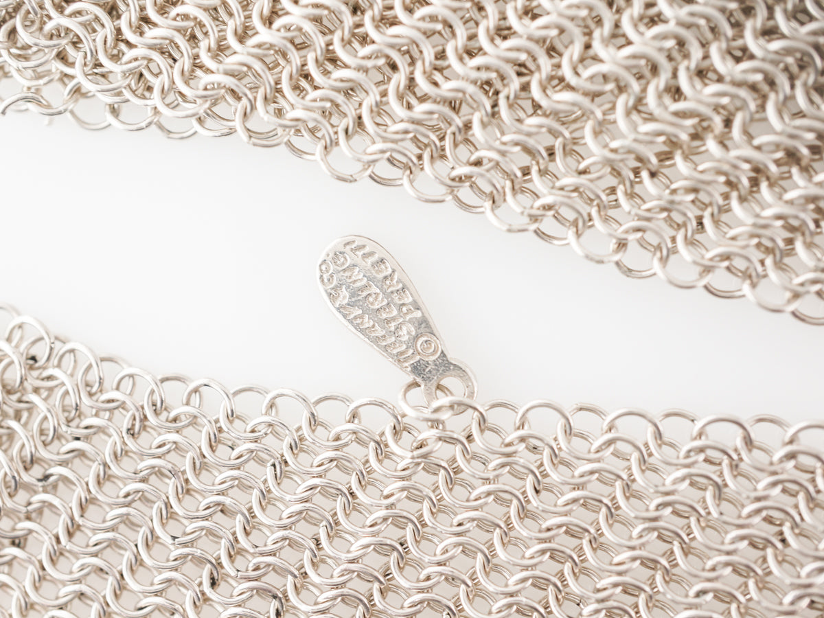 Elsa Peretti 48 inch Woven Chain Necklace in Sterling Silver. This fine sterling silver necklace was designed by Elsa Peretti for Tiffany Co. and is simply darling. The incredible silky weave of the silver links shimmer in their bright white hue. The necklace measures 48 inches and would be a terrific statement piece with some fine evening wear.