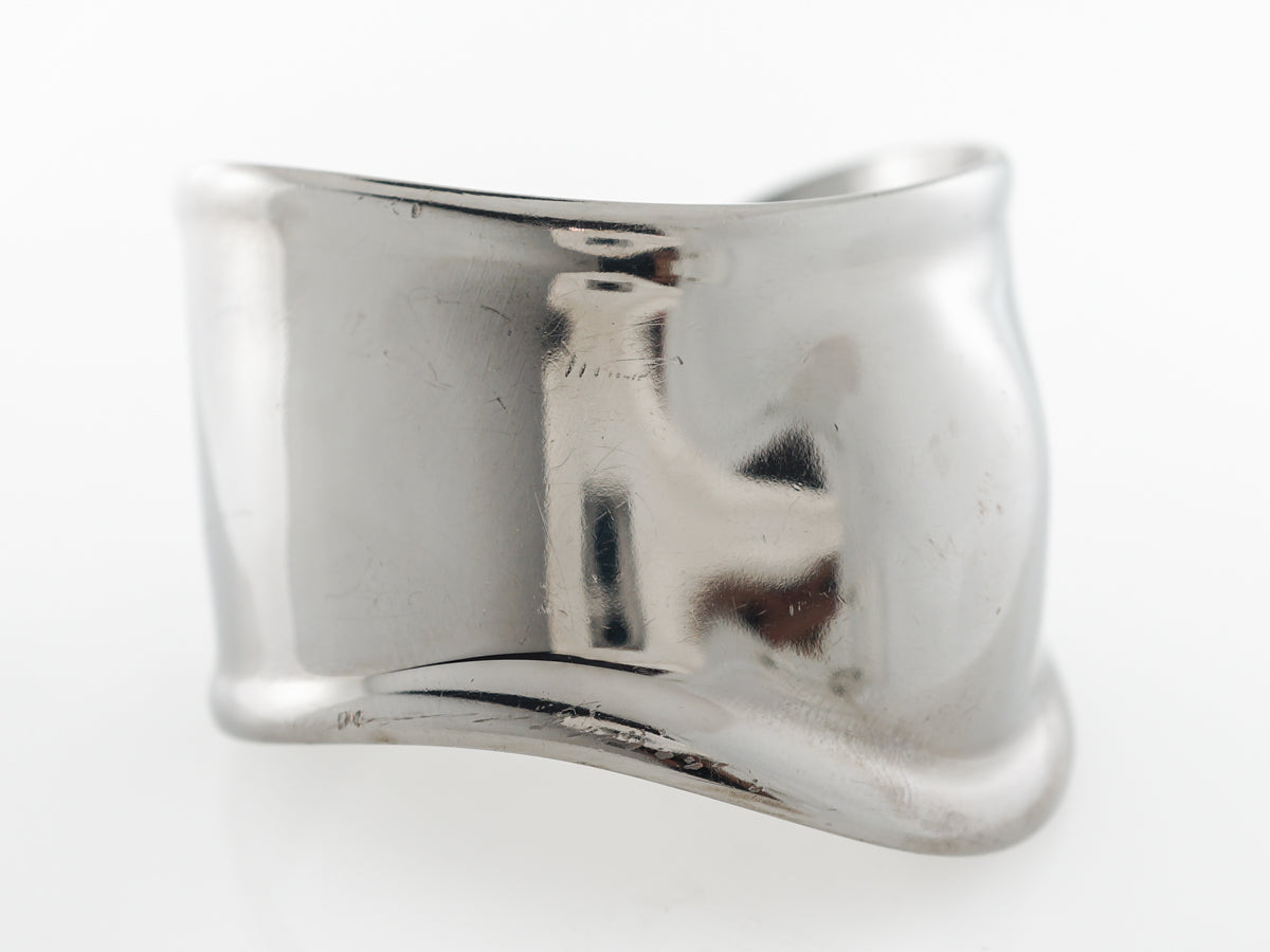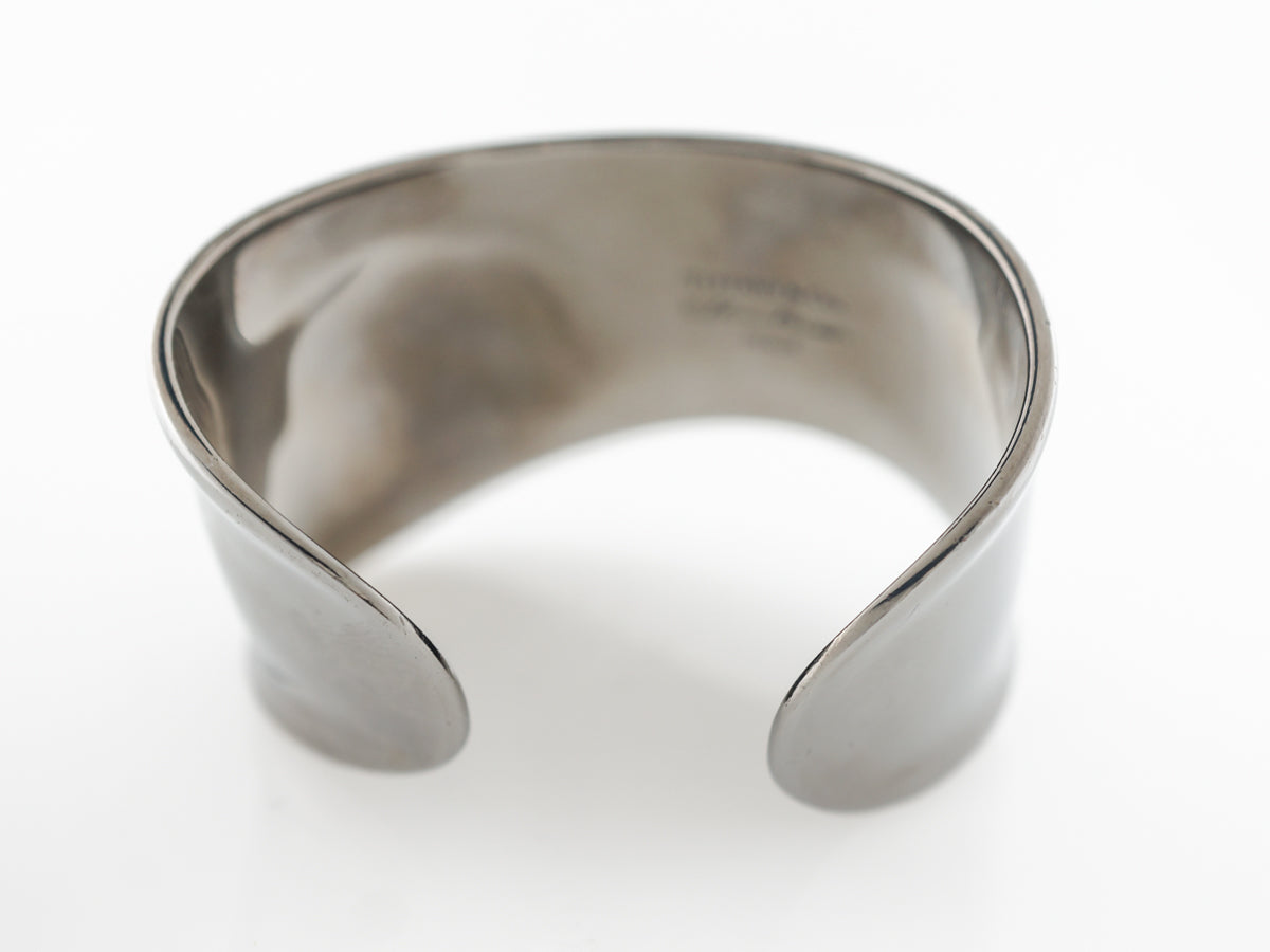 Elsa Peretti Bracelet Tiffany Co in Plated Copper. This darling cuff bracelet made by Tiffany Co and designed by Elsa Peretti is finished in plated copper. This is a size small in Tiffany bracelets (134-146mm) and is simple and curving with the edges slightly flaring up. A beautiful strong, dark metal with a terrific bright polish at the same time!