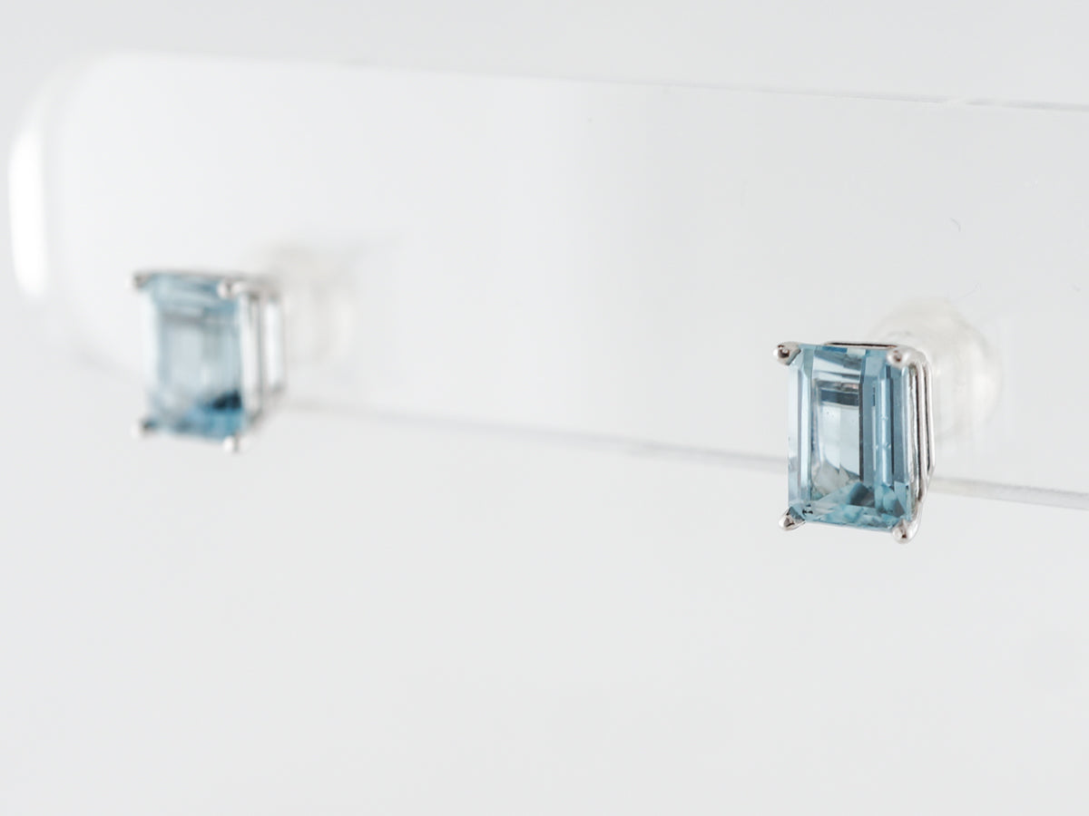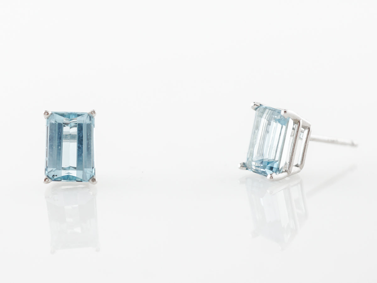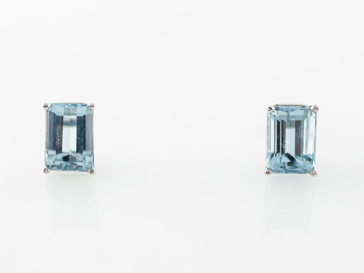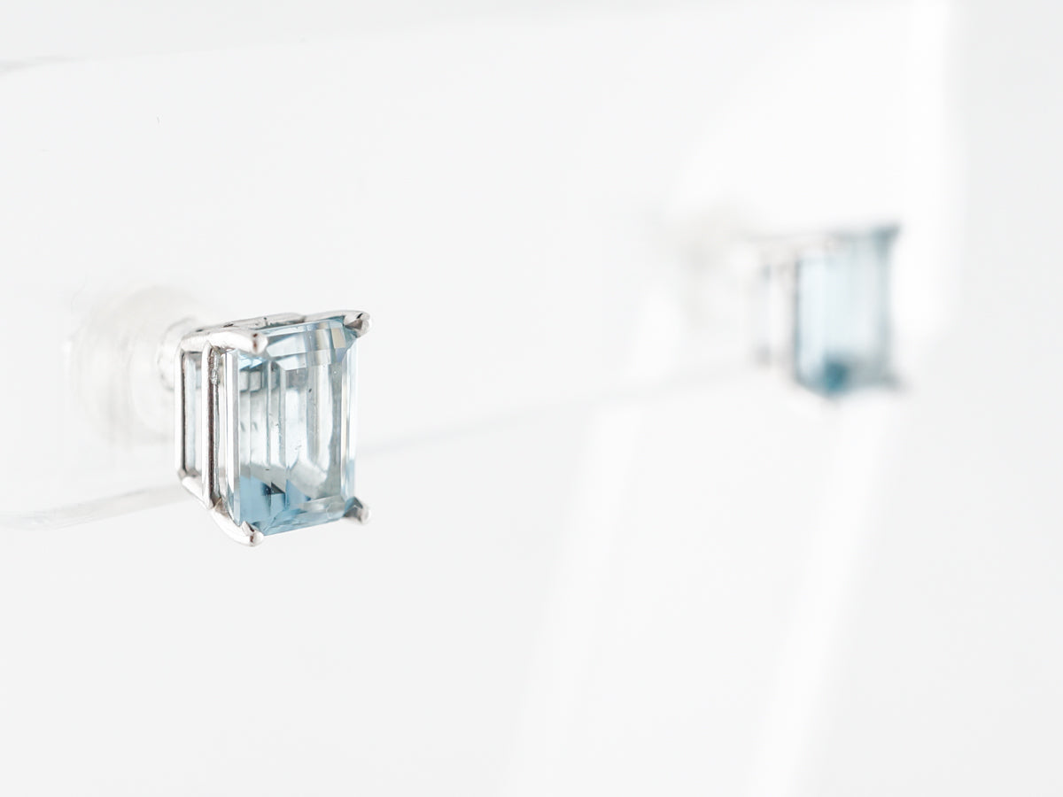 Emerald Cut Aquamarine Earring Studs in White Gold. These emerald cut aquamarine studs are a beautiful way to add color in a classy, elegant way. Finished in 14 karat white gold, these gorgeous studs feature 1.76 carats of aquamarine. These would be excellent for daily wear as well as elegant evening wear.